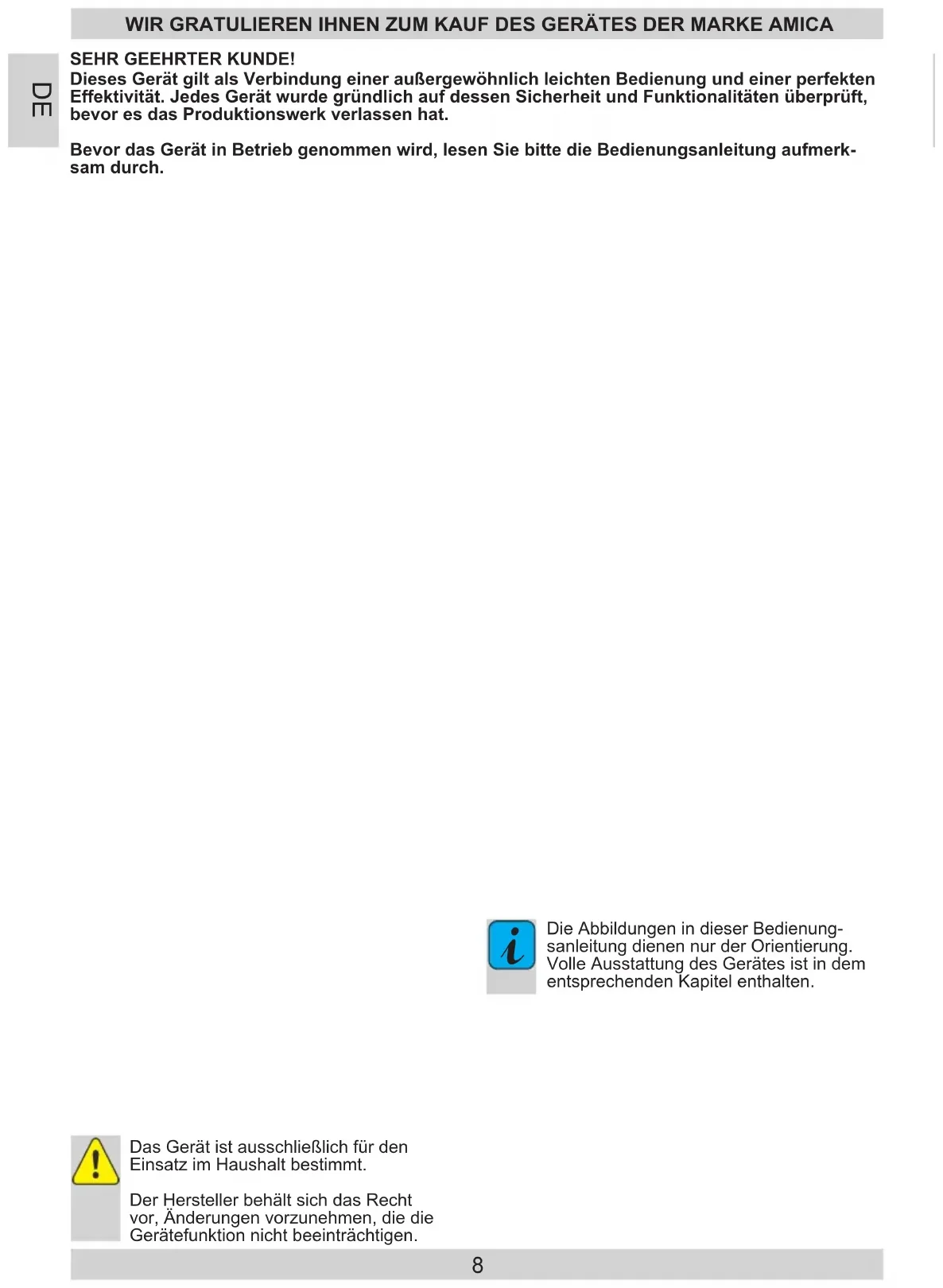 Die Abbildungen in dieser Bedienung- sanleitung dienen nur der Orientierung. Volle Ausstattung des Gerätes ist in dem entsprechenden Kapitel enthalten. Dieses Gerät gilt als Verbindung einer außergewöhnlich leichten Bedienung und einer perfekten Effektivität. Jedes Gerät wurde gründlich auf dessen Sicherheit und Funktionalitäten überprüft, bevor es das Produktionswerk verlassen hat. Bevor das Gerät in Betrieb genommen wird, lesen Sie bitte die Bedienungsanleitung aufmerk- sam durch. SEHR GEEHRTER KUNDE! WIR GRATULIEREN IHNEN ZUM KAUF DES GERÄTES DER MARKE AMICA DE9 SICHERHEITSHINWEISE