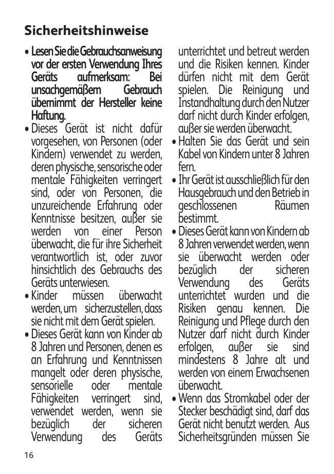 unterrichtet und betreut werden und die Risiken kennen. Kinder dürfen nicht mit dem Gerät spielen. Die Reinigung und Instandhaltung durch den Nutzer darf nicht durch Kinder erfolgen, außer sie werden überwacht. • Halten Sie das Gerät und sein Kabel von Kindern unter 8 Jahren fern. • Ihr Gerät ist ausschließlich für den Hausgebrauch und den Betrieb in geschlossenen Räumen bestimmt. • Dieses Gerät kann von Kindern ab 8 Jahren verwendet werden, wenn sie überwacht werden oder bezüglich der sicheren Verwendung des Geräts unterrichtet wurden und die Risiken genau kennen. Die Reinigung und Pflege durch den Nutzer darf nicht durch Kinder erfolgen, außer sie sind mindestens 8 Jahre alt und werden von einem Erwachsenen überwacht. • Wenn das Stromkabel oder der Stecker beschädigt sind, darf das Gerät nicht benutzt werden. Aus Sicherheitsgründen müssen Sie