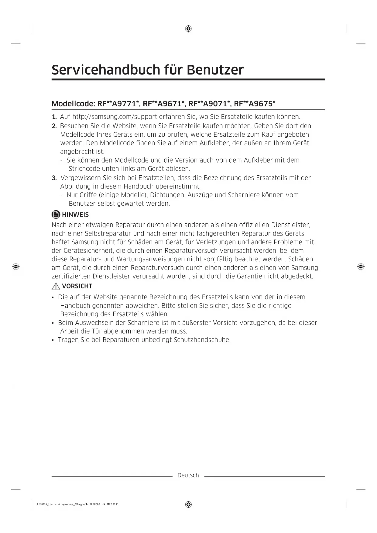 - Tragen Sie bei Reparaturen unbedingt Schutzhandschuhe. RF9000A_User-servicing-manual_26lang.indb 31 2021-01-14 2:03:13Deutsch Das tatsächliche Aussehen und die mitgelieferten Teile der Kühl-/Gefrierkombination können sich je nach Modell und Land unterscheiden.