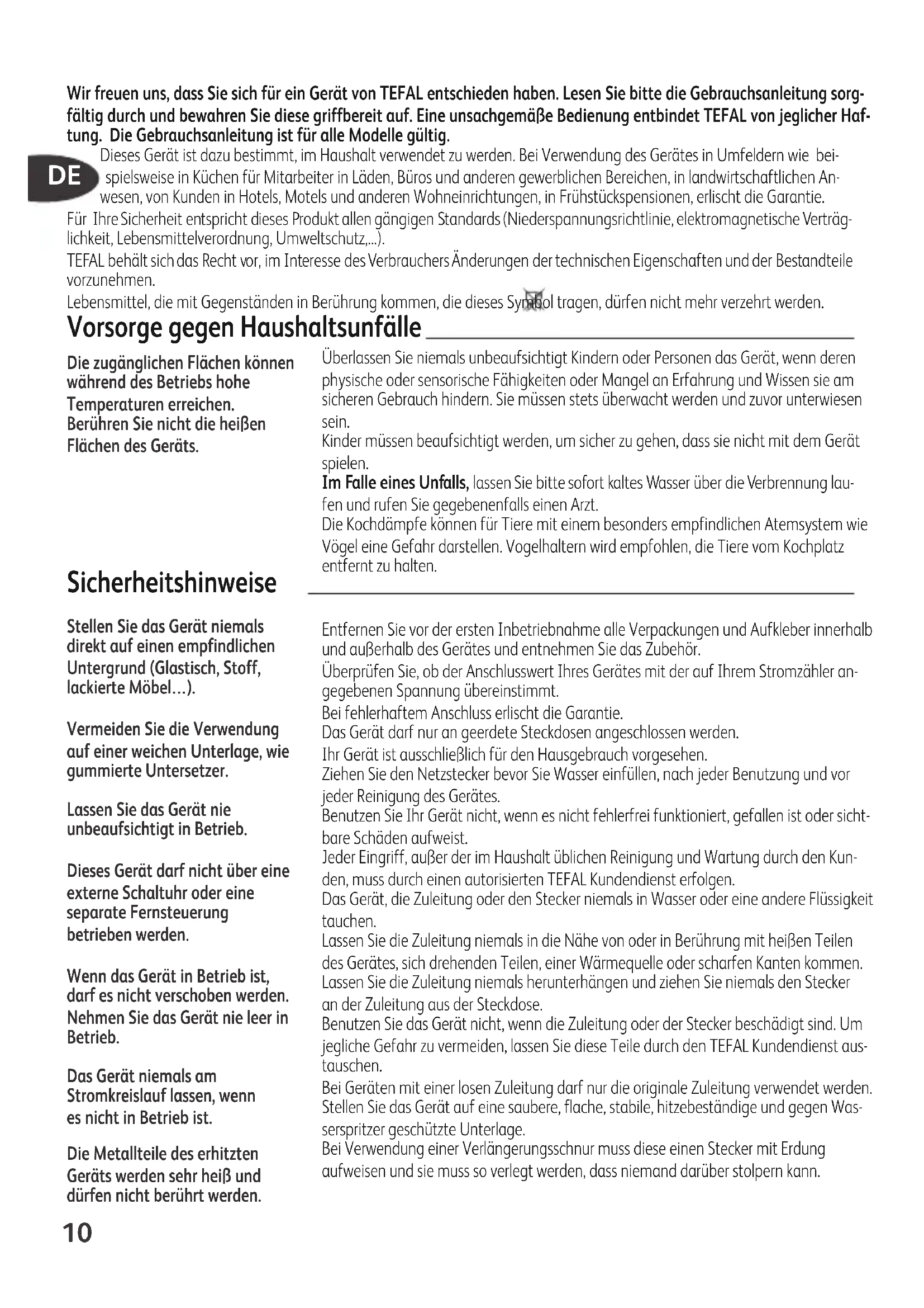 TEF-BBQ-2021620064_TEF-BBQ-2021620064 09/11/10 09:18 Page9Wir freuen uns, dass Sie sich für ein Gerät von TEFAL entschieden haben. Lesen Sie bitte die Gebrauchsanleitung sorg- fältig durch und bewahren Sie diese griffbereit auf. Eine unsachgemäße Bedienung entbindet TEFAL von jeglicher Haf- tung. Die Gebrauchsanleitung ist für alle Modelle gültig. Dieses Gerät ist dazu bestimmt, im Haushalt verwendet zu werden. Bei Verwendung des Gerätes in Umfeldern wie bei- spielsweise in Küchen für Mitarbeiter in Läden, Büros und anderen gewerblichen Bereichen, in landwirtschaftlichen An- wesen, von Kunden in Hotels, Motels und anderen Wohneinrichtungen, in Frühstückspensionen, erlischt die Garantie. Für Ihre Sicherheit entspricht dieses Produkt allen gängigen Standards (Niederspannungsrichtlinie, elektromagnetische Verträg- lichkeit, Lebensmittelverordnung, Umweltschutz,...). TEFAL behält sich das Recht vor, im Interesse des Verbrauchers Änderungen der technischen Eigen schaften und der Bestandteile vorzunehmen. Lebensmittel, die mit Gegenständen in Berührung kommen, die dieses Symbol tragen, dürfen nicht mehr verzehrt werden. Vorsorge gegen Haushaltsunfälle Überlassen Sie niemals unbeaufsichtigt Kindern oder Personen das Gerät, wenn deren physische oder sensorische Fähigkeiten oder Mangel an Erfahrung und Wissen sie am sicheren Gebrauch hindern. Sie müssen stets überwacht werden und zuvor unterwiesen sein. Kinder müssen beaufsichtigt werden, um sicher zu gehen, dass sie nicht mit dem Gerät spielen. Im Falle eines Unfalls, lassen Sie bitte sofort kaltes Wasser über die Verbrennung lau- fen und rufen Sie gegebenenfalls einen Arzt. Die Kochdämpfe können für Tiere mit einem besonders empfindlichen Atemsystem wie Vögel eine Gefahr darstellen. Vogelhaltern wird empfohlen, die Tiere vom Kochplatz entfernt zu halten. Sicherheitshinweise Entfernen Sie vor der ersten Inbetriebnahme alle Verpackungen und Aufkleber innerhalb und außerhalb des Gerätes und entnehmen Sie das Zubehör. Überprüfen Sie, ob der Anschlusswert Ihres Gerätes mit der auf Ihrem Stromzähler an- gegebenen Spannung übereinstimmt. Bei fehlerhaftem Anschluss erlischt die Garantie. Das Gerät darf nur an geerdete Steckdosen angeschlossen werden. Ihr Gerät ist ausschließlich für den Hausgebrauch vorgesehen. Ziehen Sie den Netzstecker bevor Sie Wasser einfüllen, nach jeder Benutzung und vor jeder Reinigung des Gerätes. Benutzen Sie Ihr Gerät nicht, wenn es nicht fehlerfrei funktioniert, gefallen ist oder sicht- bare Schäden aufweist. Jeder Eingriff, außer der im Haushalt üblichen Reinigung und Wartung durch den Kun- den, muss durch einen autorisierten TEFAL Kundendienst erfolgen. Das Gerät, die Zuleitung oder den Stecker niemals in Wasser oder eine andere Flüssigkeit tauchen. Lassen Sie die Zuleitung niemals in die Nähe von oder in Berührung mit heißen Teilen des Gerätes, sich drehenden Teilen, einer Wärmequelle oder scharfen Kanten kommen. Lassen Sie die Zuleitung niemals herunterhängen und ziehen Sie niemals den Stecker an der Zuleitung aus der Steckdose. Benutzen Sie das Gerät nicht, wenn die Zuleitung oder der Stecker beschädigt sind. Um jegliche Gefahr zu vermeiden, lassen Sie diese Teile durch den TEFAL Kundendienst aus- tauschen. Bei Geräten mit einer losen Zuleitung darf nur die originale Zuleitung verwendet werden. Stellen Sie das Gerät auf eine saubere, flache, stabile, hitzebeständige und gegen Was- serspritzer geschützte Unterlage. Bei Verwendung einer Verlängerungsschnur muss diese einen Stecker mit Erdung aufweisen und sie muss so verlegt werden, dass niemand darüber stolpern kann. Die zugänglichen Flächen können während des Betriebs hohe Temperaturen erreichen. Berühren Sie nicht die heißen Flächen des Geräts. Stellen Sie das Gerät niemals direkt auf einen empfindlichen Untergrund (Glastisch, Stoff, lackierte Möbel…). Vermeiden Sie die Verwendung auf einer weichen Unterlage, wie gummierte Untersetzer. Lassen Sie das Gerät nie unbeaufsichtigt in Betrieb. Dieses Gerät darf nicht über eine externe Schaltuhr oder eine separate Fernsteuerung betrieben werden. Wenn das Gerät in Betrieb ist, darf es nicht verschoben werden. Nehmen Sie das Gerät nie leer in Betrieb. Das Gerät niemals am Stromkreislauf lassen, wenn es nicht in Betrieb ist. Die Metallteile des erhitzten Geräts werden sehr heiß und dürfen nicht berührt werden.