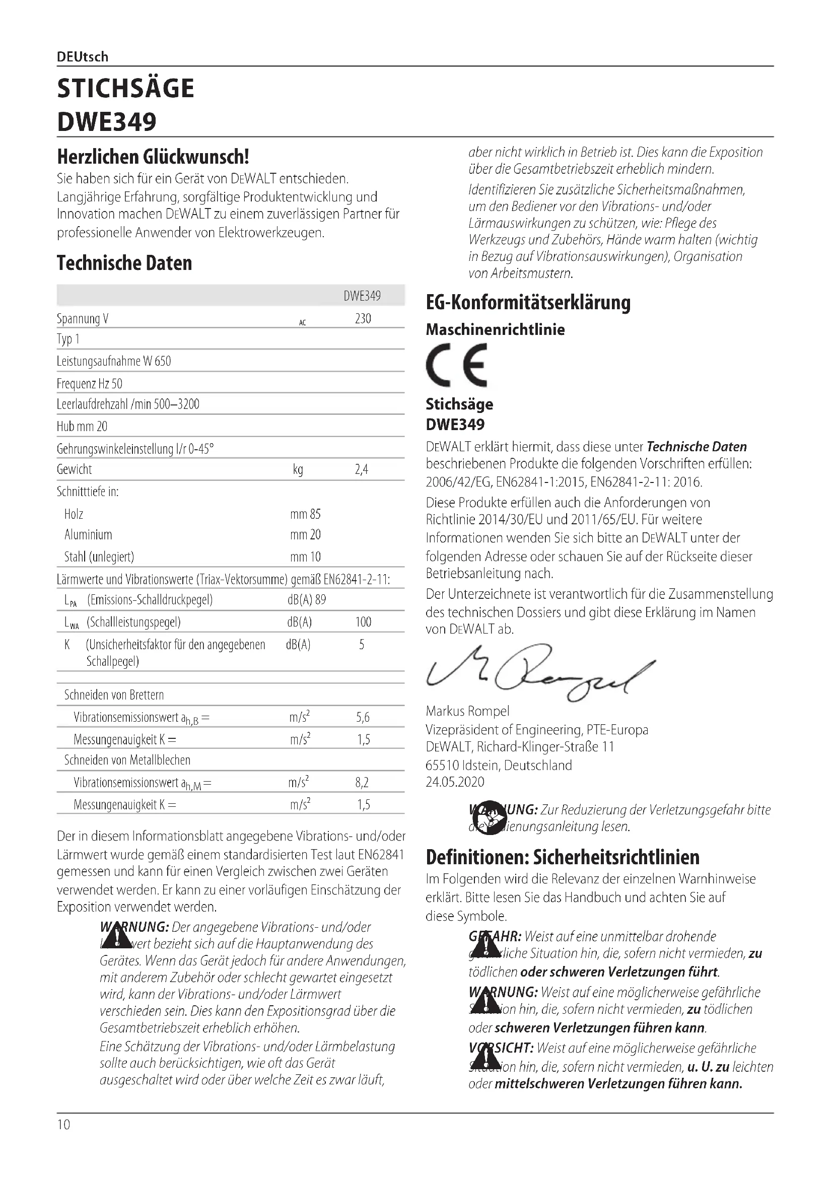 ADVARSEL: For at reducere risikoen for personskade skal du slukke for værktøjet og afbryde det fra strømkilden, inden der foretages justeringer, eller der fjernes/monteres tilbehør eller ekstraudstyr. Utilsigtet start kan medførekvæstelser. Savning på langs/cirkelskæring (Fig.G, H) Savning på langs og cirkelskæring uden en blyantslinje klares nemt ved hjælp af styreskinnen/cirkelskinnen (medfølger ikke, fås mod ekstragebyr). Brug den skrue, der fulgte med tilbehørsskinnen, og placer og skru den ind i sålen for at fastgøreskinnen. Under savning på langs skal du skubbe styreskinnen under skruen fra en af savens sider. Placer tværstangen ved den ønskede afstand fra klingen og stram skruen. I forbindelse med savning på langs bør tværstangen være nede og mod arbejdsemnets ligekant. Under cirkelskæring skal du indstille styreskinnen, så afstanden fra skinnearmen udgør den ønskede radius, og tilspænd skruen. Anbring saven, så hullet i skinnearmen befinder sig over centrum i den cirkel, der skal skæres (bor et hul til klingen eller skær indad fra kanten af materialet for at få klingen på plads). Når saven er placeret korrekt, skal du indsætte et lille søm gennem hullet i skinnearmen. Brug styreskinnen som en vippearm, og begynd at skære cirklen. Ved cirkelskæring skal tværstangen væreoppe.10 DEUtsch WARNUNG: Zur Reduzierung der Verletzungsgefahr bitte die Bedienungsanleitunglesen. Definitionen: Sicherheitsrichtlinien Im Folgenden wird die Relevanz der einzelnen Warnhinweise erklärt. Bitte lesen Sie das Handbuch und achten Sie auf dieseSymbole. GEFAHR: Weist auf eine unmittelbar drohende gefährliche Situation hin, die, sofern nicht vermieden, zu tödlichen oder schweren Verletzungenführt. WARNUNG: Weist auf eine möglicherweise gefährliche Situation hin, die, sofern nicht vermieden, zu tödlichen oder schweren Verletzungen führenkann. VORSICHT: Weist auf eine möglicherweise gefährliche Situation hin, die, sofern nicht vermieden, u. U. zu leichten oder mittelschweren Verletzungen führenkann. EG‑Konformitätserklärung Maschinenrichtlinie Stichsäge DWE349 DeWALT erklärt hiermit, dass diese unter Technische Daten beschriebenen Produkte die folgenden Vorschriften erfüllen: 2006/42/EG, EN62841‑1:2015, EN62841‑2‑11:2016.Diese Produkte erfüllen auch die Anforderungen von Richtlinie 2014/30/EU und 2011/65/EU. Für weitere Informationen wenden Sie sich bitte an DeWALT unter der folgenden Adresse oder schauen Sie auf der Rückseite dieser Betriebsanleitungnach.Der Unterzeichnete ist verantwortlich für die Zusammenstellung des technischen Dossiers und gibt diese Erklärung im Namen von DeWALTab.Markus Rompel Vizepräsident of Engineering, PTE‑Europa DeWALT, Richard‑Klinger‑Straße 11 65510 Idstein, Deutschland 24.05.2020aber nicht wirklich in Betrieb ist. Dies kann die Exposition über die Gesamtbetriebszeit erheblichmindern.Identifizieren Sie zusätzliche Sicherheitsmaßnahmen, um den Bediener vor den Vibrations- und/oder Lärmauswirkungen zu schützen, wie: Pflege des Werkzeugs und Zubehörs, Hände warm halten (wichtig in Bezug auf Vibrationsauswirkungen), Organisation vonArbeitsmustern.Der in diesem Informationsblatt angegebene Vibrations‑ und/oder Lärmwert wurde gemäß einem standardisierten Test laut EN62841 gemessen und kann für einen Vergleich zwischen zwei Geräten verwendet werden. Er kann zu einer vorläufigen Einschätzung der Exposition verwendetwerden. WARNUNG: Der angegebene Vibrations- und/oder Lärmwert bezieht sich auf die Hauptanwendung des Gerätes. Wenn das Gerät jedoch für andere Anwendungen, mit anderem Zubehör oder schlecht gewartet eingesetzt wird, kann der Vibrations- und/oder Lärmwert verschieden sein. Dies kann den Expositionsgrad über die Gesamtbetriebszeit erheblicherhöhen.Eine Schätzung der Vibrations- und/oder Lärmbelastung sollte auch berücksichtigen, wie oft das Gerät ausgeschaltet wird oder über welche Zeit es zwar läuft, DWE349Spannung V
