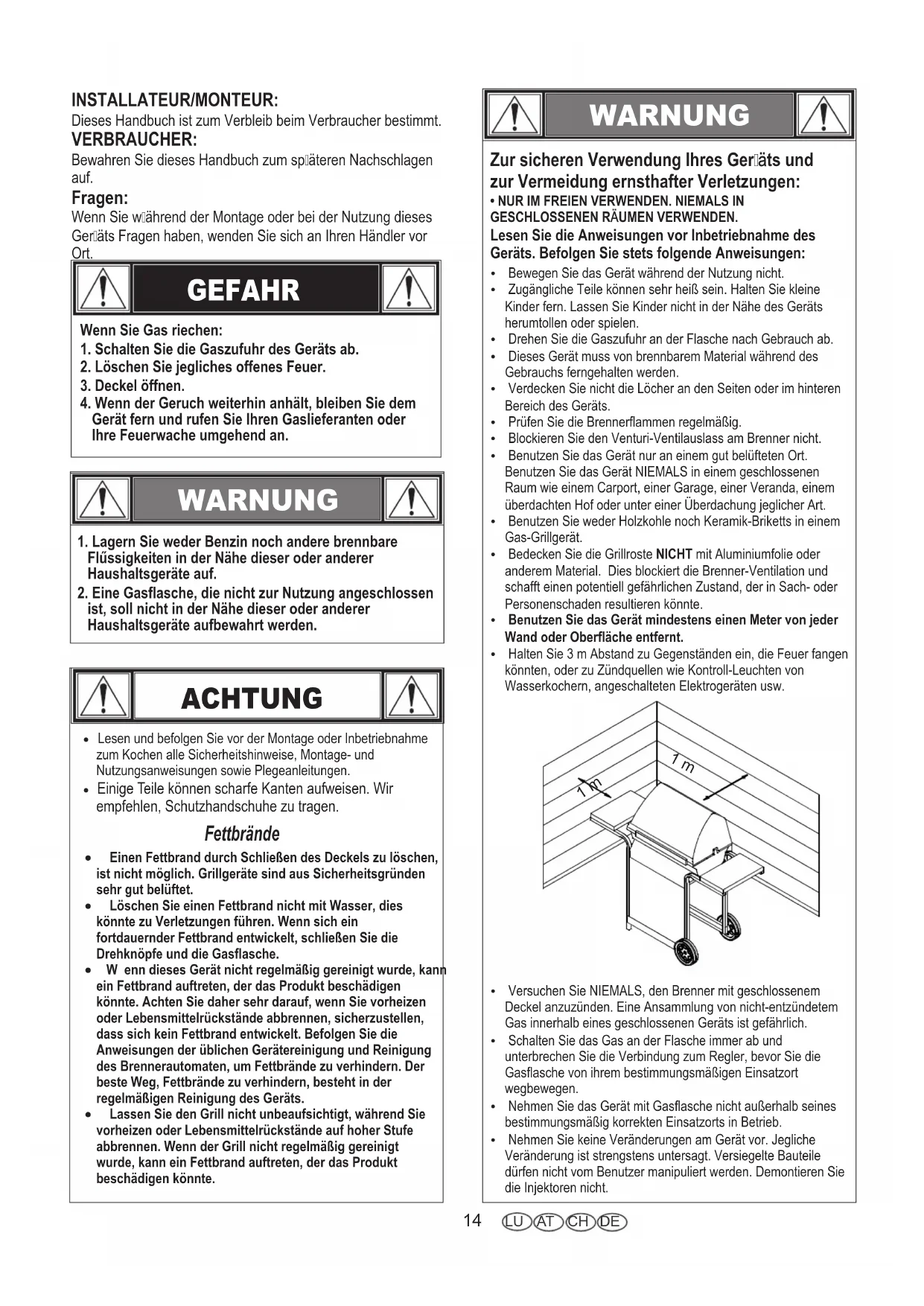 17,00 kW (1237 g/h)14 INSTALLATEUR/MONTEUR: Dieses Handbuch ist zum Verbleib beim Verbraucher bestimmt. VERBRAUCHER: Bewahren Sie dieses Handbuch zum späteren Nachschlagen auf. Fragen: Wenn Sie während der Montage oder bei der Nutzung dieses Geräts Fragen haben, wenden Sie sich an Ihren Händler vor Ort. GEFAHR WARNUNG Wenn Sie Gas riechen:1. Schalten Sie die Gaszufuhr des Geräts ab.2. Löschen Sie jegliches offenes Feuer.3. Deckel öffnen.4. Wenn der Geruch weiterhin anhält, bleiben Sie demGerät fern und rufen Sie Ihren Gaslieferanten oderIhre Feuerwache umgehend an.1. Lagern Sie weder Benzin noch andere brennbareFlűssigkeiten in der Nähe dieser oder andererHaushaltsgeräte auf.2. Eine Gasflasche, die nicht zur Nutzung angeschlossenist, soll nicht in der Nähe dieser oder andererHaushaltsgeräte aufbewahrt werden. ACHTUNG