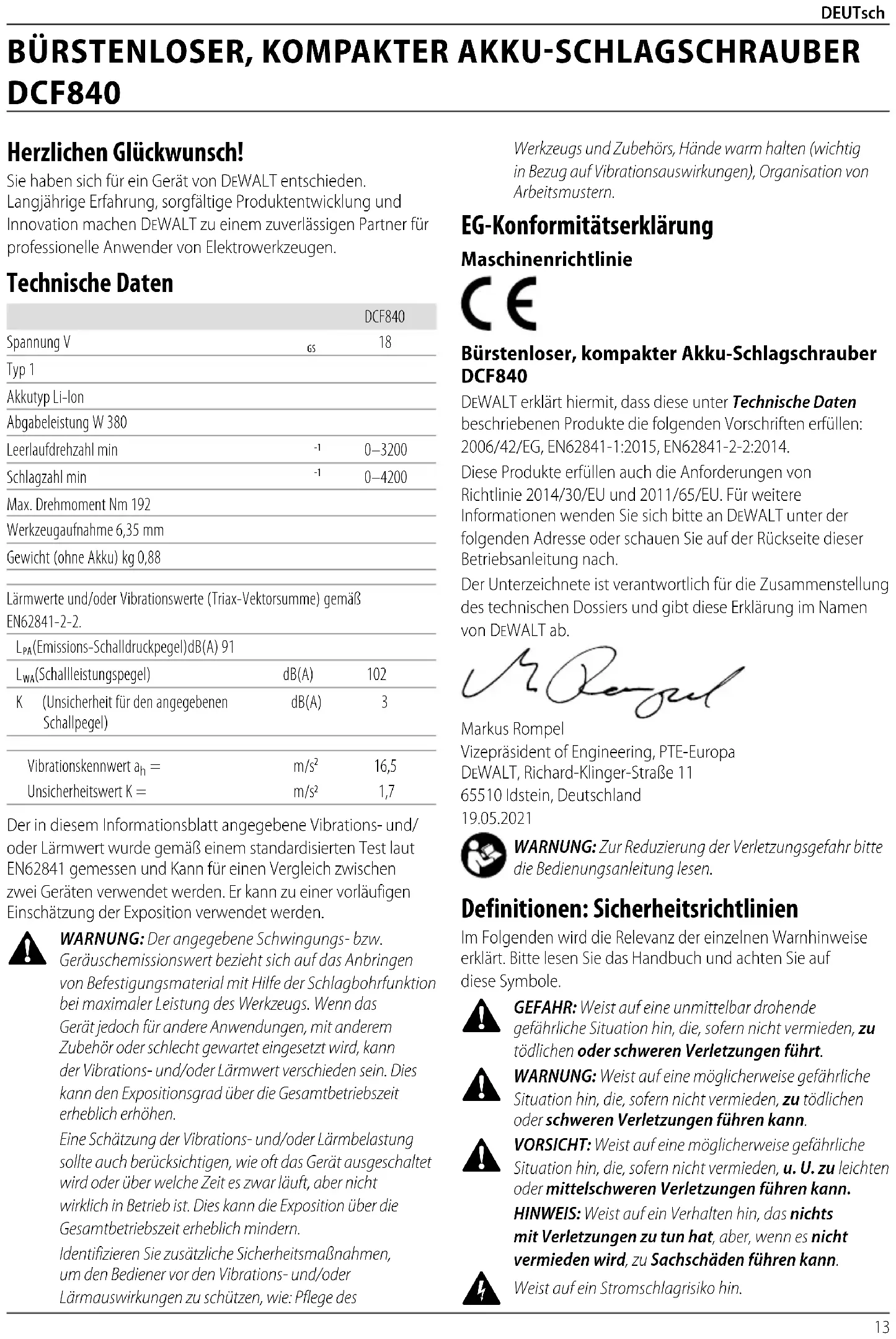 WARNUNG: Der angegebene Schwingungs- bzw. Geräuschemissionswert bezieht sich auf das Anbringen von Befestigungsmaterial mit Hilfe der Schlagbohrfunktion bei maximaler Leistung des Werkzeugs. Wenn das Gerät jedoch für andere Anwendungen, mit anderem Zubehör oder schlecht gewartet eingesetzt wird, kann der Vibrations- und/oder Lärmwert verschieden sein. Dies kann den Expositionsgrad über die Gesamtbetriebszeit erheblicherhöhen. Eine Schätzung der Vibrations- und/oder Lärmbelastung sollte auch berücksichtigen, wie oft das Gerät ausgeschaltet wird oder über welche Zeit es zwar läuft, aber nicht wirklich in Betrieb ist. Dies kann die Exposition über die Gesamtbetriebszeit erheblich mindern. Identifizieren Sie zusätzliche Sicherheitsmaßnahmen, um den Bediener vor den Vibrations- und/oder Lärmauswirkungen zu schützen, wie: Pflege des Werkzeugs und Zubehörs, Hände warm halten (wichtig in Bezug auf Vibrationsauswirkungen), Organisation von Arbeitsmustern. EG-Konformitätserklärung Maschinenrichtlinie Bürstenloser, kompakter Akku-Schlagschrauber DCF840 DeWALT erklärt hiermit, dass diese unter Technische Daten beschriebenen Produkte die folgenden Vorschriften erfüllen: 2006/42/EG, EN62841-1:2015, EN62841-2-2:2014. Diese Produkte erfüllen auch die Anforderungen von Richtlinie 2014/30/EU und 2011/65/EU. Für weitere Informationen wenden Sie sich bitte an DeWALT unter der folgenden Adresse oder schauen Sie auf der Rückseite dieser Betriebsanleitungnach. Der Unterzeichnete ist verantwortlich für die Zusammenstellung des technischen Dossiers und gibt diese Erklärung im Namen von DeWALTab. Markus Rompel Vizepräsident of Engineering, PTE-Europa DeWALT, Richard-Klinger-Straße 11 65510 Idstein, Deutschland
