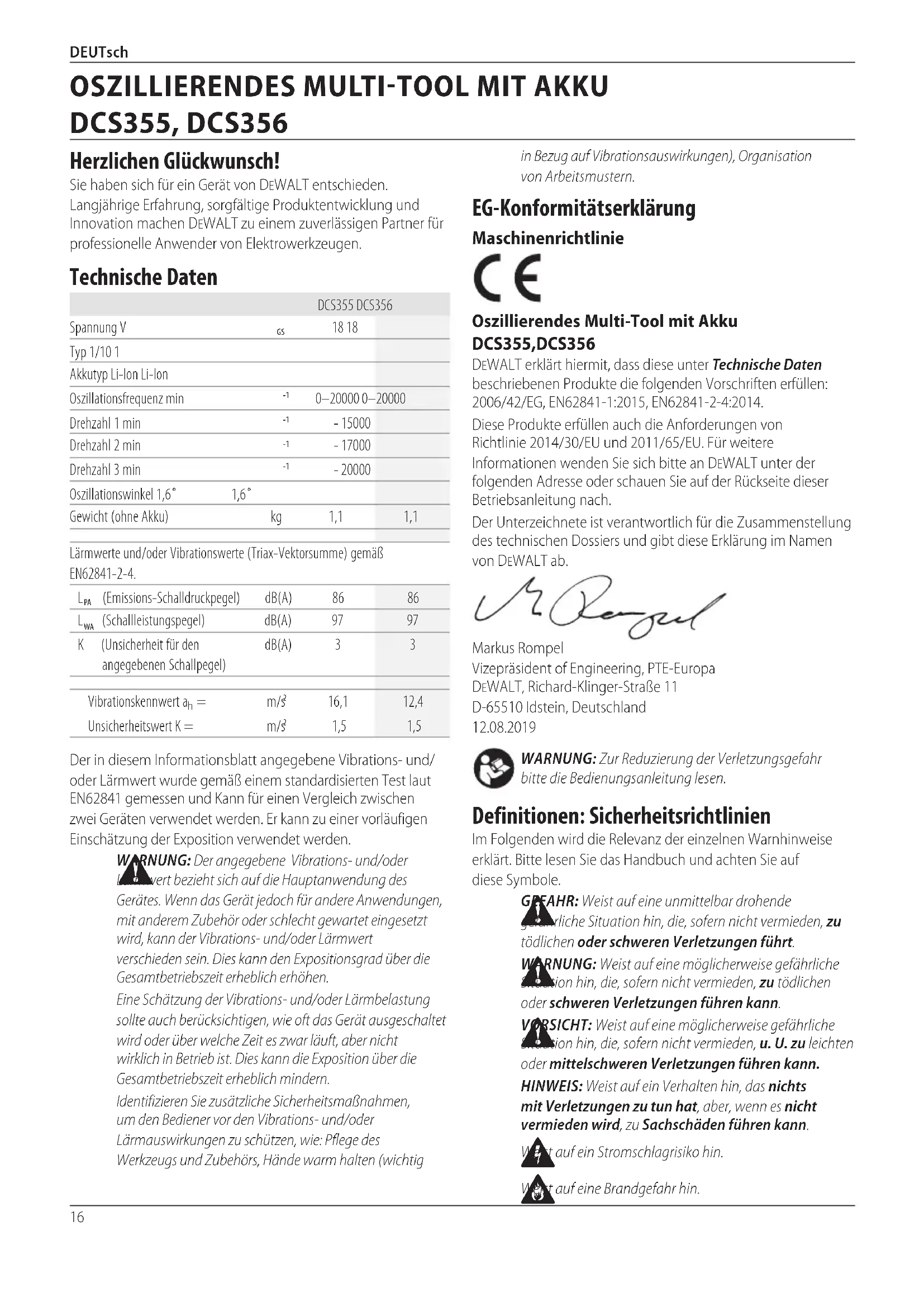Weist auf eine Brandgefahrhin. in Bezug auf Vibrationsauswirkungen), Organisation vonArbeitsmustern. EG-Konformitätserklärung Maschinenrichtlinie Oszillierendes Multi-Tool mit Akku DCS355, DCS356 DeWALT erklärt hiermit, dass diese unter Technische Daten beschriebenen Produkte die folgenden Vorschriften erfüllen: 2006/42/EG, EN62841-1:2015, EN62841-2-4:2014. Diese Produkte erfüllen auch die Anforderungen von Richtlinie 2014/30/EU und 2011/65/EU. Für weitere Informationen wenden Sie sich bitte an DeWALT unter der folgenden Adresse oder schauen Sie auf der Rückseite dieser Betriebsanleitungnach. Der Unterzeichnete ist verantwortlich für die Zusammenstellung des technischen Dossiers und gibt diese Erklärung im Namen von DeWALTab. Markus Rompel Vizepräsident of Engineering, PTE-Europa DeWALT, Richard-Klinger-Straße 11 D-65510 Idstein, Deutschland