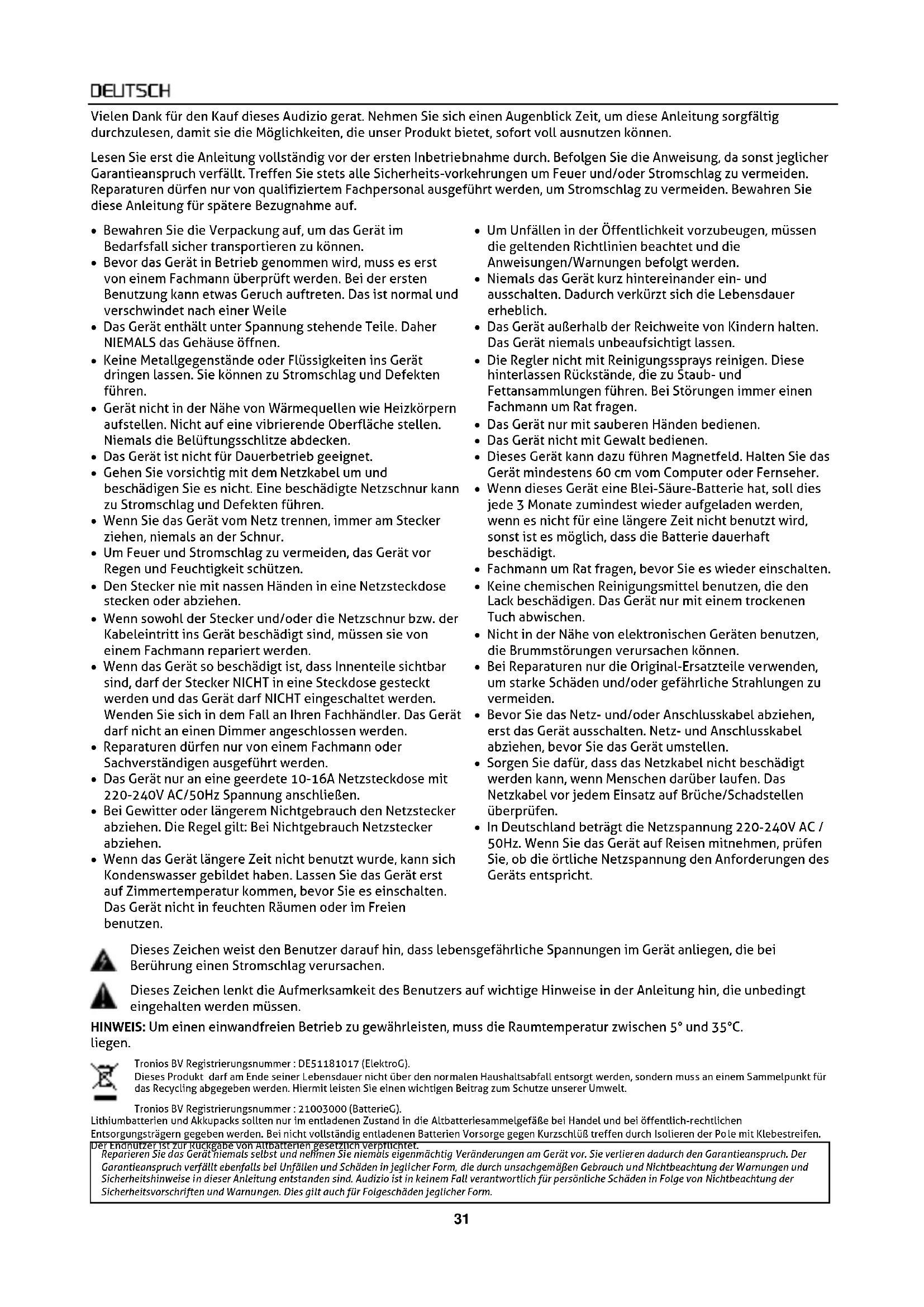- In Deutschland beträgt die Netzspannung 220-240V AC / 50Hz. Wenn Sie das Gerät auf Reisen mitnehmen, prüfen Sie, ob die örtliche Netzspannung den Anforderungen des Geräts entspricht. Dieses Zeichen weist den Benutzer darauf hin, dass lebensgefährliche Spannungen im Gerät anliegen, die bei Berührung einen Stromschlag verursachen. Dieses Zeichen lenkt die Aufmerksamkeit des Benutzers auf wichtige Hinweise in der Anleitung hin, die unbedingt eingehalten werden müssen. HINWEIS: Um einen einwandfreien Betrieb zu gewährleisten, muss die Raumtemperatur zwischen 5° und 35°C. liegen. Tronios BV Registrierungsnummer : DE51181017 (ElektroG). Dieses Produkt darf am Ende seiner Lebensdauer nicht über den normalen Haushaltsabfall entsorgt werden, sondern muss an einem Sammelpunkt für das Recycling abgegeben werden. Hiermit leisten Sie einen wichtigen Beitrag zum Schutze unserer Umwelt. Tronios BV Registrierungsnummer : 21003000 (BatterieG). Lithiumbatterien und Akkupacks sollten nur im entladenen Zustand in die Altbatteriesammelgefäße bei Handel und bei öffentlich-rechtlichen Entsorgungsträgern gegeben werden. Bei nicht vollständig entladenen Batterien Vorsorge gegen Kurzschlüß treffen durch Isolieren der Pole mit Klebestreifen. Der Endnutzer ist zur Rückgabe von Altbatterien gesetzlich verpflichtet.