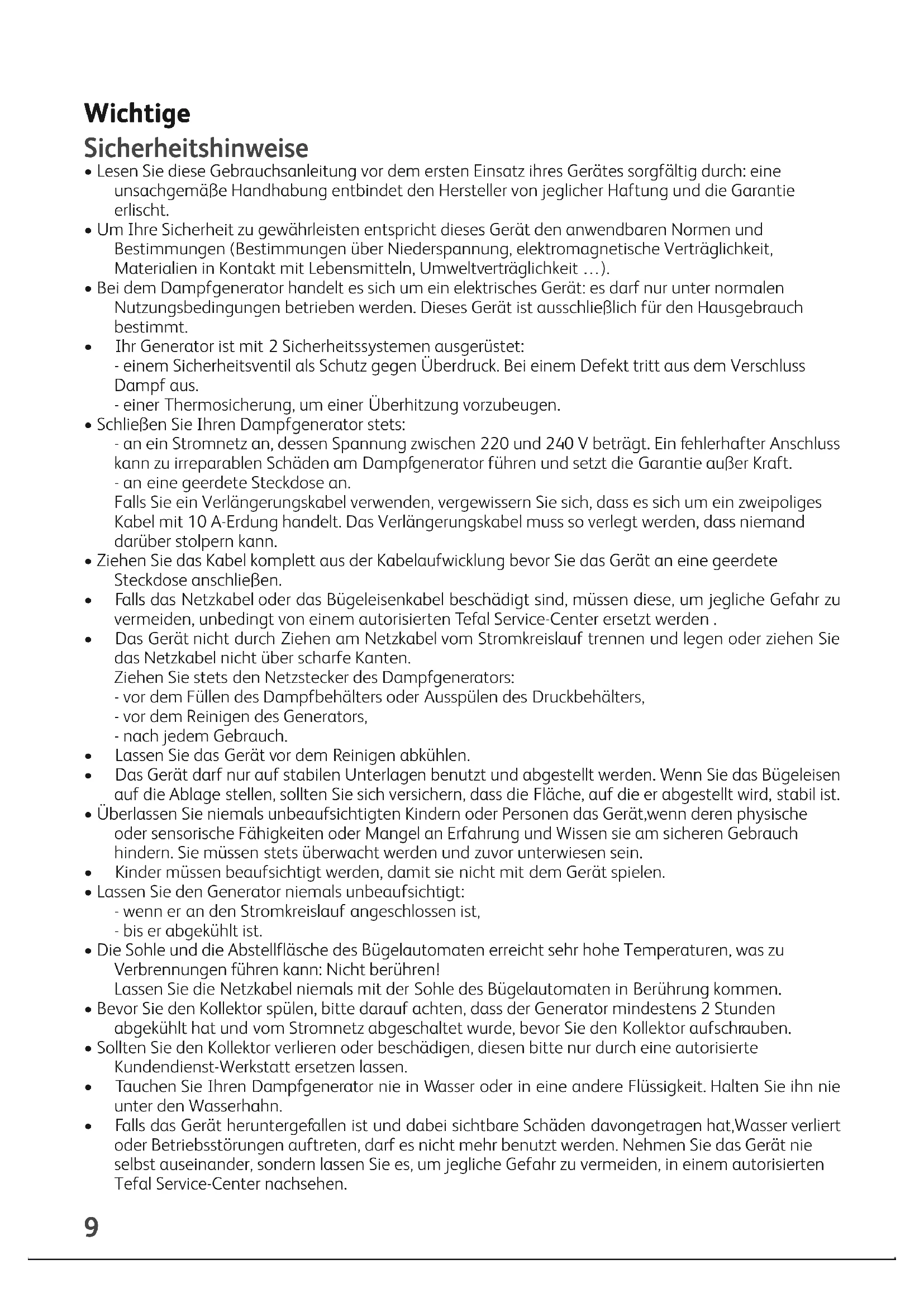- Bei dem Dampfgenerator handelt es sich um ein elektrisches Gerät: es darf nur unter normalen Nutzungsbedingungen betrieben werden. Dieses Gerät ist ausschließlich für den Hausgebrauch bestimmt.