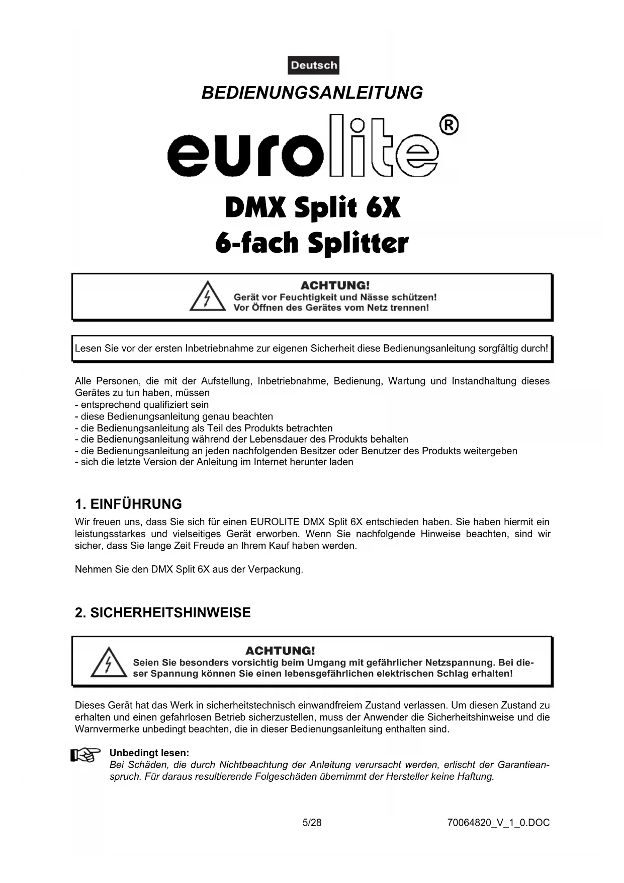 Bei diesem Gerät handelt es sich um einen DMX-Splitter, mit dem sich eine DMX-Kette aufsplitten lässt. Dieses Produkt ist nur für den Anschluss an 230 V, 50 Hz Wechselspannung zugelassen und wurde ausschließlich zur Verwendung in Innenräumen konzipiert. Vermeiden Sie Erschütterungen und jegliche Gewaltanwendung bei der Installation oder Inbetriebnahme des Gerätes. Achten Sie bei der Wahl des Installationsortes darauf, dass das Gerät nicht zu großer Hitze, Feuchtigkeit und Staub ausgesetzt wird. Vergewissern Sie sich, dass keine Kabel frei herumliegen. Sie gefährden Ihre eigene und die Sicherheit Dritter! Das Gerät darf nicht in einer Umgebung eingesetzt oder gelagert werden, in der mit Spritzwasser, Regen, Feuchtigkeit oder Nebel zu rechnen ist. Feuchtigkeit oder sehr hohe Luftfeuchtigkeit kann die Isolation reduzieren und zu tödlichen Stromschlägen führen. Beim Einsatz von Nebelgeräten ist zu beachten, dass das Gerät nie direkt dem Nebelstrahl ausgesetzt ist und mindestens 0,5 m von einem Nebelgerät entfernt betrieben wird. Der Raum darf nur so stark mit Nebel gesättigt sein, dass eine gute Sichtweite von mindestens 10 m besteht. Die Umgebungstemperatur muss zwischen -5° C und +45° C liegen. Halten Sie das Gerät von direkter Sonneneinstrahlung (auch beim Transport in geschlossenen Wägen) und Heizkörpern fern. Die relative Luftfeuchte darf 50 % bei einer Umgebungstemperatur von 45° C nicht überschreiten. Dieses Gerät darf nur in einer Höhenlage zwischen -20 und 2000 m über NN betrieben werden. Verwenden Sie das Gerät nicht bei Gewitter. Überspannung könnte das Gerät zerstören. Das Gerät bei Gewitter allpolig vom Netz trennen (Netzstecker ziehen). Nehmen Sie das Gerät erst in Betrieb, nachdem Sie sich mit seinen Funkionen vertraut gemacht haben. Lassen Sie das Gerät nicht von Personen bedienen, die sich nicht mit dem Gerät auskennen. Wenn Geräte nicht mehr korrekt funktionieren, ist das meist das Ergebnis von unfachmännischer Bedienung! Soll das Gerät transportiert werden, verwenden Sie bitte die Originalverpackung, um Transportschäden zu vermeiden. Beachten Sie bitte, dass eigenmächtige Veränderungen an dem Gerät aus Sicherheitsgründen verboten sind. Der Serienbarcode darf niemals vom Gerät entfernt werden, da ansonsten der Garantieanspruch erlischt. Wird das Gerät anders verwendet als in dieser Bedienungsanleitung beschrieben, kann dies zu Schäden am Produkt führen und der Garantieanspruch erlischt. Außerdem ist jede andere Verwendung mit Gefahren, wie z. B. Kurzschluss, Brand, elektrischem Schlag, etc. verbunden.