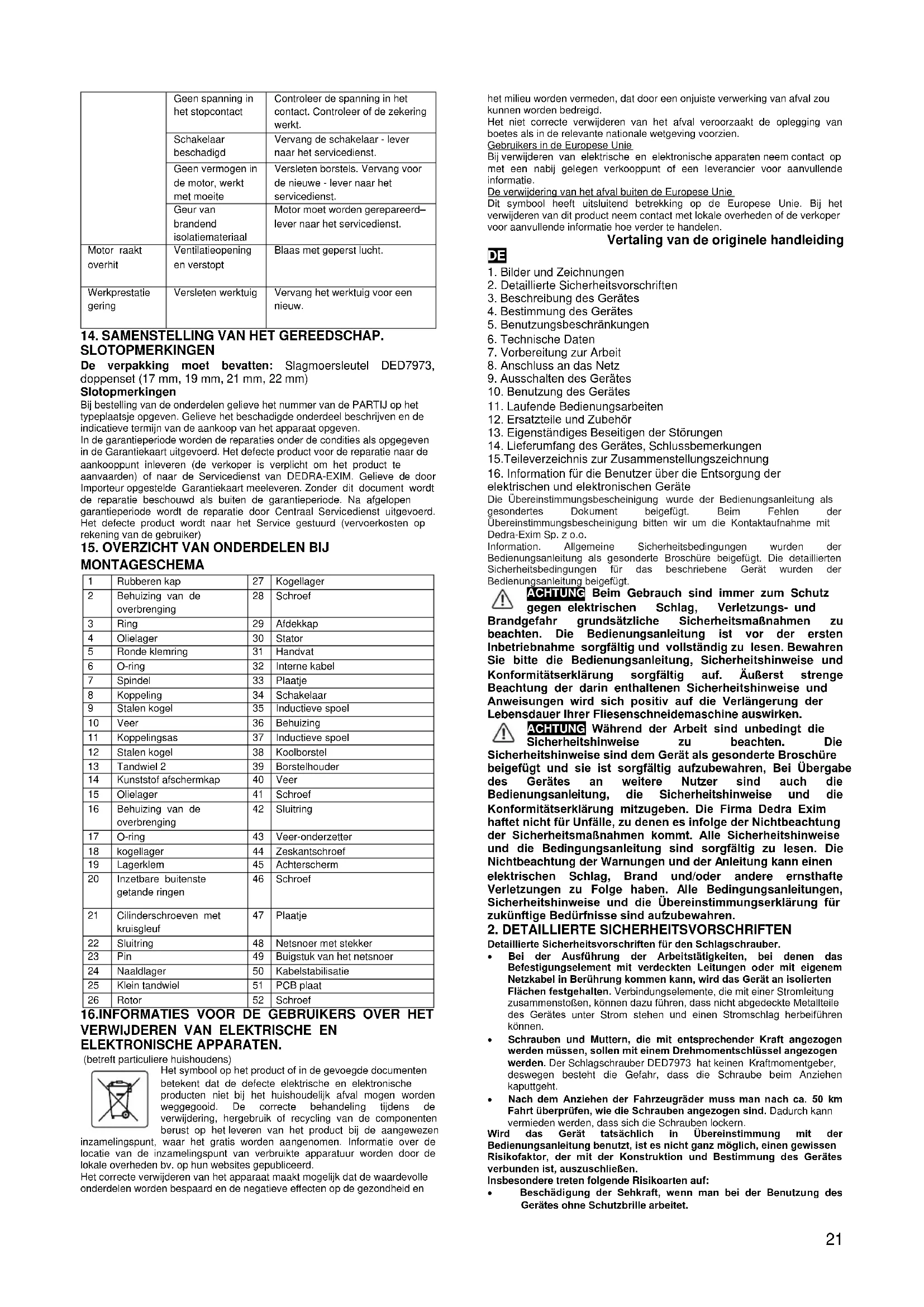 SCHLUSSBEMERKUNGEN Eine Verpackung soll enthalten: einen Schlagschrauber DED7973, einen Satz der Aufsätze (17 mm, 19 mm, 21 mm, 22 mm) Schlussbemerkungen Bei Bestellung der Ersatzteile geben Sie di Nummer der PARTIE an, die auf dem Betriebsschild angebracht ist. Wir bitten, den beschädigten Teil beschreiben, indem Sie den angenäherten Einkaufstermin des Gerätes bekannt geben. Während der Garantiezeit werden Reparaturen nach den in der Garantiekarte angegebenen Grundsätzen ausgeführt. Das reklamierte Produkt übergeben Sie zwecks Reparatur am Einkaufsort (der Verkäufer ist dazu verpflichtet, das reklamierte Produkt entgegenzunehmen) oder übersenden es an den Zentralen Service von DEDRA - EXIM. Wir bitten Sie,23 die durch den Importeuer ausgestellte Garantiekarte beizufügen. Ohne dieses Dokument wird die Reparatur wie eine Reparatur nach dem Ablauf der Garantie behandelt. Nach Ablauf der Garantiezeit wird die Reparatur durch den Zentralen Service ausgeführt. Das beschädigte Produkt ist an den Service zu schicken (die Versandkosten werden durch den Benutzer getragen).
