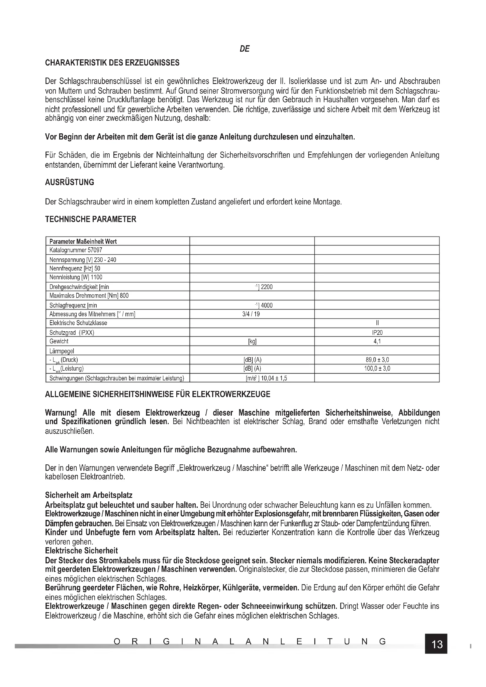 Der Schlagschraubenschlüssel ist ein gewöhnliches Elektrowerkzeug der II. Isolierklasse und ist zum An- und Abschrauben von Muttern und Schrauben bestimmt. Auf Grund seiner Stromversorgung wird für den Funktionsbetrieb mit dem Schlagschrau- benschlüssel keine Druckluftanlage benötigt. Das Werkzeug ist nur für den Gebrauch in Haushalten vorgesehen. Man darf es nicht professionell und für gewerbliche Arbeiten verwenden. Die richtige, zuverlässige und sichere Arbeit mit dem Werkzeug ist abhängig von einer zweckmäßigen Nutzung, deshalb: Vor Beginn der Arbeiten mit dem Gerät ist die ganze Anleitung durchzulesen und einzuhalten. Für Schäden, die im Ergebnis der Nichteinhaltung der Sicherheitsvorschriften und Empfehlungen der vorliegenden Anleitung entstanden, übernimmt der Lieferant keine Verantwortung. AUSRÜSTUNG Der Schlagschrauber wird in einem kompletten Zustand angeliefert und erfordert keine Montage. TECHNISCHE PARAMETER Parameter Maßeinheit Wert Katalognummer 57097 Nennspannung [V] 230 - 240 Nennfrequenz [Hz] 50 Nennleistung [W] 1100 Drehgeschwindigkeit [min
