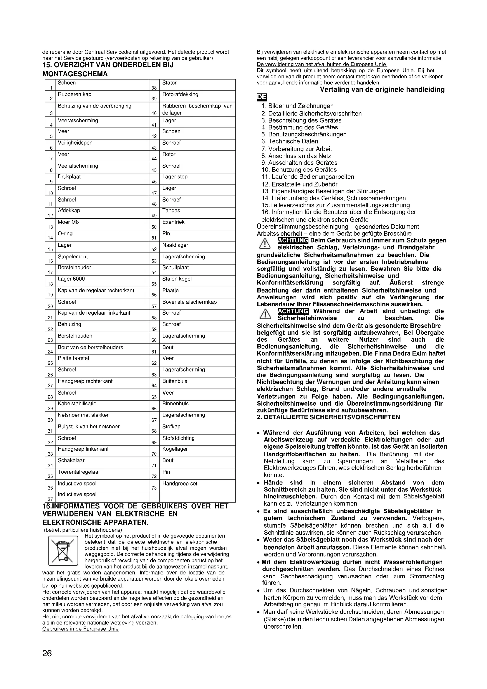 elektrischen und elektronischen Geräte Übereinstimmungsbescheinigung – gesondertes Dokument Arbeitssicherheit – eine dem Gerät beigefügte Broschüre ACHTUNG Beim Gebrauch sind immer zum Schutz gegen elektrischen Schlag, Verletzungs- und Brandgefahr grundsätzliche Sicherheitsmaßnahmen zu beachten. Die Bedienungsanleitung ist vor der ersten Inbetriebnahme sorgfältig und vollständig zu lesen. Bewahren Sie bitte die Bedienungsanleitung, Sicherheitshinweise und Konformitätserklärung sorgfältig auf. Äußerst strenge Beachtung der darin enthaltenen Sicherheitshinweise und Anweisungen wird sich positiv auf die Verlängerung der Lebensdauer Ihrer Fliesenschneidemaschine auswirken. ACHTUNG Während der Arbeit sind unbedingt die Sicherheitshinweise zu beachten. Die Sicherheitshinweise sind dem Gerät als gesonderte Broschüre beigefügt und sie ist sorgfältig aufzubewahren, Bei Übergabe des Gerätes an weitere Nutzer sind auch die Bedienungsanleitung, die Sicherheitshinweise und die Konformitätserklärung mitzugeben. Die Firma Dedra Exim haftet nicht für Unfälle, zu denen es infolge der Nichtbeachtung der Sicherheitsmaßnahmen kommt. Alle Sicherheitshinweise und die Bedingungsanleitung sind sorgfältig zu lesen. Die Nichtbeachtung der Warnungen und der Anleitung kann einen elektrischen Schlag, Brand und/oder andere ernsthafte Verletzungen zu Folge haben. Alle Bedingungsanleitungen, Sicherheitshinweise und die Übereinstimmungserklärung für zukünftige Bedürfnisse sind aufzubewahren.