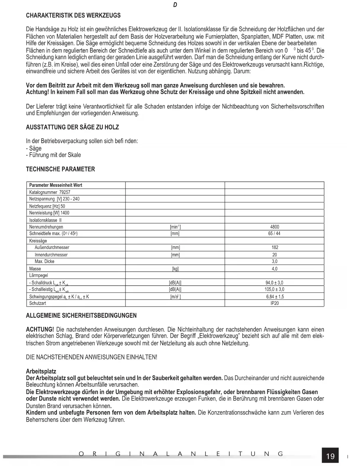 In der Betriebsverpackung sollen sich befi nden: - Säge - Führung mit der Skale TECHNISCHE PARAMETER Parameter Messeinheit Wert Katalognummer 79257 Netzspannung [V] 230 - 240 Netzfequenz [Hz] 50 Nennleistung [W] 1400 Isolationsklasse II Nennumdrehungen [min