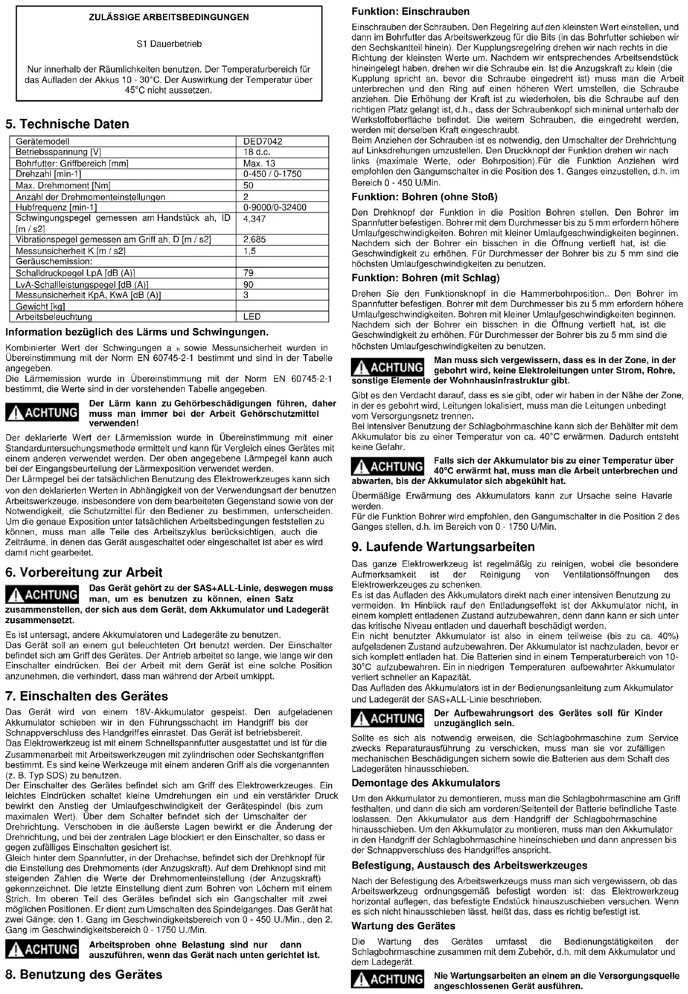 Das Gerät darf nur in Übereinstimmung mit den nachstehend angegebenen “Zulässigen Arbeitsbedingungen” verwendet werden. Das Befestigungssystem ist an die Zusammenarbeit mit Werkzeugen angepasst, die mit einem zylindrischen oder Sechskantbohrfutter (Beschreibung im Teil “Empfohlene Arbeitswerkzeuge”) ausgestattet sind. Eigenständige Änderungen am mechanischen und elektrischen Bau, jegliche Modifikationen, Bedienungstätigkeiten, die in der Bedienungsanleitung nicht beschrieben sind, werden als rechtswidrig behandelt und ziehen den sofortigen Verlust der Garantierechte nach sich, die Übereinstimmungserklärung verliert ihre Gültigkeit. Eine bestimmungswidrige oder bedienungsanleitungwidrige Benutzung des Gerätes bewirkt den sofortigen Verlust der Garantierechte.ZULÄSSIGE ARBEITSBEDINGUNGEN S1 Dauerbetrieb Nur innerhalb der Räumlichkeiten benutzen. Der Temperaturbereich für das Aufladen der Akkus 10 - 30°C. Der Auswirkung der Temperatur über 45°C nicht aussetzen.