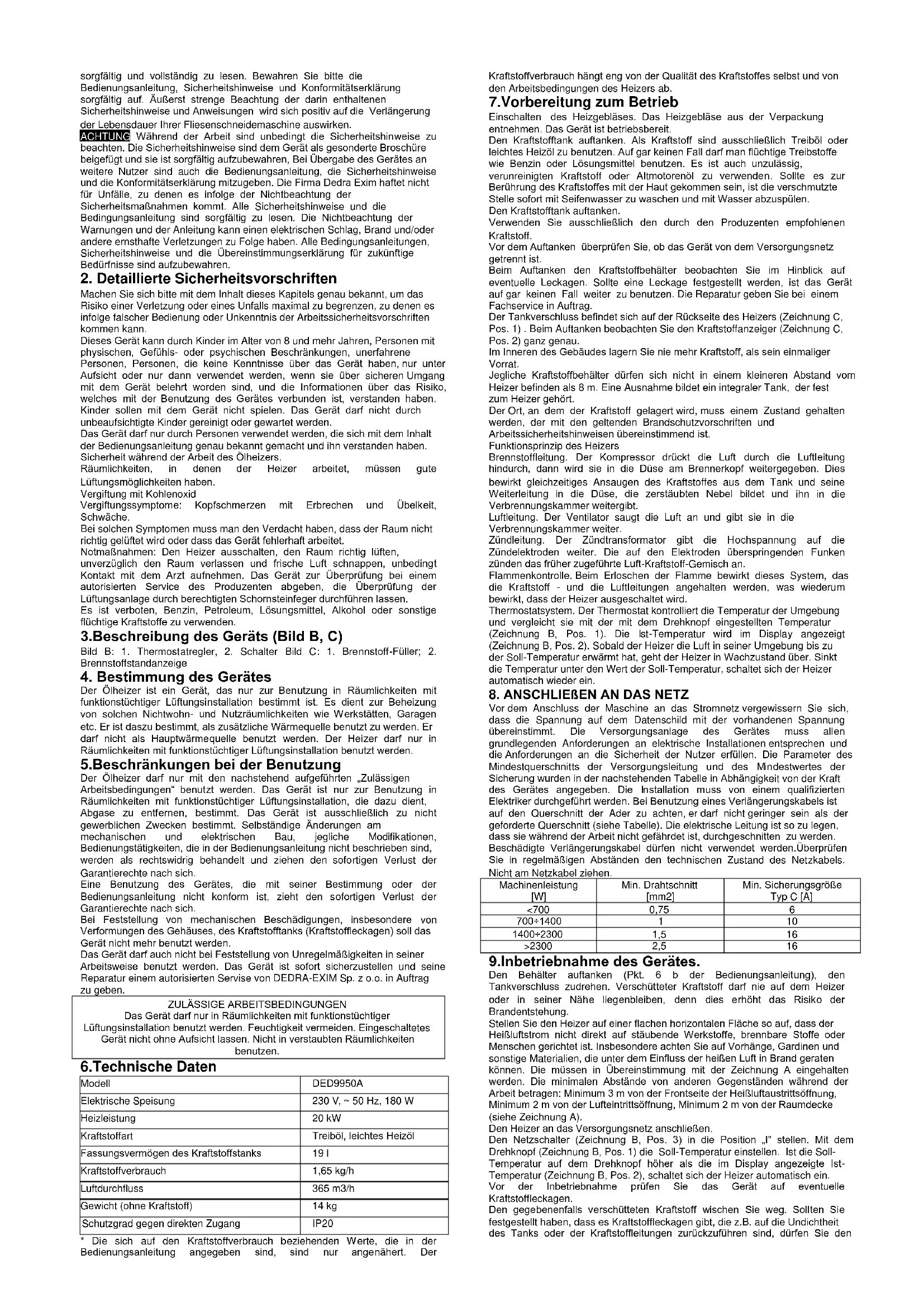 Der Ölheizer ist ein Gerät, das nur zur Benutzung in Räumlichkeiten mit funktionstüchtiger Lüftungsinstallation bestimmt ist. Es dient zur Beheizung von solchen Nichtwohn- und Nutzräumlichkeiten wie Werkstätten, Garagen etc. Er ist daszu bestimmt, als zusätzliche Wärmequelle benutzt zu werden. Er darf nicht als Hauptwärmequelle benutzt werden. Der Heizer darf nur in Räumlichkeiten mit funktionstüchtiger Lüftungsinstallation benutzt werden. 5.Beschränkungen bei der Benutzung Der Ölheizer darf nur mit den nachstehend aufgeführten „Zulässigen Arbeitsbedingungen“ benutzt werden. Das Gerät ist nur zur Benutzung in Räumlichkeiten mit funktionstüchtiger Lüftungsinstallation, die dazu dient, Abgase zu entfernen, bestimmt. Das Gerät ist ausschließlich zu nicht gewerblichen Zwecken bestimmt. Selbständige Änderungen am mechanischen und elektrischen Bau, jegliche Modifikationen, Bedienungstätigkeiten, die in der Bedienungsanleitung nicht beschrieben sind, werden als rechtswidrig behandelt und ziehen den sofortigen Verlust der Garantierechte nach sich. Eine Benutzung des Gerätes, die mit seiner Bestimmung oder der Bedienungsanleitung nicht konform ist, zieht den sofortigen Verlust der Garantierechte nach sich. Bei Feststellung von mechanischen Beschädigungen, insbesondere von Verformungen des Gehäuses, des Kraftstofftanks (Kraftstoffleckagen) soll das Gerät nicht mehr benutzt werden. Das Gerät darf auch nicht bei Feststellung von Unregelmäßigkeiten in seiner Arbeitsweise benutzt werden. Das Gerät ist sofort sicherzustellen und seine Reparatur einem autorisierten Servise von DEDRA-EXIM Sp. z o.o. in Auftrag zu geben.