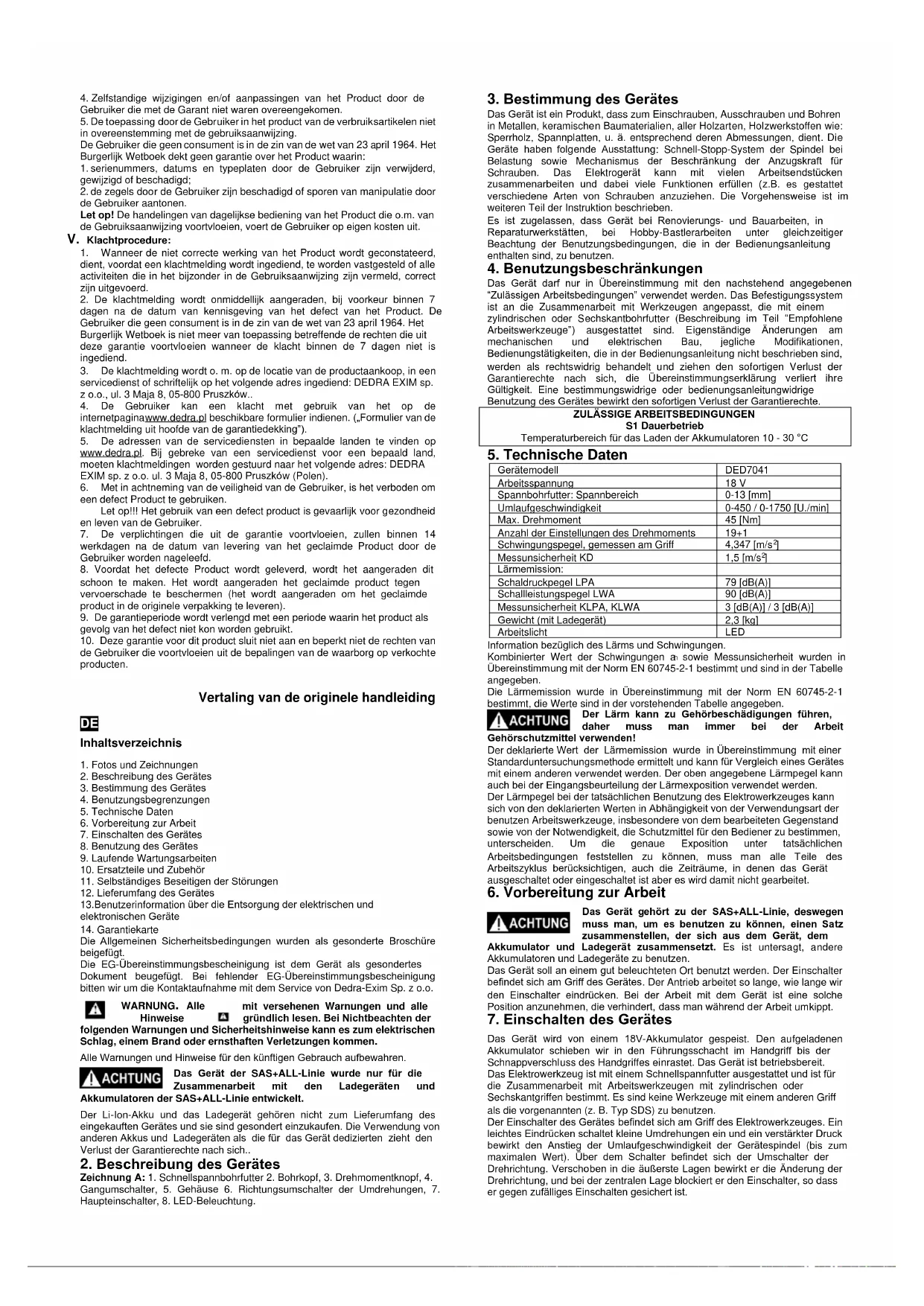 Die Allgemeinen Sicherheitsbedingungen wurden als gesonderte Broschüre beigefügt. Die EG-Übereinstimmungsbescheinigung ist dem Gerät als gesondertes Dokument beugefügt. Bei fehlender EG-Übereinstimmungsbescheinigung bitten wir um die Kontaktaufnahme mit dem Service von Dedra-Exim Sp. z o.o. WARNUNG. Alle mit versehenen Warnungen und alle Hinweise gründlich lesen. Bei Nichtbeachten der folgenden Warnungen und Sicherheitshinweise kann es zum elektrischen Schlag, einem Brand oder ernsthaften Verletzungen kommen. Alle Warnungen und Hinweise für den künftigen Gebrauch aufbewahren. Das Gerät der SAS+ALL-Linie wurde nur für die Zusammenarbeit mit den Ladegeräten und Akkumulatoren der SAS+ALL-Linie entwickelt. Der Li-Ion-Akku und das Ladegerät gehören nicht zum Lieferumfang des eingekauften Gerätes und sie sind gesondert einzukaufen. Die Verwendung von anderen Akkus und Ladegeräten als die für das Gerät dedizierten zieht den Verlust der Garantierechte nach sich..