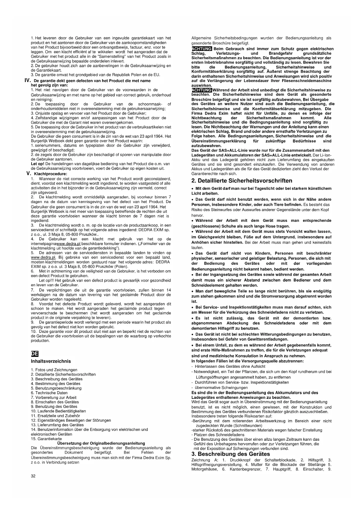 Das Gerät aus der SAS+ALL Linie kann mit jedem Akkumulator und Ladegerät der SAS+ALL Linie ausgestattet werden. Um den richtigen Akkumulator und das richtige Ladegerät anzupassen, empfehlen wir Ihnen, sich mit dem Angebot von Dedra Exim auf der Internetseite www.dedra.pl bekannt zu machen. Zusätzlich ist im Angebot zugänglich: - DED70901 – Spule mit dem Faden Um die Ersatzteile und das Zubehör zu kaufen, muss man sich mit dem Service von Dedra Exim in Verbindung setzen. Die Kontaktdaten finden Sie auf der 1. Seite der Bedienungsanleitung. Bei der Bestellung der Ersatzteile bitten wir die Nummer der Serie bekannt zu geben, die auf dem Typenschild angebracht ist, sowie die Teilnummer aus der Zusammenstellungszeichnung. In der Garantiezeit werden Reparaturen nach den in der Garantiekarte angegebenen Grundsätzen durchgeführt. Das reklamierte Produkt bitten wir dort zur Reparatur abzugeben, wo Sie es gekauft haben (der Verkäufer ist verpflichtet, das reklamierte Produkt entgegenzunehmen), an den Service von Dedra Exim oder an den dem Wohnort am nächsten befindlichen Service zu übersenden (Liste der Servicestellen ist auf der Internetseite www.dedra.pl zu finden). Wir bitten höflich, die ausgefüllte Garantie beizufügen. Nach Ablauf der Garantiezeit werden Reparaturen durch den Zentralservice ausgeführt. Das beschädigte Produkt bitten wir an den Service zu übersenden, (die Versandkosten trägt der Benutzer).