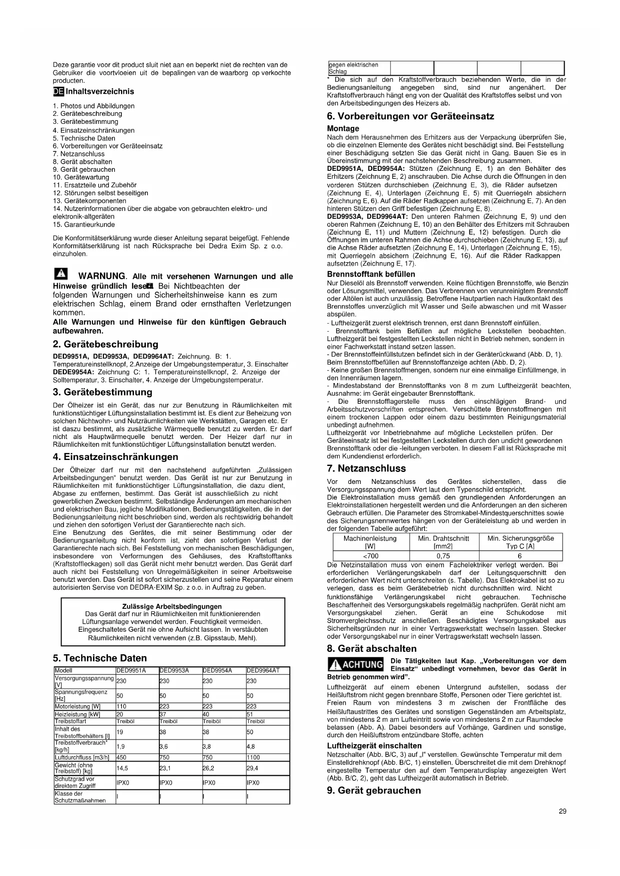Der Ölheizer darf nur mit den nachstehend aufgeführten „Zulässigen Arbeitsbedingungen“ benutzt werden. Das Gerät ist nur zur Benutzung in Räumlichkeiten mit funktionstüchtiger Lüftungsinstallation, die dazu dient, Abgase zu entfernen, bestimmt. Das Gerät ist ausschließlich zu nicht gewerblichen Zwecken bestimmt. Selbständige Änderungen am mechanischen und elektrischen Bau, jegliche Modifikationen, Bedienungstätigkeiten, die in der Bedienungsanleitung nicht beschrieben sind, werden als rechtswidrig behandelt und ziehen den sofortigen Verlust der Garantierechte nach sich. Eine Benutzung des Gerätes, die mit seiner Bestimmung oder der Bedienungsanleitung nicht konform ist, zieht den sofortigen Verlust der Garantierechte nach sich. Bei Feststellung von mechanischen Beschädigungen, insbesondere von Verformungen des Gehäuses, des Kraftstofftanks (Kraftstoffleckagen) soll das Gerät nicht mehr benutzt werden. Das Gerät darf auch nicht bei Feststellung von Unregelmäßigkeiten in seiner Arbeitsweise benutzt werden. Das Gerät ist sofort sicherzustellen und seine Reparatur einem autorisierten Servise von DEDRA-EXIM Sp. z o.o. in Auftrag zu geben. Zulässige Arbeitsbedingungen Das Gerät darf nur in Räumlichkeiten mit funktionierenden Lüftungsanlage verwendet werden. Feuchtigkeit vermeiden. Eingeschaltetes Gerät nie ohne Aufsicht lassen. In verstäubten Räumlichkeiten nicht verwenden (z.B. Gipsstaub, Mehl).
