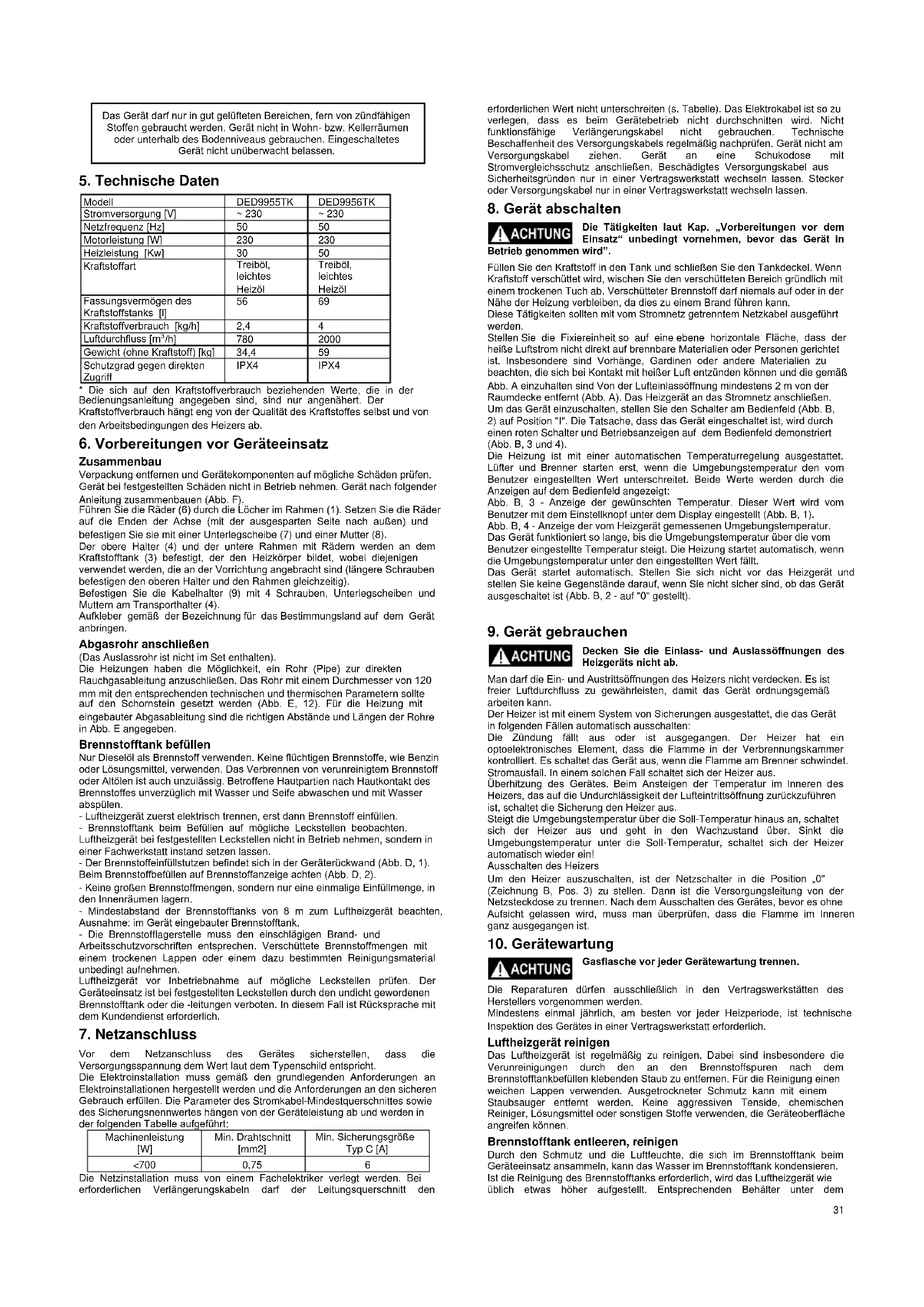 Zusammenbau Verpackung entfernen und Gerätekomponenten auf mögliche Schäden prüfen. Gerät bei festgestellten Schäden nicht in Betrieb nehmen. Gerät nach folgender Anleitung zusammenbauen (Abb. F). Führen Sie die Räder (6) durch die Löcher im Rahmen (1). Setzen Sie die Räder auf die Enden der Achse (mit der ausgesparten Seite nach außen) und befestigen Sie sie mit einer Unterlegscheibe (7) und einer Mutter (8). Der obere Halter (4) und der untere Rahmen mit Rädern werden an dem Kraftstofftank (3) befestigt, der den Heizkörper bildet, wobei diejenigen verwendet werden, die an der Vorrichtung angebracht sind (längere Schrauben befestigen den oberen Halter und den Rahmen gleichzeitig). Befestigen Sie die Kabelhalter (9) mit 4 Schrauben, Unterlegscheiben und Muttern am Transporthalter (4). Aufkleber gemäß der Bezeichnung für das Bestimmungsland auf dem Gerät anbringen. Abgasrohr anschließen (Das Auslassrohr ist nicht im Set enthalten). Die Heizungen haben die Möglichkeit, ein Rohr (Pipe) zur direkten Rauchgasableitung anzuschließen. Das Rohr mit einem Durchmesser von 120 mm mit den entsprechenden technischen und thermischen Parametern sollte auf den Schornstein gesetzt werden (Abb. E, 12). Für die Heizung mit eingebauter Abgasableitung sind die richtigen Abstände und Längen der Rohre in Abb. E angegeben. Brennstofftank befüllen Nur Dieselöl als Brennstoff verwenden. Keine flüchtigen Brennstoffe, wie Benzin oder Lösungsmittel, verwenden. Das Verbrennen von verunreinigtem Brennstoff oder Altölen ist auch unzulässig. Betroffene Hautpartien nach Hautkontakt des Brennstoffes unverzüglich mit Wasser und Seife abwaschen und mit Wasser abspülen. - Luftheizgerät zuerst elektrisch trennen, erst dann Brennstoff einfüllen. - Brennstofftank beim Befüllen auf mögliche Leckstellen beobachten. Luftheizgerät bei festgestellten Leckstellen nicht in Betrieb nehmen, sondern in einer Fachwerkstatt instand setzen lassen. - Der Brennstoffeinfüllstutzen befindet sich in der Geräterückwand (Abb. D, 1). Beim Brennstoffbefüllen auf Brennstoffanzeige achten (Abb. D, 2). - Keine großen Brennstoffmengen, sondern nur eine einmalige Einfüllmenge, in den Innenräumen lagern. - Mindestabstand der Brennstofftanks von 8 m zum Luftheizgerät beachten, Ausnahme: im Gerät eingebauter Brennstofftank. - Die Brennstofflagerstelle muss den einschlägigen Brand- und Arbeitsschutzvorschriften entsprechen. Verschüttete Brennstoffmengen mit einem trockenen Lappen oder einem dazu bestimmten Reinigungsmaterial unbedingt aufnehmen. Luftheizgerät vor Inbetriebnahme auf mögliche Leckstellen prüfen. Der Geräteeinsatz ist bei festgestellten Leckstellen durch den undicht gewordenen Brennstofftank oder die -leitungen verboten. In diesem Fall ist Rücksprache mit dem Kundendienst erforderlich.