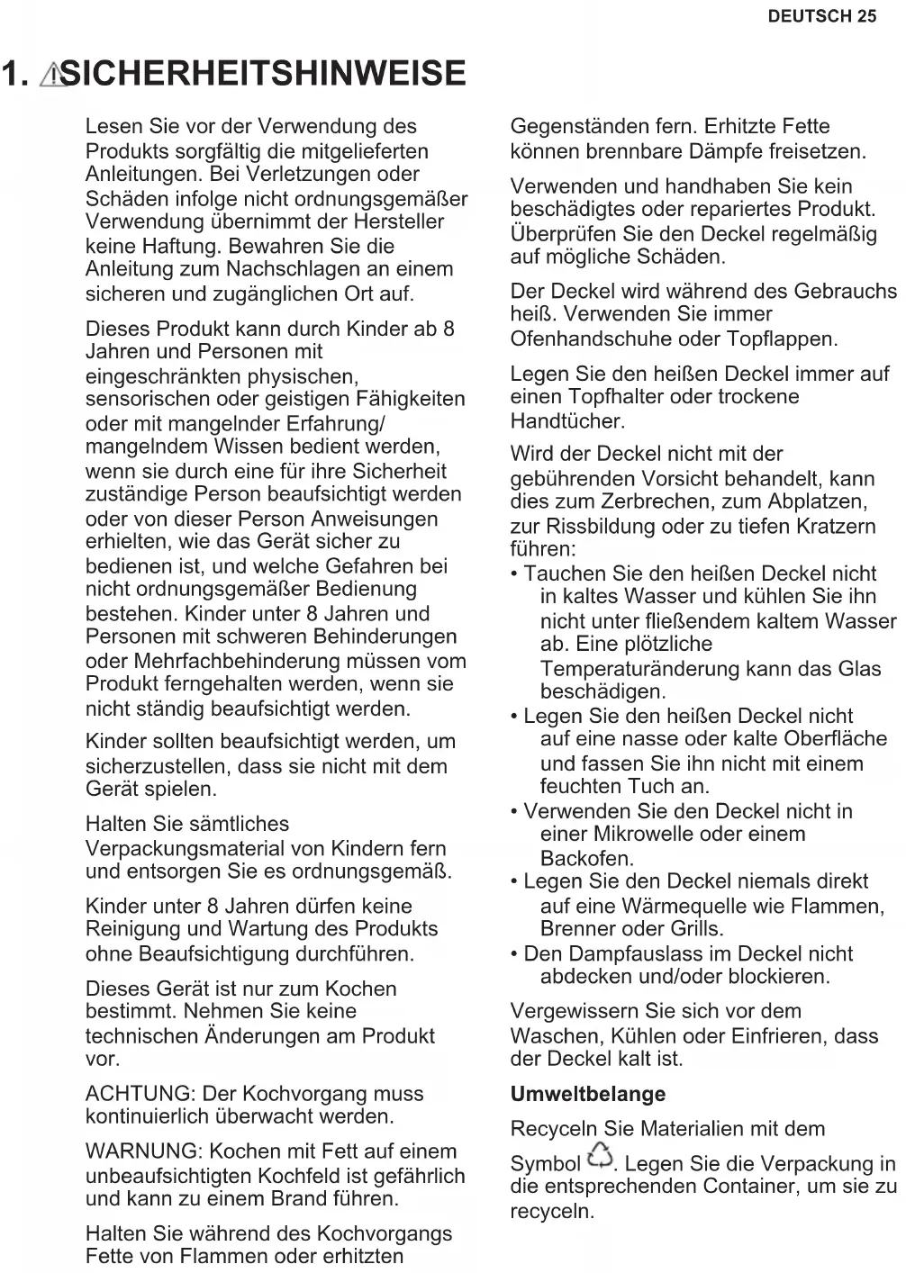 Lesen Sie vor der Verwendung des Produkts sorgfältig die mitgelieferten Anleitungen. Bei Verletzungen oder Schäden infolge nicht ordnungsgemäßer Verwendung übernimmt der Hersteller keine Haftung. Bewahren Sie die Anleitung zum Nachschlagen an einem sicheren und zugänglichen Ort auf. Dieses Produkt kann durch Kinder ab 8 Jahren und Personen mit eingeschränkten physischen, sensorischen oder geistigen Fähigkeiten oder mit mangelnder Erfahrung/ mangelndem Wissen bedient werden, wenn sie durch eine für ihre Sicherheit zuständige Person beaufsichtigt werden oder von dieser Person Anweisungen erhielten, wie das Gerät sicher zu bedienen ist, und welche Gefahren bei nicht ordnungsgemäßer Bedienung bestehen. Kinder unter 8 Jahren und Personen mit schweren Behinderungen oder Mehrfachbehinderung müssen vom Produkt ferngehalten werden, wenn sie nicht ständig beaufsichtigt werden. Kinder sollten beaufsichtigt werden, um sicherzustellen, dass sie nicht mit dem Gerät spielen. Halten Sie sämtliches Verpackungsmaterial von Kindern fern und entsorgen Sie es ordnungsgemäß. Kinder unter 8 Jahren dürfen keine Reinigung und Wartung des Produkts ohne Beaufsichtigung durchführen. Dieses Gerät ist nur zum Kochen bestimmt. Nehmen Sie keine technischen Änderungen am Produkt vor. ACHTUNG: Der Kochvorgang muss kontinuierlich überwacht werden. WARNUNG: Kochen mit Fett auf einem unbeaufsichtigten Kochfeld ist gefährlich und kann zu einem Brand führen. Halten Sie während des Kochvorgangs Fette von Flammen oder erhitzten Gegenständen fern. Erhitzte Fette können brennbare Dämpfe freisetzen. Verwenden und handhaben Sie kein beschädigtes oder repariertes Produkt. Überprüfen Sie den Deckel regelmäßig auf mögliche Schäden. Der Deckel wird während des Gebrauchs heiß. Verwenden Sie immer Ofenhandschuhe oder Topflappen. Legen Sie den heißen Deckel immer auf einen Topfhalter oder trockene Handtücher. Wird der Deckel nicht mit der gebührenden Vorsicht behandelt, kann dies zum Zerbrechen, zum Abplatzen, zur Rissbildung oder zu tiefen Kratzern führen: