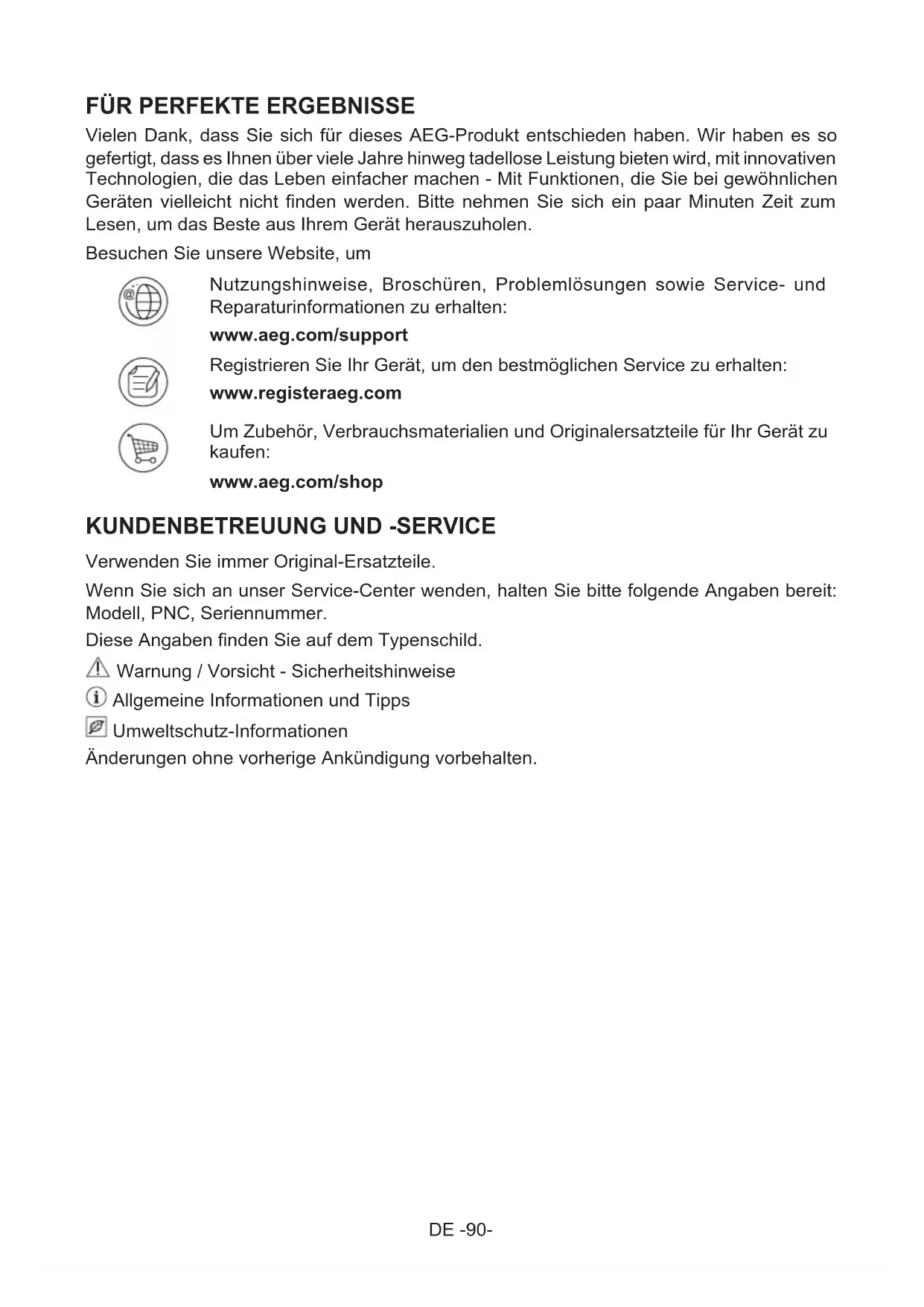 Vielen Dank, dass Sie sich für dieses AEG-Produkt entschieden haben. Wir haben es so gefertigt, dass es Ihnen über viele Jahre hinweg tadellose Leistung bieten wird, mit innovativen Technologien, die das Leben einfacher machen - Mit Funktionen, die Sie bei gewöhnlichen Geräten vielleicht nicht finden werden. Bitte nehmen Sie sich ein paar Minuten Zeit zum Lesen, um das Beste aus Ihrem Gerät herauszuholen. Besuchen Sie unsere Website, um Nutzungshinweise, Broschüren, Problemlösungen sowie Service- und Reparaturinformationen zu erhalten: www.aeg.com/support Registrieren Sie Ihr Gerät, um den bestmöglichen Service zu erhalten: www.registeraeg.com Um Zubehör, Verbrauchsmaterialien und Originalersatzteile für Ihr Gerät zu kaufen: www.aeg.com/shop