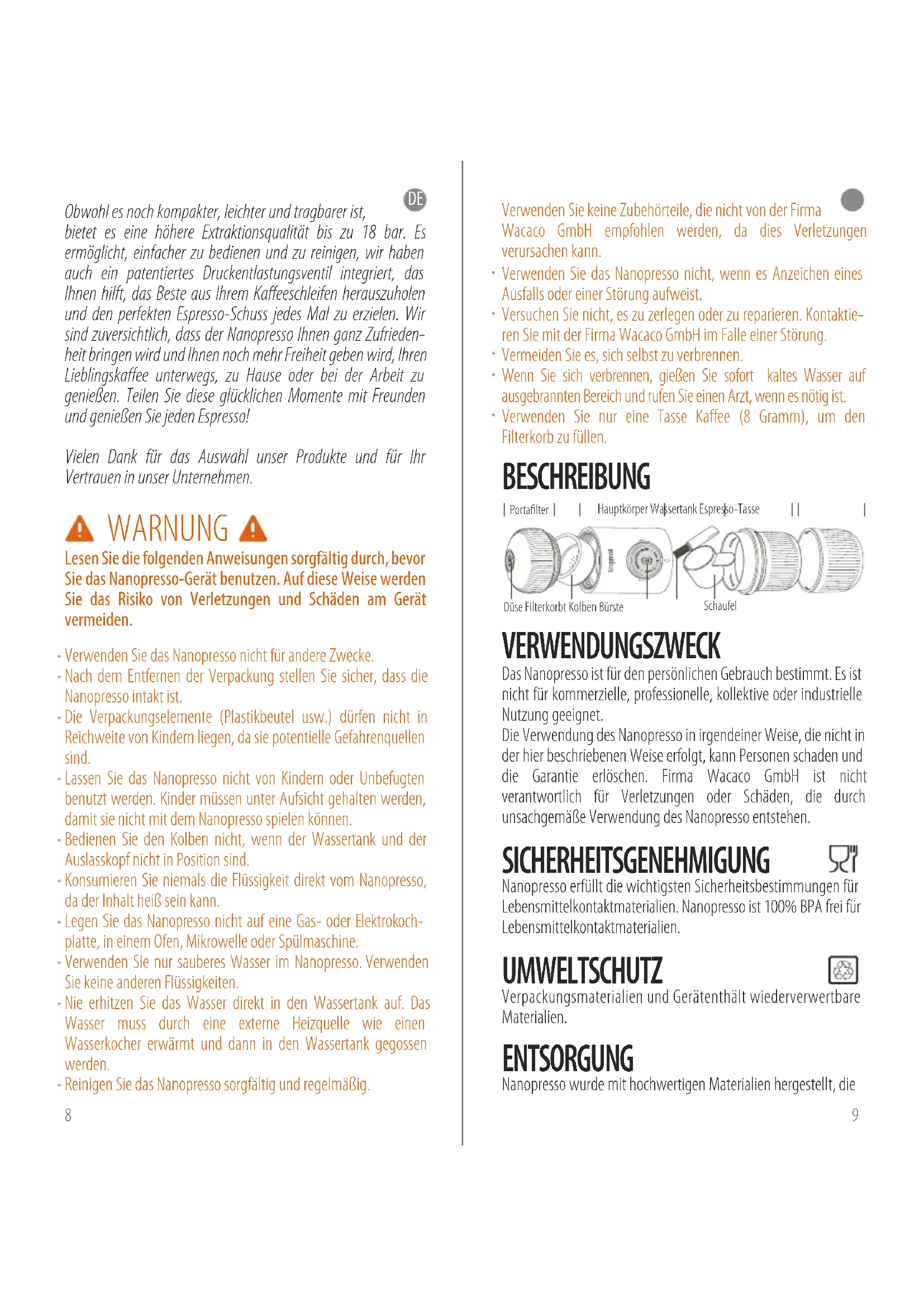 www.wacaco.com Share your experience on social medias by using #nanopresso.SchaufelPortafilter Hauptkörper Wassertank Espresso-Tasse Düse Filterkorbt Kolben Bürste Obwohl es noch kompakter, leichter und tragbarer ist, bietet es eine höhere Extraktionsqualität bis zu 18 bar. Es ermöglicht, einfacher zu bedienen und zu reinigen, wir haben auch ein patentiertes Druckentlastungsventil integriert, das Ihnen hilft, das Beste aus Ihrem Kaffeeschleifen herauszuholen und den perfekten Espresso-Schuss jedes Mal zu erzielen. Wir sind zuversichtlich, dass der Nanopresso Ihnen ganz Zufrieden- heit bringen wird und Ihnen noch mehr Freiheit geben wird, Ihren Lieblingskaffee unterwegs, zu Hause oder bei der Arbeit zu genießen. Teilen Sie diese glücklichen Momente mit Freunden und genießen Sie jeden Espresso! Vielen Dank für das Auswahl unser Produkte und für Ihr Vertrauen in unser Unternehmen. WARNUNG Lesen Sie die folgenden Anweisungen sorgfältig durch, bevor Sie das Nanopresso-Gerät benutzen. Auf diese Weise werden Sie das Risiko von Verletzungen und Schäden am Gerät vermeiden. Verwenden Sie das Nanopresso nicht für andere Zwecke. Nach dem Entfernen der Verpackung stellen Sie sicher, dass die Nanopresso intakt ist. Die Verpackungselemente (Plastikbeutel usw.) dürfen nicht in Reichweite von Kindern liegen, da sie potentielle Gefahrenquellen sind. Lassen Sie das Nanopresso nicht von Kindern oder Unbefugten benutzt werden. Kinder müssen unter Aufsicht gehalten werden, damit sie nicht mit dem Nanopresso spielen können. Bedienen Sie den Kolben nicht, wenn der Wassertank und der Auslasskopf nicht in Position sind. Konsumieren Sie niemals die Flüssigkeit direkt vom Nanopresso, da der Inhalt heiß sein kann. Legen Sie das Nanopresso nicht auf eine Gas- oder Elektrokoch- platte, in einem Ofen, Mikrowelle oder Spülmaschine. Verwenden Sie nur sauberes Wasser im Nanopresso. Verwenden Sie keine anderen Flüssigkeiten. Nie erhitzen Sie das Wasser direkt in den Wassertank auf. Das Wasser muss durch eine externe Heizquelle wie einen Wasserkocher erwärmt und dann in den Wassertank gegossen werden. Reinigen Sie das Nanopresso sorgfältig und regelmäßig. Verwenden Sie keine Zubehörteile, die nicht von der Firma Wacaco GmbH empfohlen werden, da dies Verletzungen verursachen kann. Verwenden Sie das Nanopresso nicht, wenn es Anzeichen eines Ausfalls oder einer Störung aufweist. Versuchen Sie nicht, es zu zerlegen oder zu reparieren. Kontaktie- ren Sie mit der Firma Wacaco GmbH im Falle einer Störung. Vermeiden Sie es, sich selbst zu verbrennen. Wenn Sie sich verbrennen, gießen Sie sofort kaltes Wasser auf ausgebrannten Bereich und rufen Sie einen Arzt, wenn es nötig ist. Verwenden Sie nur eine Tasse Kaffee (8 Gramm), um den Filterkorb zu füllen. BESCHREIBUNG VERWENDUNGSZWECK Das Nanopresso ist für den persönlichen Gebrauch bestimmt. Es ist nicht für kommerzielle, professionelle, kollektive oder industrielle Nutzung geeignet. Die Verwendung des Nanopresso in irgendeiner Weise, die nicht in der hier beschriebenen Weise erfolgt, kann Personen schaden und die Garantie erlöschen. Firma Wacaco GmbH ist nicht verantwortlich für Verletzungen oder Schäden, die durch unsachgemäße Verwendung des Nanopresso entstehen. SICHERHEITSGENEHMIGUNG Nanopresso erfüllt die wichtigsten Sicherheitsbestimmungen für Lebensmittelkontaktmaterialien. Nanopresso ist 100% BPA frei für Lebensmittelkontaktmaterialien. UMWELTSCHUTZ Verpackungsmaterialien und Gerätenthält wiederverwertbare Materialien. ENTSORGUNG Nanopresso wurde mit hochwertigen Materialien hergestellt, die DE DE 8 9Schrauben Sie den Wassertank ab.