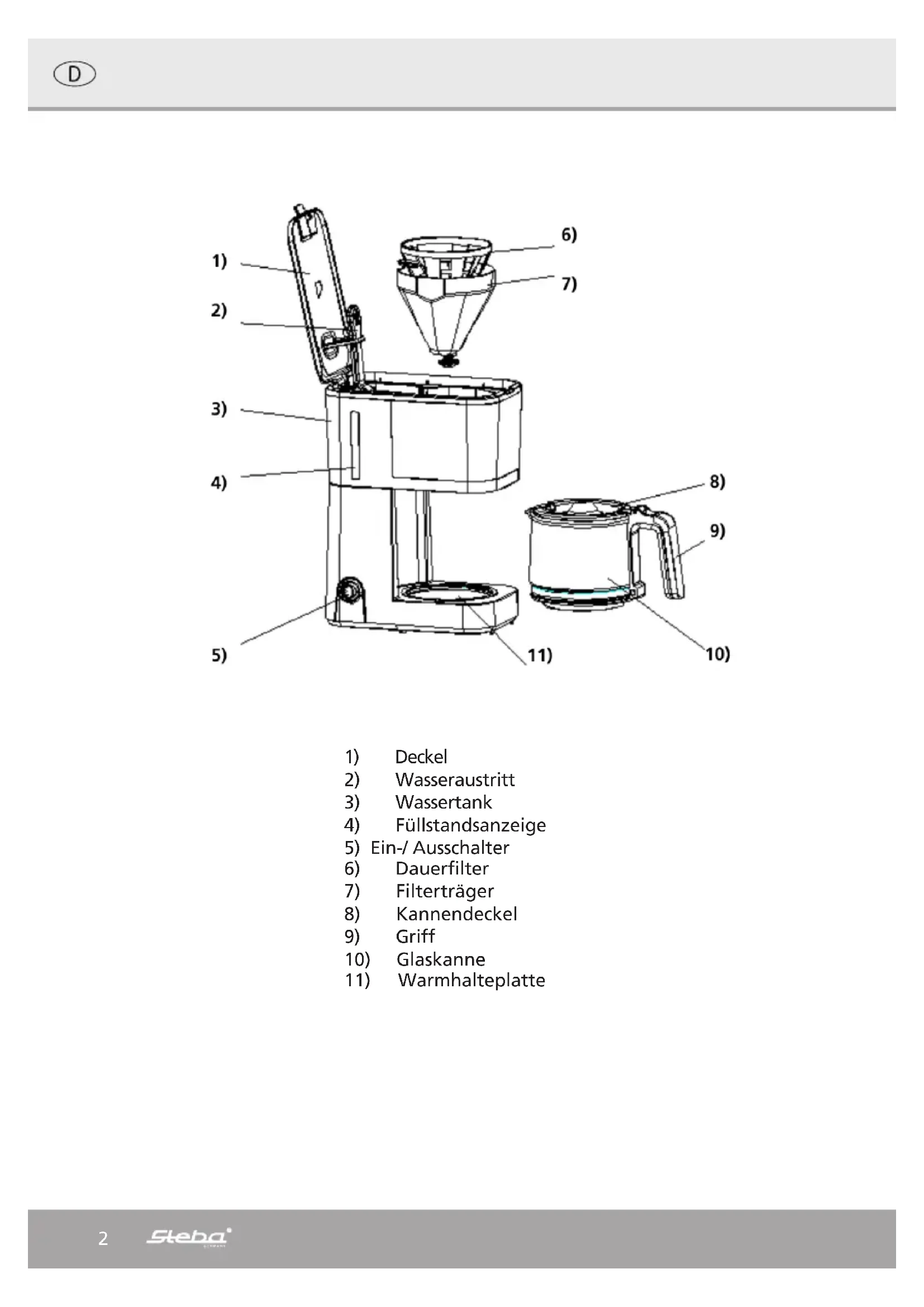 Gerät nicht genutzt wird. Achtung: Der Kaffee ist nach dem Brühvorgang sehr heiß. Verbrühungs- gefahr! Auch das Kaffeepulver kann nach dem Brühvorgang sehr heiß sein. Beim Entfernen bitte beachten. Tipp: Den Kaffeesatz nach dem Erkalten aus der Maschine entfernen, damit die Maschine hygienisch bleibt. Der Kaffeesatz kann in den Biomüll geben werden. Tipps für die Kaffeezubereitung ∙ Eine saubere Kaffeemaschine ist wichtig um guten Kaffee zu machen. Bitte reini- gen Sie Ihre Maschine regelmäßig. ∙ Benutzen Sie nur sauberes, klares, kühles Wasser um Kaffee zuzubereiten. ∙ Lagern Sie das Kaffeepulver an einen trockenen, kühlen Platz. Sorgen Sie dafür, dass Kaffeeverpackungen nach dem Öffnen wieder gut verschlossen werden. ∙ Benutzen Sie Kaffeepulver nur einmal. Auch wieder aufgewärmter Kaffee verliert stark an Geschmack. ∙ Je schneller der Kaffee getrunken wird, desto besser schmeckt dieser. ∙ Wenn Sie die Kaffeekanne vor dem Brühvorgang heiß ausspülen, dann bleibt der Kaffee länger warm.10 Korrekte Entsorgung dieses Produkts: Ausgediente Geräte sofort unbrauchbar machen. Innerhalb der EU weist dieses Symbol darauf hin, dass dieses Produkt nicht über den Hausmüll entsorgt werden darf. Altgeräte enthalten wertvolle recy- clingfähige Materialien, die einer Wiederverwertung zugeführt werden soll- ten und um der Umwelt bzw. der menschlichen Gesundheit nicht durch un- kontrollierte Müllbeseitigung zu schaden. Bitte entsorgen Sie Altgeräte deshalb über geeignete Sammelsysteme oder senden Sie das Gerät zur Entsorgung an die Stelle, bei der Sie es gekauft haben. Diese wird dann das Gerät der stofflichen Verwertung zuführen. Verpackungs-Entsorgung Wenn möglich heben Sie die Verpackung auf um im Falle einer Garantie das Gerät zurückschicken zu können. Verpackungsmaterial nicht einfach wegwerfen, sondern der Wiederverwertung zuführen. Papier-, Pappe- und Wellpappeverpackungen bei Altpapiersammelstellen abgeben. Kunststoffverpackungsteile und Folien sollten ebenfalls in die dafür vorgesehenen Sammelbehälter gegeben werden. In den Beispielen für die Kunststoffkennzeichnung steht: PE für Polyethylen, die Kennziffer 02 für PE-HD, 04 für PE-LD, PP für Poly- propylen, PS für Polystyrol. Kundenservice: Sollte Ihr Gerät wider Erwarten einmal den Kundendienst benötigen, wenden Sie sich bitte an nachfolgende Anschrift. Wir werden dann im Garantiefall die Abholung veranlassen. Das Gerät muss transportfähig verpackt sein. Unfreie Pakete können nicht angenommen werden! STEBA Elektrogeräte GmbH & Co KG Pointstr. 2, 96129 Strullendorf / Germany Vertrieb-Tel.: 09543 / 449-17 / -18, Service-Tel.: 09543 / 449-44, Fax: 09543 / 449-19 E-Mail: elektro@steba.com Internet: http://www.steba.com Achtung! Elektrogeräte dürfen nur durch Elektro-Fachkräfte repariert werden, da durch unsachgemäße Reparaturen erhebliche Folgeschäden entstehen können.11