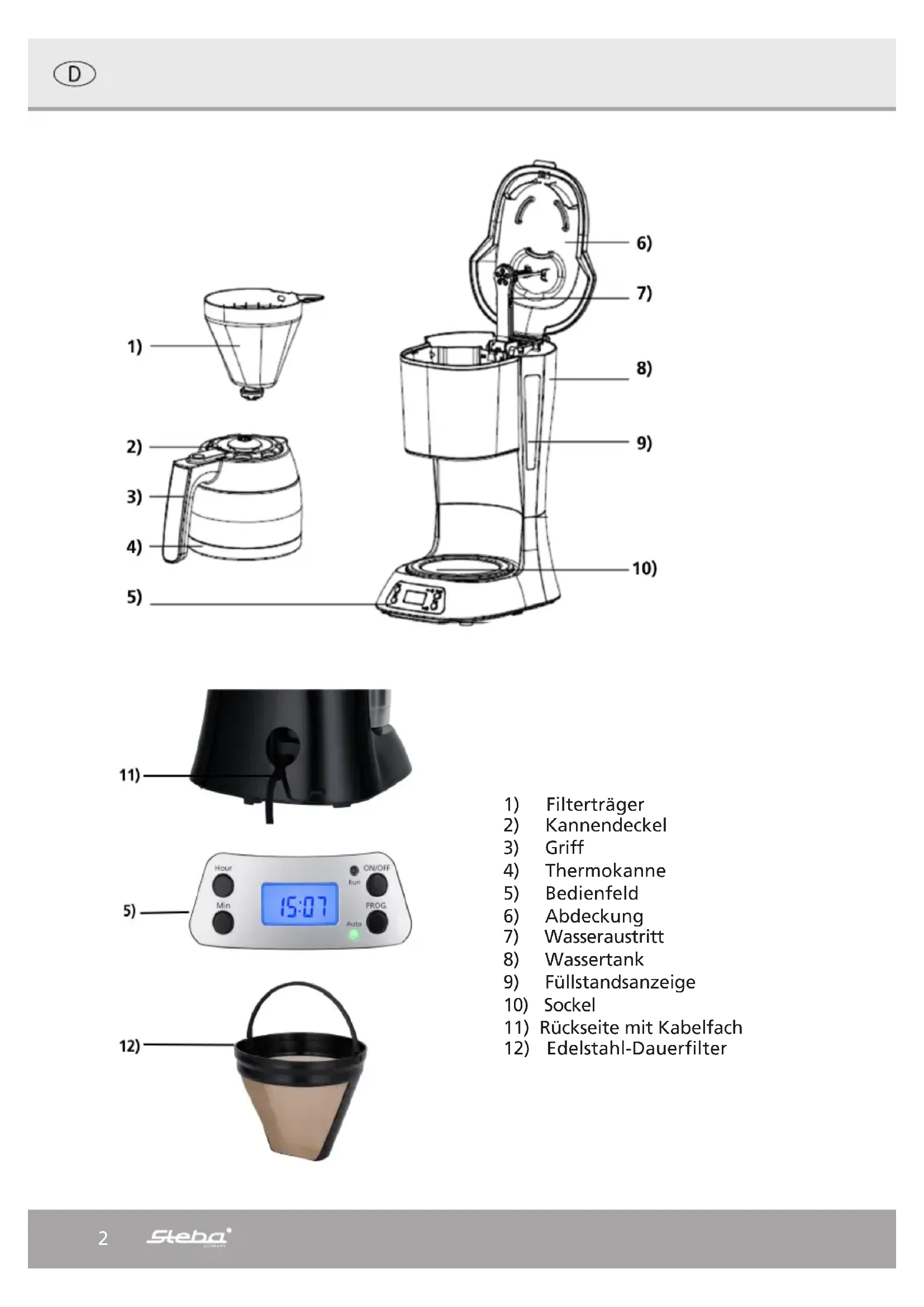 Display wird die aktuelle Uhrzeit angezeigt. Durch drücken der Taste „Prog“ kann die vorausgewählte Startzeit angezeigt werden. Bemerkung: Das automatische Programm kann durch das einmalige Drücken des „ON/OFF“ Knopfes abgebrochen werden. Wenn der „ON/OFF“ Knopf zweimal gedrückt wird, startet die Kaffeemaschine den Brühvorgang augenblicklich. Soll die Startzeit verändert werden, dann sollte die Programmierung abgebrochen und die in diesem Abschnitt genannten Stufen von 1-5 wiederholt werden.10 Tipps für die Kaffeezubereitung ∙ Eine saubere Kaffeemaschine ist wichtig um guten Kaffee zu machen. Bitte reini- gen Sie Ihre Maschine regelmäßig. ∙ Benutzen Sie nur sauberes, klares, kühles Wasser um Kaffee zuzubereiten. ∙ Lagern Sie das Kaffeepulver an einen trockenen, kühlen Platz. Sorgen Sie dafür, dass Kaffeeverpackungen nach dem Öffnen wieder gut verschlossen werden. ∙ Benutzen Sie Kaffeepulver nur einmal. Auch wieder aufgewärmter Kaffee verliert stark an Geschmack. ∙ Je schneller der Kaffee getrunken wird, desto besser schmeckt dieser. ∙ Wenn Sie die Kaffeekanne vor dem Brühvorgang heiß ausspülen, dann bleibt der Kaffee länger warm.11 Korrekte Entsorgung dieses Produkts: Ausgediente Geräte sofort unbrauchbar machen. Innerhalb der EU weist dieses Symbol darauf hin, dass dieses Produkt nicht über den Hausmüll entsorgt werden darf. Altgeräte enthalten wertvolle recy- clingfähige Materialien, die einer Wiederverwertung zugeführt werden soll- ten und um der Umwelt bzw. der menschlichen Gesundheit nicht durch un- kontrollierte Müllbeseitigung zu schaden. Bitte entsorgen Sie Altgeräte deshalb über geeignete Sammelsysteme oder senden Sie das Gerät zur Entsorgung an die Stelle, bei der Sie es gekauft haben. Diese wird dann das Gerät der stofflichen Verwertung zuführen. Verpackungs-Entsorgung Wenn möglich heben Sie die Verpackung auf um im Falle einer Garantie das Gerät zurückschicken zu können. Verpackungsmaterial nicht einfach wegwerfen, sondern der Wiederverwertung zuführen. Papier-, Pappe- und Wellpappeverpackungen bei Altpapiersammelstellen abgeben. Kunststoffverpackungsteile und Folien sollten ebenfalls in die dafür vorgesehenen Sammelbehälter gegeben werden. In den Beispielen für die Kunststoffkennzeichnung steht: PE für Polyethylen, die Kennziffer 02 für PE-HD, 04 für PE-LD, PP für Poly- propylen, PS für Polystyrol. Kundenservice: Sollte Ihr Gerät wider Erwarten einmal den Kundendienst benötigen, wenden Sie sich bitte an nachfolgende Anschrift. Wir werden dann im Garantiefall die Abholung veranlassen. Das Gerät muss transportfähig verpackt sein. Unfreie Pakete können nicht angenommen werden! STEBA Elektrogeräte GmbH & Co KG Pointstr. 2, 96129 Strullendorf / Germany Vertrieb-Tel.: 09543 / 449-17 / -18, Service-Tel.: 09543 / 449-44, Fax: 09543 / 449-19 E-Mail: elektro@steba.com Internet: http://www.steba.com Achtung! Elektrogeräte dürfen nur durch Elektro-Fachkräfte repariert werden, da durch unsachgemäße Reparaturen erhebliche Folgeschäden entstehen können.12