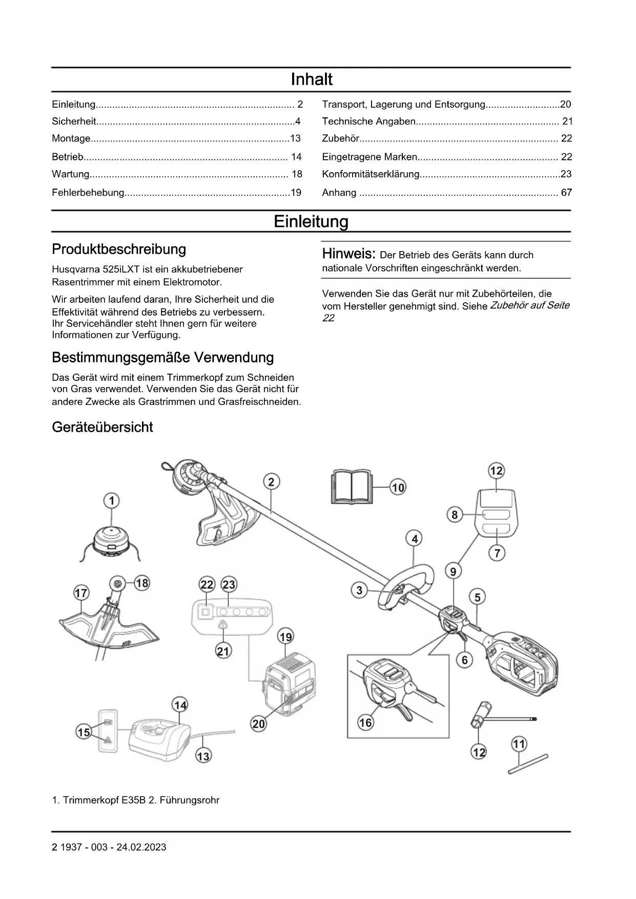 - Anhang Einleitung Produktbeschreibung Husqvarna 525iLXT ist ein akkubetriebenerRasentrimmer mit einem Elektromotor.Wir arbeiten laufend daran, Ihre Sicherheit und dieEffektivität während des Betriebs zu verbessern.Ihr Servicehändler steht Ihnen gern für weitereInformationen zur Verfügung. Bestimmungsgemäße Verwendung Das Gerät wird mit einem Trimmerkopf zum Schneidenvon Gras verwendet. Verwenden Sie das Gerät nicht fürandere Zwecke als Grastrimmen und Grasfreischneiden. Hinweis: Der Betrieb des Geräts kann durch nationale Vorschriften eingeschränkt werden.Verwenden Sie das Gerät nur mit Zubehörteilen, dievom Hersteller genehmigt sind. Siehe Zubehör auf Seite p. 67