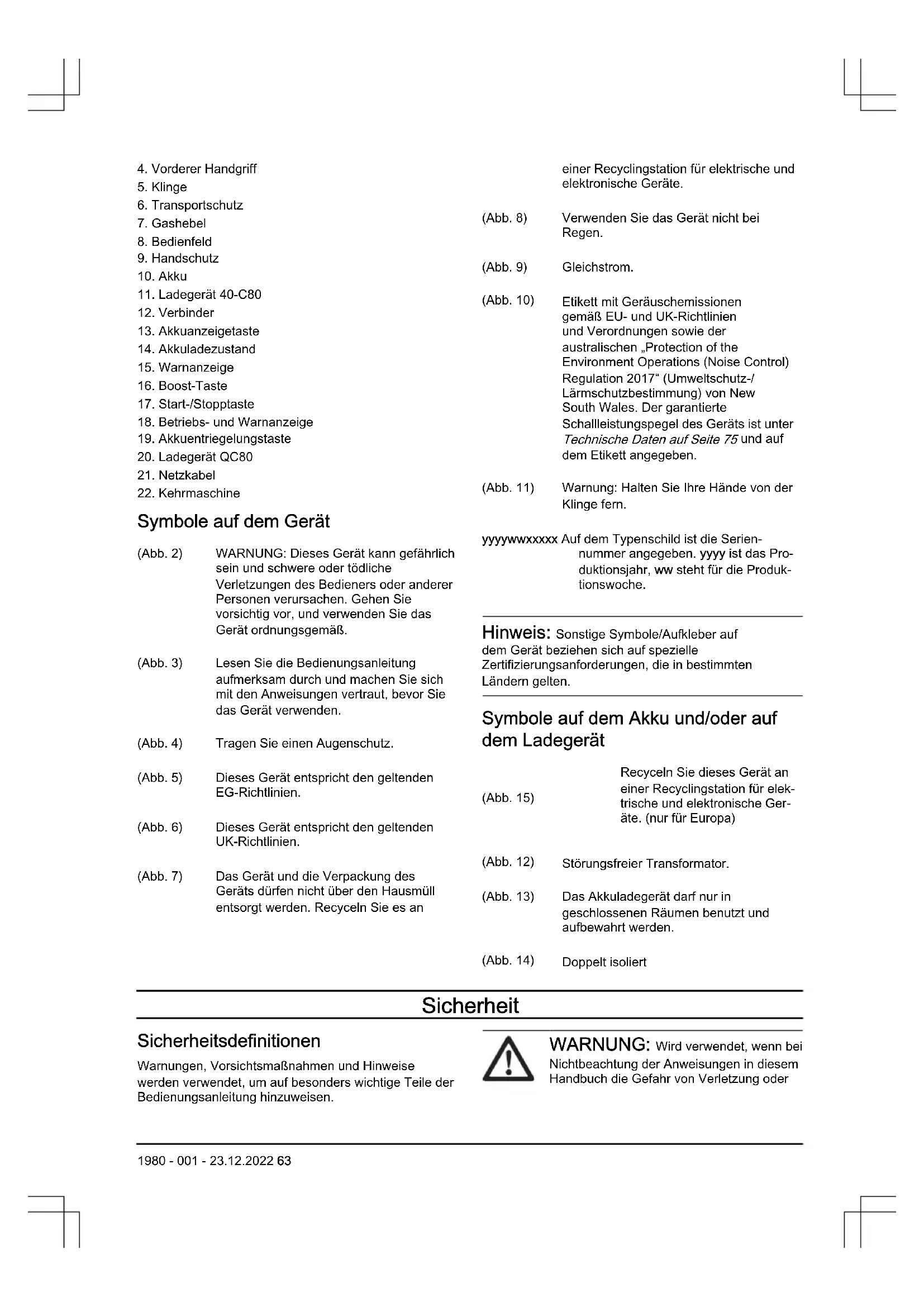 Symbole auf dem Gerät (Abb. 2) WARNUNG: Dieses Gerät kann gefährlich sein und schwere oder tödliche Verletzungen des Bedieners oder anderer Personen verursachen. Gehen Sie vorsichtig vor, und verwenden Sie das Gerät ordnungsgemäß. (Abb. 3) Lesen Sie die Bedienungsanleitung aufmerksam durch und machen Sie sich mit den Anweisungen vertraut, bevor Sie das Gerät verwenden. (Abb. 4) Tragen Sie einen Augenschutz. (Abb. 5) Dieses Gerät entspricht den geltenden EG-Richtlinien. (Abb. 6) Dieses Gerät entspricht den geltenden UK-Richtlinien. (Abb. 7) Das Gerät und die Verpackung des Geräts dürfen nicht über den Hausmüll entsorgt werden. Recyceln Sie es an einer Recyclingstation für elektrische und elektronische Geräte. (Abb. 8) Verwenden Sie das Gerät nicht bei Regen. (Abb. 9) Gleichstrom. (Abb. 10) Etikett mit Geräuschemissionen gemäß EU- und UK-Richtlinien und Verordnungen sowie der australischen „Protection of the Environment Operations (Noise Control) Regulation2017“ (Umweltschutz-/ Lärmschutzbestimmung) von New South Wales. Der garantierte Schallleistungspegel des Geräts ist unter Technische Daten auf Seite 75 und auf dem Etikett angegeben. (Abb. 11) Warnung: Halten Sie Ihre Hände von der Klinge fern. yyyywwxxxxx Auf dem Typenschild ist die Serien- nummer angegeben. yyyy ist das Pro- duktionsjahr, ww steht für die Produk- tionswoche. Hinweis: Sonstige Symbole/Aufkleber auf dem Gerät beziehen sich auf spezielle Zertifizierungsanforderungen, die in bestimmten Ländern gelten. Symbole auf dem Akku und/oder auf dem Ladegerät (Abb. 15) Recyceln Sie dieses Gerät an einer Recyclingstation für elek- trische und elektronische Ger- äte. (nur für Europa) (Abb. 12) Störungsfreier Transformator. (Abb. 13) Das Akkuladegerät darf nur in geschlossenen Räumen benutzt und aufbewahrt werden. (Abb. 14) Doppelt isoliert Sicherheit Sicherheitsdefinitionen Warnungen, Vorsichtsmaßnahmen und Hinweise werden verwendet, um auf besonders wichtige Teile der Bedienungsanleitung hinzuweisen. WARNUNG: Wird verwendet, wenn bei Nichtbeachtung der Anweisungen in diesem Handbuch die Gefahr von Verletzung oder 1980 - 001 - 23.12.2022 63Tod des Bedieners oder anderer Personen besteht. ACHTUNG: Wird verwendet, wenn bei Nichtbeachtung der Anweisungen in diesem Handbuch die Gefahr von Schäden am Gerät, an anderen Materialien oder in der Umgebung besteht. Hinweis: Für weitere Informationen, die in bestimmten Situationen nötig sind. Allgemeine Sicherheitshinweise für Elektrowerkzeuge WARNUNG: Lesen Sie sämtliche Sicherheitshinweise und Anweisungen durch. Wenn Sie die Warn- und Sicherheitshinweise nicht befolgen, kann dies zu Elektroschock, Brand und/oder schweren Verletzungen führen. Hinweis: Bewahren Sie alle Warnhinweise und Anweisungen für spätere Referenzzwecke auf. Der Begriff „Elektrowerkzeug“ in den Warnhinweisen bezieht sich auf ein Elektrowerkzeug mit Netzbetrieb (über ein Kabel) oder mit Akkubetrieb (kabellos). Sicherheit im Arbeitsbereich
