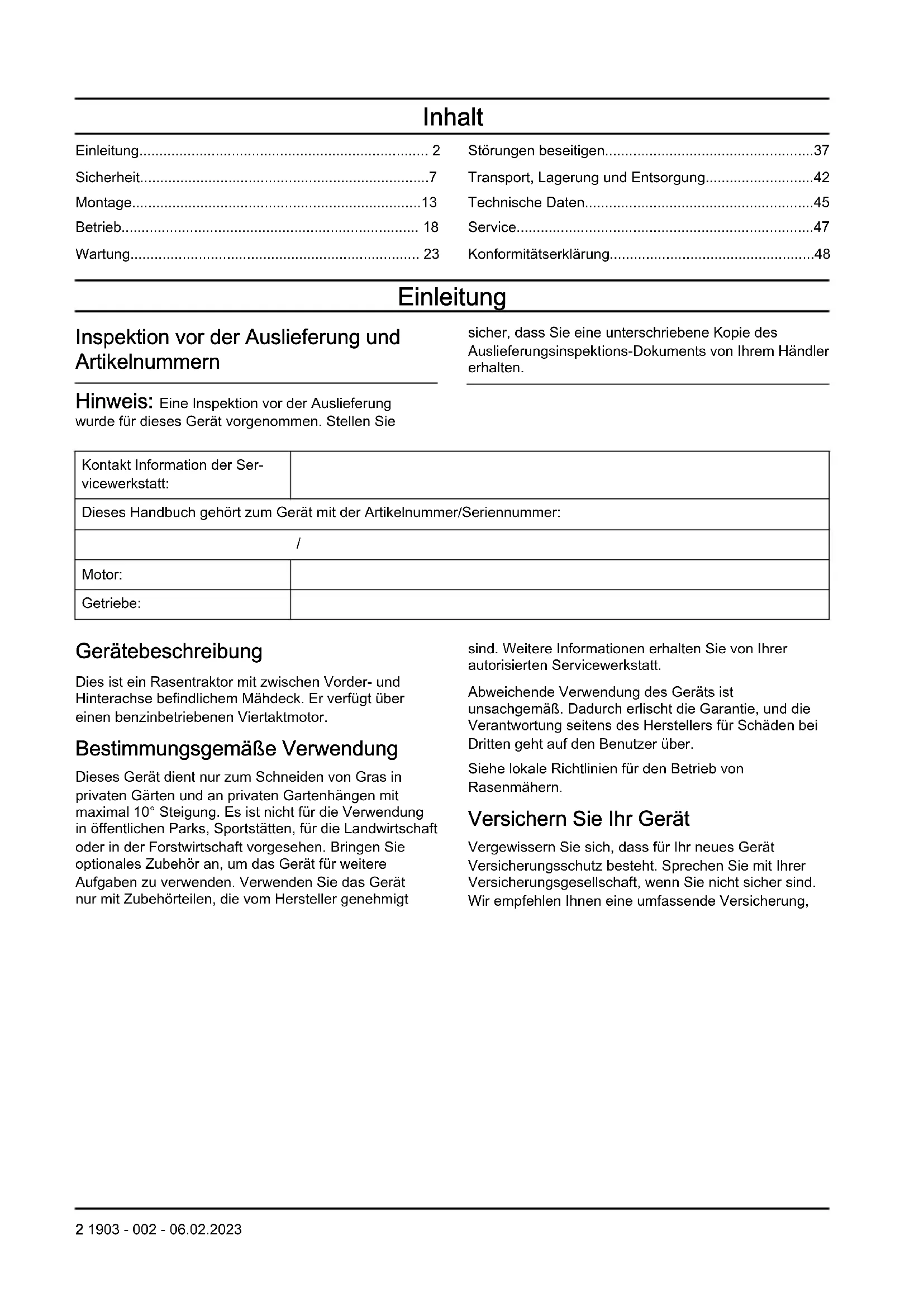 Motor: Getriebe: Gerätebeschreibung Dies ist ein Rasentraktor mit zwischen Vorder- und Hinterachse befindlichem Mähdeck. Er verfügt über einen benzinbetriebenen Viertaktmotor. Bestimmungsgemäße Verwendung Dieses Gerät dient nur zum Schneiden von Gras in privaten Gärten und an privaten Gartenhängen mit maximal 10° Steigung. Es ist nicht für die Verwendung in öffentlichen Parks, Sportstätten, für die Landwirtschaft oder in der Forstwirtschaft vorgesehen. Bringen Sie optionales Zubehör an, um das Gerät für weitere Aufgaben zu verwenden. Verwenden Sie das Gerät nur mit Zubehörteilen, die vom Hersteller genehmigt sind. Weitere Informationen erhalten Sie von Ihrer autorisierten Servicewerkstatt. Abweichende Verwendung des Geräts ist unsachgemäß. Dadurch erlischt die Garantie, und die Verantwortung seitens des Herstellers für Schäden bei Dritten geht auf den Benutzer über. Siehe lokale Richtlinien für den Betrieb von Rasenmähern. Versichern Sie Ihr Gerät Vergewissern Sie sich, dass für Ihr neues Gerät Versicherungsschutz besteht. Sprechen Sie mit Ihrer Versicherungsgesellschaft, wenn Sie nicht sicher sind. Wir empfehlen Ihnen eine umfassende Versicherung, 2 1903 - 002 - 06.02.2023die Dritte, Feuer, Beschädigung, Diebstahl und Haftung einschließt. Geräteübersicht Geräteübersicht (TC 112)