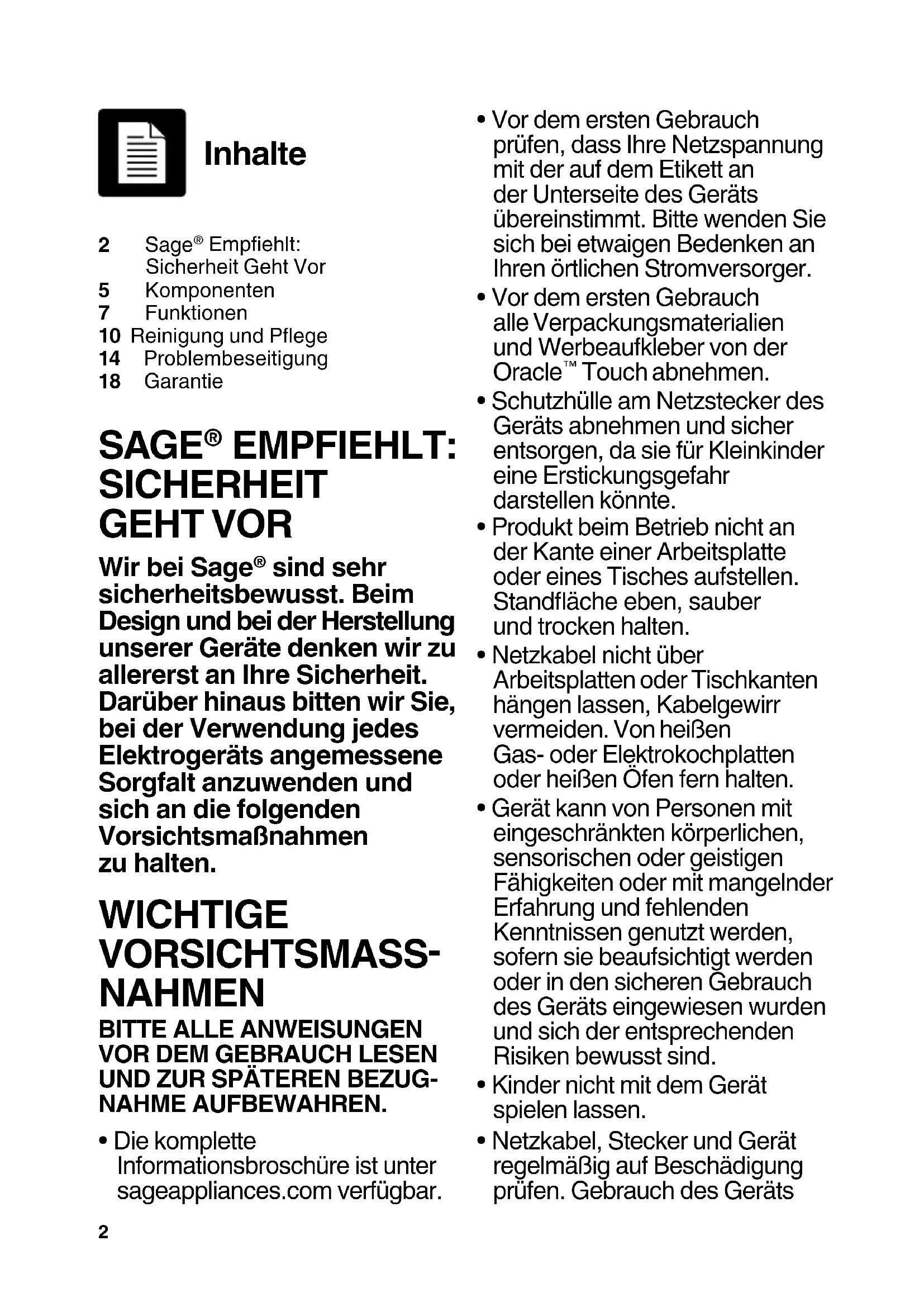- Die komplette Informationsbroschüre ist unter sageappliances.com verfügbar.
