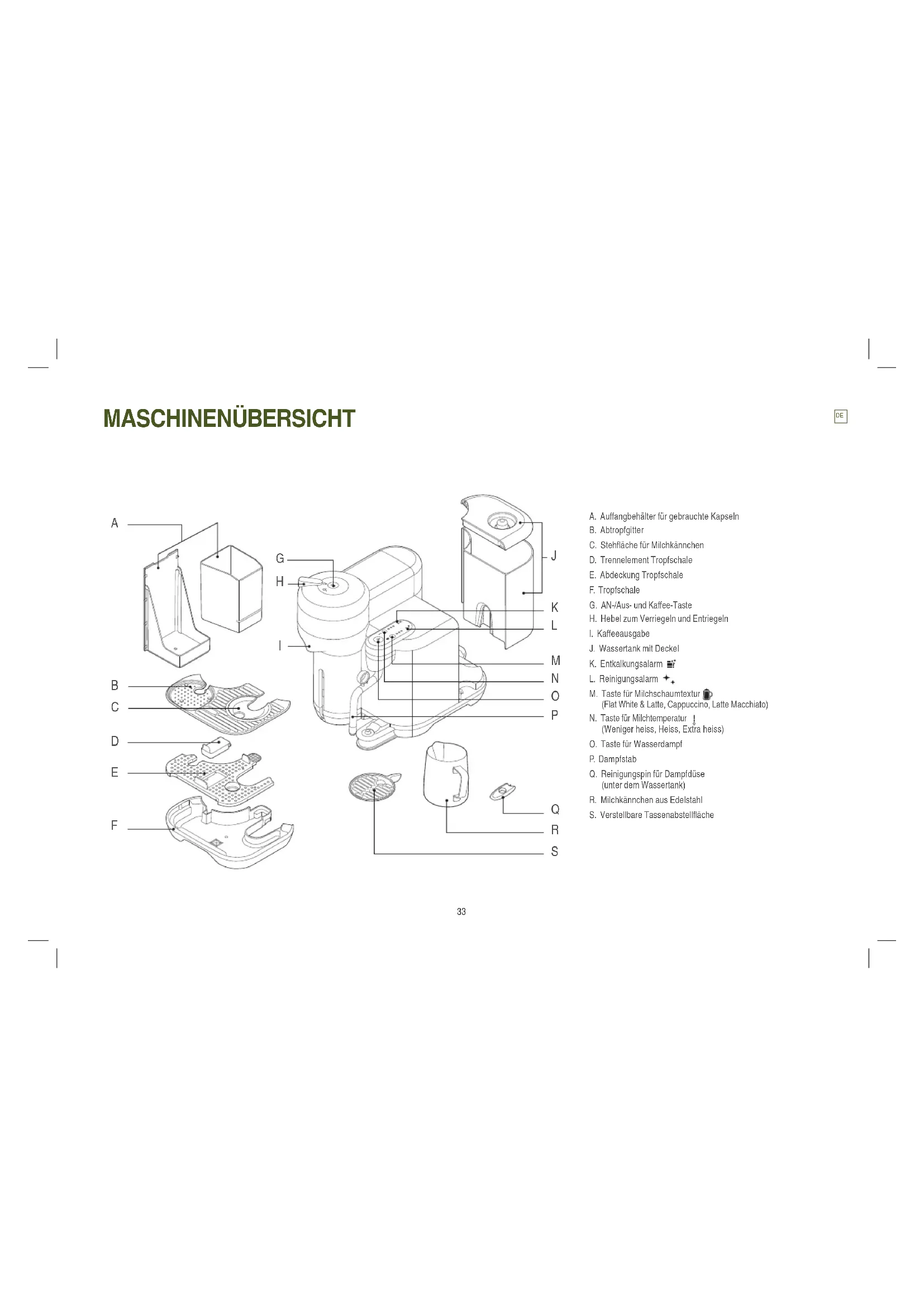 MASCHINENÜBERSICHT A. AuangbehälterfürgebrauchteKapseln B. Abtropfgitter C. StehächefürMilchkännchen D. TrennelementTropfschale E. AbdeckungTropfschale F. Tropfschale G. AN-/Aus-undKaee-Taste H. Hebel zum Verriegeln und Entriegeln