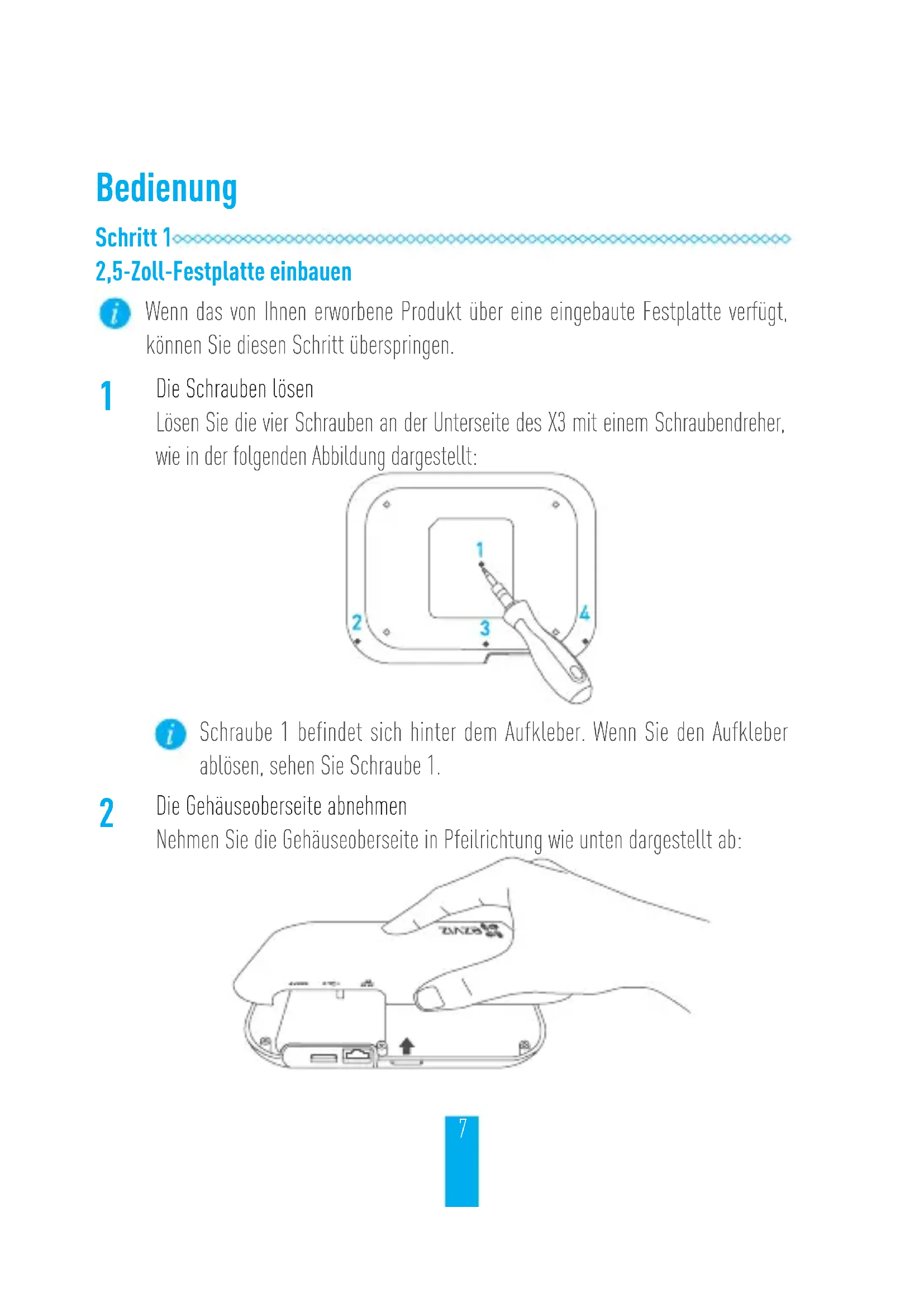 USB Interface7 Bedienung Schritt 1 2,5-Zoll-Festplatte einbauen Wenn das von Ihnen erworbene Produkt über eine eingebaute Festplatte verfügt, können Sie diesen Schritt überspringen.