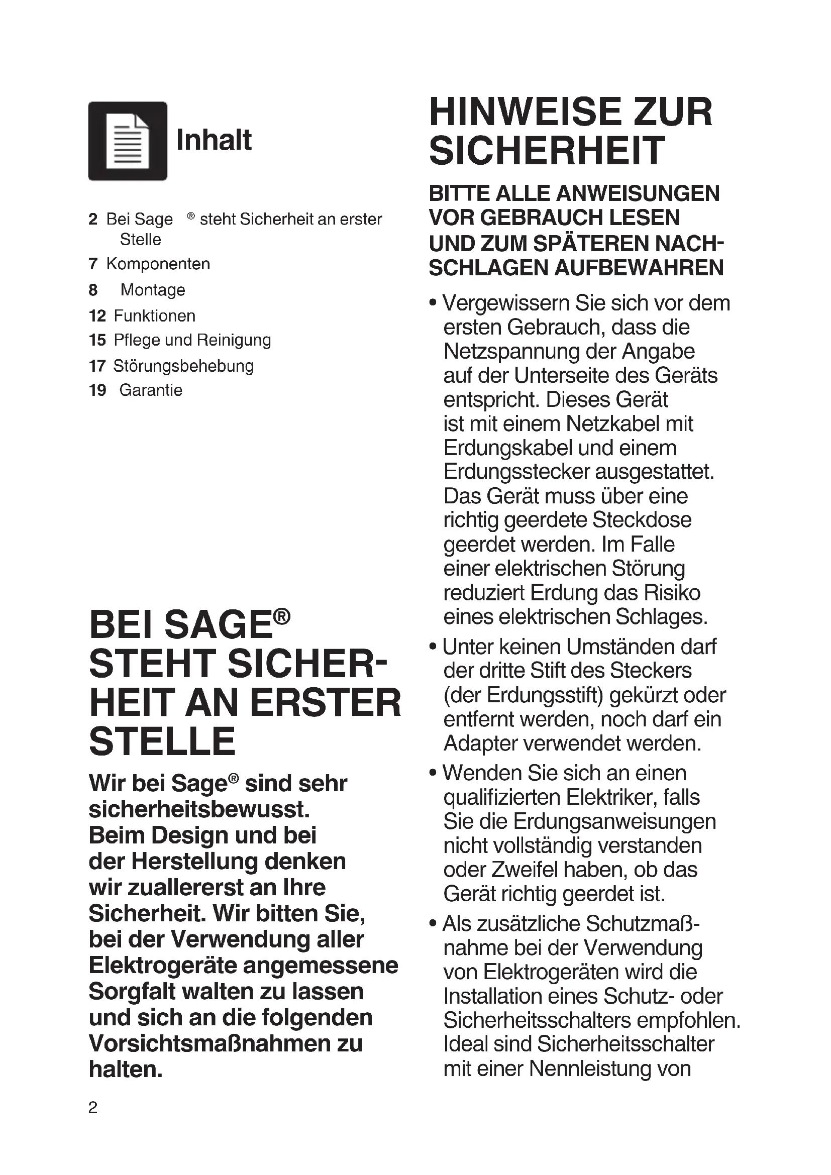 - Als zusätzliche Schutzmaß- nahme bei der Verwendung von Elektrogeräten wird die Installation eines Schutz- oder Sicherheitsschalters empfohlen. Ideal sind Sicherheitsschalter mit einer Nennleistung von Inhalt 2 Bei Sage steht Sicherheit an erster Stelle7 Komponenten8 Montage12 Funktionen15 Pege und Reinigung17 Störungsbehebung19 Garantie3