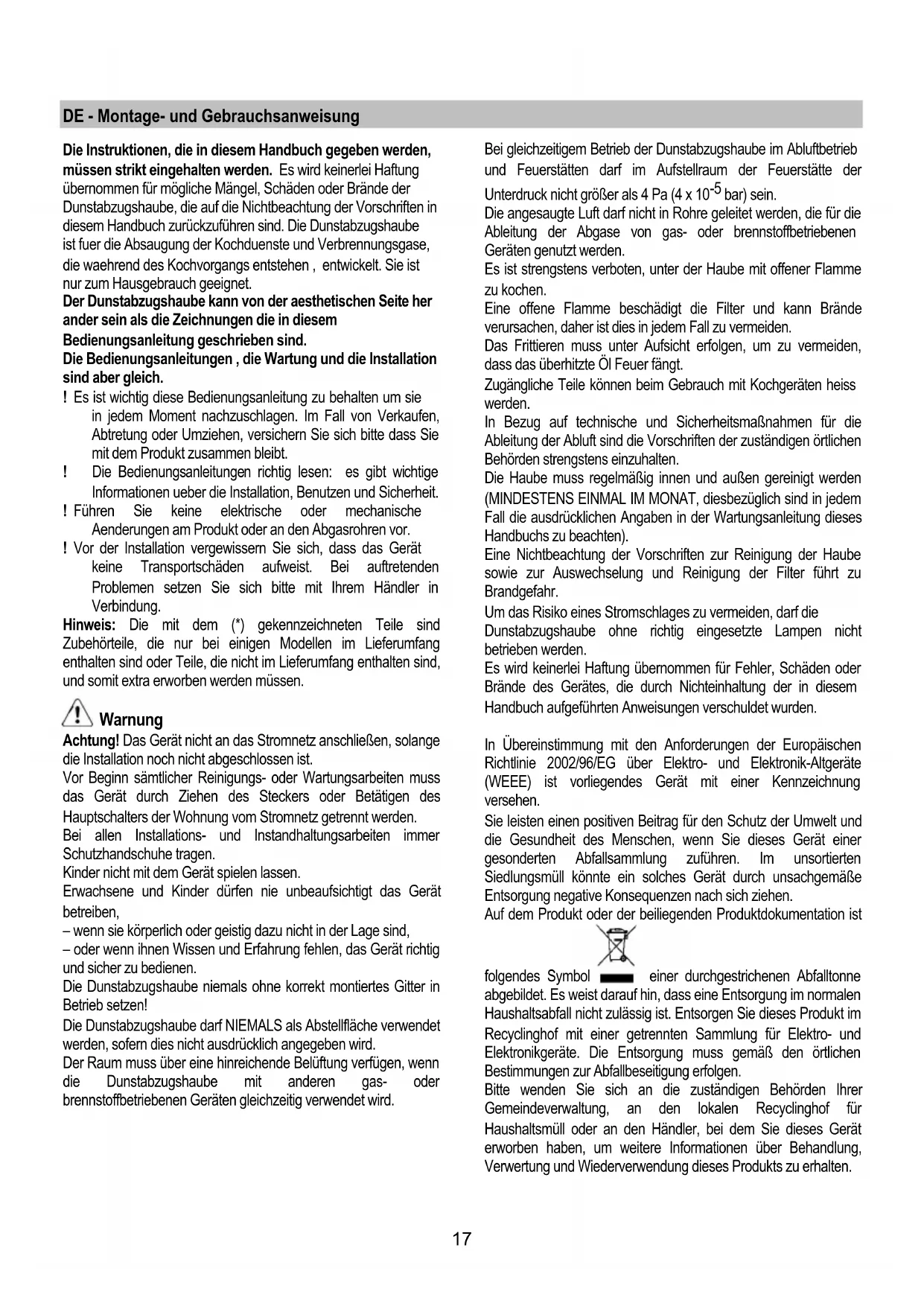 bar) sein. Die angesaugte Luft darf nicht in Rohre geleitet werden, die für die Ableitung der Abgase von gas- oder brennstoffbetriebenen Geräten genutzt werden. Es ist strengstens verboten, unter der Haube mit offener Flamme zu kochen. Eine offene Flamme beschädigt die Filter und kann Brände verursachen, daher ist dies in jedem Fall zu vermeiden. Das Frittieren muss unter Aufsicht erfolgen, um zu vermeiden, dass das überhitzte Öl Feuer fängt. Zugängliche Teile können beim Gebrauch mit Kochgeräten heiss werden. In Bezug auf technische und Sicherheitsmaßnahmen für die Ableitung der Abluft sind die Vorschriften der zuständigen örtlichen Behörden strengstens einzuhalten. Die Haube muss regelmäßig innen und außen gereinigt werden (MINDESTENS EINMAL IM MONAT, diesbezüglich sind in jedem Fall die ausdrücklichen Angaben in der Wartungsanleitung dieses Handbuchs zu beachten). Eine Nichtbeachtung der Vorschriften zur Reinigung der Haube sowie zur Auswechselung und Reinigung der Filter führt zu Brandgefahr. Um das Risiko eines Stromschlages zu vermeiden, darf die Dunstabzugshaube ohne richtig eingesetzte Lampen nicht betrieben werden. Es wird keinerlei Haftung übernommen für Fehler, Schäden oder Brände des Gerätes, die durch Nichteinhaltung der in diesem Handbuch aufgeführten Anweisungen verschuldet wurden. In Übereinstimmung mit den Anforderungen der Europäischen Richtlinie 2002/96/EG über Elektro- und Elektronik-Altgeräte (WEEE) ist vorliegendes Gerät mit einer Kennzeichnung versehen. Sie leisten einen positiven Beitrag für den Schutz der Umwelt und die Gesundheit des Menschen, wenn Sie dieses Gerät einer gesonderten Abfallsammlung zuführen. Im unsortierten Siedlungsmüll könnte ein solches Gerät durch unsachgemäße Entsorgung negative Konsequenzen nach sich ziehen. Auf dem Produkt oder der beiliegenden Produktdokumentation ist folgendes Symbol einer durchgestrichenen Abfalltonne abgebildet. Es weist darauf hin, dass eine Entsorgung im normalen Haushaltsabfall nicht zulässig ist. Entsorgen Sie dieses Produkt im Recyclinghof mit einer getrennten Sammlung für Elektro- und Elektronikgeräte. Die Entsorgung muss gemäß den örtlichen Bestimmungen zur Abfallbeseitigung erfolgen. Bitte wenden Sie sich an die zuständigen Behörden Ihrer Gemeindeverwaltung, an den lokalen Recyclinghof für Haushaltsmüll oder an den Händler, bei dem Sie dieses Gerät erworben haben, um weitere Informationen über Behandlung, Verwertung und Wiederverwendung dieses Produkts zu erhalten.18 Betriebsart Die Haube kann sowohl als Abluftgërat als auch als Umluftgërat eingesetzt werden. Abluftbetrieb Die Luft wird mit Hilfe eines an den Abluftstutzen anzubringenden Rohres ins Freie geleitet. Das Abluftrohr wird hierbei nicht geliefert und soll separat angekauft werden. Das Abluftrohr muß denselben Durchmesser wie der Abluftstutzen aufweisen. Das Abluftrohr muß muß in waagrechter Lage leicht nach oben geneigt sein (ca. 10%), damit die Luft ungehindert ins Freie abgeleitet werden kann. Note. Sollte die Dunstabzugshaube mit Aktiv-kohlefilter versehen sein, so muß dieser entfernt werden. Die Dunstabzugshaube an Abluftrohre und Wandabluftauslass mit dem selben Durchmesser wie der Luftausgang verbinden (Anschlussflansch). Die Benutzung von Rohren und Wandabluftauslass mit geringerem Durchmesser, verursacht eine Verringerung der Abluftleistung und eine drastische Zunahme der Geraeuschentwicklung. Jegliche Verantwortung diesbezueglich wird daher abgelenkt ! Ein möglichst kurzes Rohr verwenden. ! Ein Rohrsystem mit einer möglichst geringen Anzahl von Krümmungen verwenden (max. Winkel der Krümmung: 90°). ! Starke Änderungen des Rohrdurchmessers sind zu vermeiden . ! Die Innenfläche der Rohrs muss so glatt wie möglich sein