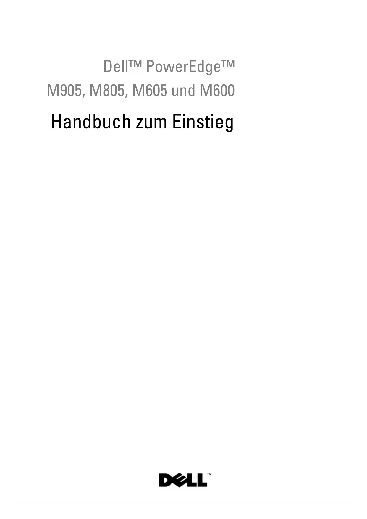 - Anmerkungen zur Version oder Infodateien sind eventuell eingeschlossen, um Aktualisierungen am System oder der Dokumentation in letzter Minute zu bieten, oder fortgeschrittenes technisches Referenzmaterial, das für erfahrene Benutzer oder Techniker beabsichtigt ist. Wie Sie technische Unterstützung erhalten Falls Sie einen Vorgang in diesem Handbuch nicht nachvollziehen können oder das System sich nicht wie erwartet verhält, nehmen Sie das Hardware- Benutzerhandbuch zur Hand. Dell bietet Unternehmenstraining und Zertifizierung an. Weitere Informationen finden Sie unter www.dell.com/training. Diese Dienstlei- stungen stehen unter Umständen nicht an allen Standorten zur Verfügung. Installation und Konfiguration VORSICHT: Bevor Sie mit dem folgenden Verfahren beginnen, lesen Sie zunächst die Sicherheitshinweise und wichtigen Vorschriften durch, die Sie zusammen mit Ihrem System erhalten haben. Weitere Informationen zu empfohlenen Sicherheits- maßnahmen finden Sie unter www.dell.com/regulatory_compliance. In diesem Abschnitt ist die erstmalige Einrichtung des Systems beschrieben. Auspacken des Systems Entnehmen Sie das System der Verpackung, und identifizieren Sie die einzelnen Komponenten. Bewahren Sie das Verpackungsmaterial für möglichen späteren Gebrauch auf. Installation des Systems in einem Rack Lesen Sie die Sicherheitshinweise in der Dokumentation zur Rack- Installation für das System, und installieren Sie dann das System im Rack. Wie Sie das System in einem Rack installieren, erfahren Sie in der Dokumentation zur Rack-Installation. Richtlinien zur Stromversorgung und Kühlung finden Sie in der Kapazitäts-Planungshilfe für Rack-Installationen unter www.dell.com.78 Handbuch zum Einstieg Installieren der Blades Beginnen Sie oben mit dem Einsetzen der Module, und schieben Sie sie von links nach rechts in das Gehäuse. Wenn das Blade-Modul sicher im Gehäuse sitzt, springt der Griff wieder in die geschlossene Position.Handbuch zum Einstieg 79 Anschließen des CMC- und des KVM-Moduls Verbinden Sie das Verwaltungssystem über das serielle Kabel und das Netzwerkkabel mit dem DRAC/MC-Modul. Wenn ein optionales zweites CMC-Modul installiert ist, schließen Sie es ebenfalls an. (Wenn Ihr Gehäuse mit vorinstallierten Blade-Modulen des Typs M805 oder M905 geliefert wurde, ist es mit der Firmwareversion 1.2 oder einer höheren Version ausgerüstet.) Schließen Sie Tastatur, Maus und Monitor an das optionale iKVM-Modul an. Anschließen des Systems an die Stromversorgung Verbinden Sie die Netzstromkabel mit den Systemnetzteilen. HINWEIS: Befestigen Sie jedes Netzstromkabel in der Plastikklammer am Netzteil und mit dem Klettstreifen am Zugentlastungsbügel damit sich das Kabel nicht versehentlich lösen kann. Verbinden Sie anschließend das andere Ende jedes Netzstromkabels jeweils mit einer separaten Stromquelle wie etwa einer unterbrechungsfreien Stromversorgung (USV) oder einem Stromverteiler (PDU).80 Handbuch zum Einstieg Einschalten des Systems Drücken Sie den Einschaltknopf am Gehäuse. Daraufhin sollte die Betriebs- anzeige aufleuchten.Handbuch zum Einstieg 81 Einschalten der Blades Drücken Sie an jedem Blade-Modul den Netzschalter, oder schalten Sie die Module über die Systemverwaltungssoftware ein. Abschließen des Betriebssystem-Setups Wenn das Betriebssystem vorinstalliert ist, lesen Sie die zusammen mit dem System gelieferte Dokumentation zum Betriebssystem. Wie Sie ein Betriebssystem erstmalig installieren, erfahren Sie in der Kurz-Installationsan- leitung. Das Betriebssystem muss installiert sein, bevor Sie andere, nicht zusammen mit dem System erworbene Hardware oder Software installieren.82 Handbuch zum Einstieg Technische Daten Technische Daten der Blade-Module Prozessor Prozessortyp PowerEdge M905 Vier Dual-Core- oder Quad-Core- Prozessoren der Reihe AMD Opteron 8000 PowerEdge M805 Zwei Dual-Core- oder Quad-Core- Prozessoren der Reihe AMD Opteron 2000 PowerEdge M600 Ein oder zwei Dual-Core- oder Quad- Core-Prozessoren des Typs Intel Xeon PowerEdge M605 Ein oder zwei Dual-Core- oder Quad- Core-Prozessoren der Reihe AMD Opteron 2000 Speicher Architektur PowerEdge M600 FBD-Speichermodule, ausgelegt für den Betrieb mit 677 MHz PowerEdge M905, M805, M605 DDR2-Speichermodule, ausgelegt für den Betrieb mit 677 MHz Speichermodulsockel PowerEdge M905 24 240-polige Sockel PowerEdge M805 16 240-polige Sockel PowerEdge M605, M600 Acht 240-polige Sockel Speichermodulkapazitäten 512 MB (PowerEdge M605 und M600), 1 GB, 2 GB, 4 GB oder 8 GB RAM (Minimum) Zwei Speichermodule je Prozessor PowerEdge M905 8 GB (acht 1-GB-Speichermodule) PowerEdge M805 4 GB (vier 1-GB-Speichermodule) PowerEdge M600, M605 1 GB (zwei 512-MB-Speichermodule)Handbuch zum Einstieg 83 RAM (Maximum) PowerEdge M905 192 GB PowerEdge M805 128 GB PowerEdge M600, M605 64 GB Laufwerke Festplattenlaufwerke PowerEdge M805, M905 Ein oder zwei SAS-Festplattenlaufwerke (2,5 Zoll) PowerEdge M600, M605 SATA-Konfiguration Ein oder zwei SATA-Festplattenlaufwerke (2,5 Zoll) SAS-Konfiguration Ein oder zwei SAS-Festplattenlaufwerke (2,5 Zoll) ANMERKUNG: SAS- und SATA- Festplattenlaufwerke können in Blade- Modulen des Typs M600 oder M605 nicht kombiniert werden. Anschlüsse Extern USB PowerEdge M805, M905 Drei 4-polige Anschlüsse, USB 2.0 PowerEdge M600, M605 Zwei 4-polige Anschlüsse, USB 2.0 Intern SD-Karte (PowerEdge M805, M905) Ein Anschluss für SD-Karten Speicher (fortgesetzt)84 Handbuch zum Einstieg Ethernet-Controller Chipsatz PowerEdge M805, M905 Vier Ethernet-Ports mit Unterstützung für das Booten über TOE und iSCSI, bereit gestellt durch zwei integrierte Broadcom 5709S Ethernet-Controller mit je zwei Anschlüssen PowerEdge M600, M605 Zwei Ethernet-Ports mit Unterstützung für das Booten über TOE und iSCSI, bereit gestellt durch zwei integrierte Broadcom 5708S Controller Grafik-Controller Grafiktyp ATI RN50-Grafikcontroller Videospeicher 32 MB Abmessungen und Gewicht PowerEdge M905, M805 Höhe 38,5 cm Brei