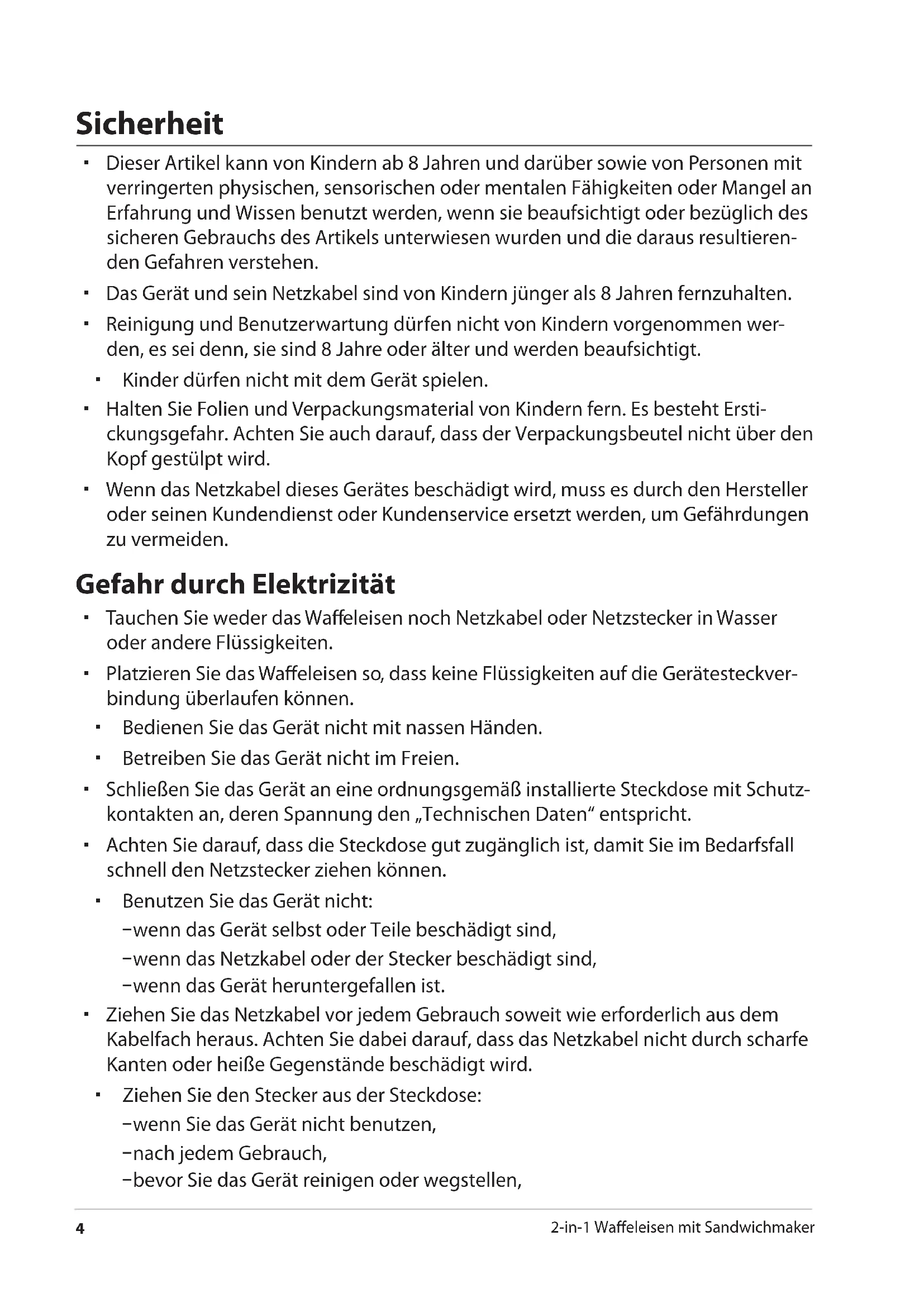 2-in-1 Waffeleisen mit Sandwichmaker Sicherheit Dieser Artikel kann von Kindern ab 8 Jahren und darüber sowie von Personen mit verringerten physischen, sensorischen oder mentalen Fähigkeiten oder Mangel an Erfahrung und Wissen benutzt werden, wenn sie beaufsichtigt oder bezüglich des sicheren Gebrauchs des Artikels unterwiesen wurden und die daraus resultieren- den Gefahren verstehen. Das Gerät und sein Netzkabel sind von Kindern jünger als 8 Jahren fernzuhalten. Reinigung und Benutzerwartung dürfen nicht von Kindern vorgenommen wer- den, es sei denn, sie sind 8 Jahre oder älter und werden beaufsichtigt. Kinder dürfen nicht mit dem Gerät spielen. Halten Sie Folien und Verpackungsmaterial von Kindern fern. Es besteht Ersti- ckungsgefahr. Achten Sie auch darauf, dass der Verpackungsbeutel nicht über den Kopf gestülpt wird. Wenn das Netzkabel dieses Gerätes beschädigt wird, muss es durch den Hersteller oder seinen Kundendienst oder Kundenservice ersetzt werden, um Gefährdungen zu vermeiden. Gefahr durch Elektrizität Tauchen Sie weder das Waffeleisen noch Netzkabel oder Netzstecker in Wasser oder andere Flüssigkeiten. Platzieren Sie das Waffeleisen so, dass keine Flüssigkeiten auf die Gerätesteckver- bindung überlaufen können. Bedienen Sie das Gerät nicht mit nassen Händen. Betreiben Sie das Gerät nicht im Freien. Schließen Sie das Gerät an eine ordnungsgemäß installierte Steckdose mit Schutz- kontakten an, deren Spannung den „Technischen Daten“ entspricht. Achten Sie darauf, dass die Steckdose gut zugänglich ist, damit Sie im Bedarfsfall schnell den Netzstecker ziehen können. Benutzen Sie das Gerät nicht: − wenn das Gerät selbst oder Teile beschädigt sind, − wenn das Netzkabel oder der Stecker beschädigt sind, − wenn das Gerät heruntergefallen ist. Ziehen Sie das Netzkabel vor jedem Gebrauch soweit wie erforderlich aus dem Kabelfach heraus. Achten Sie dabei darauf, dass das Netzkabel nicht durch scharfe Kanten oder heiße Gegenstände beschädigt wird. Ziehen Sie den Stecker aus der Steckdose: − wenn Sie das Gerät nicht benutzen, − nach jedem Gebrauch, − bevor Sie das Gerät reinigen oder wegstellen,Sicherheit