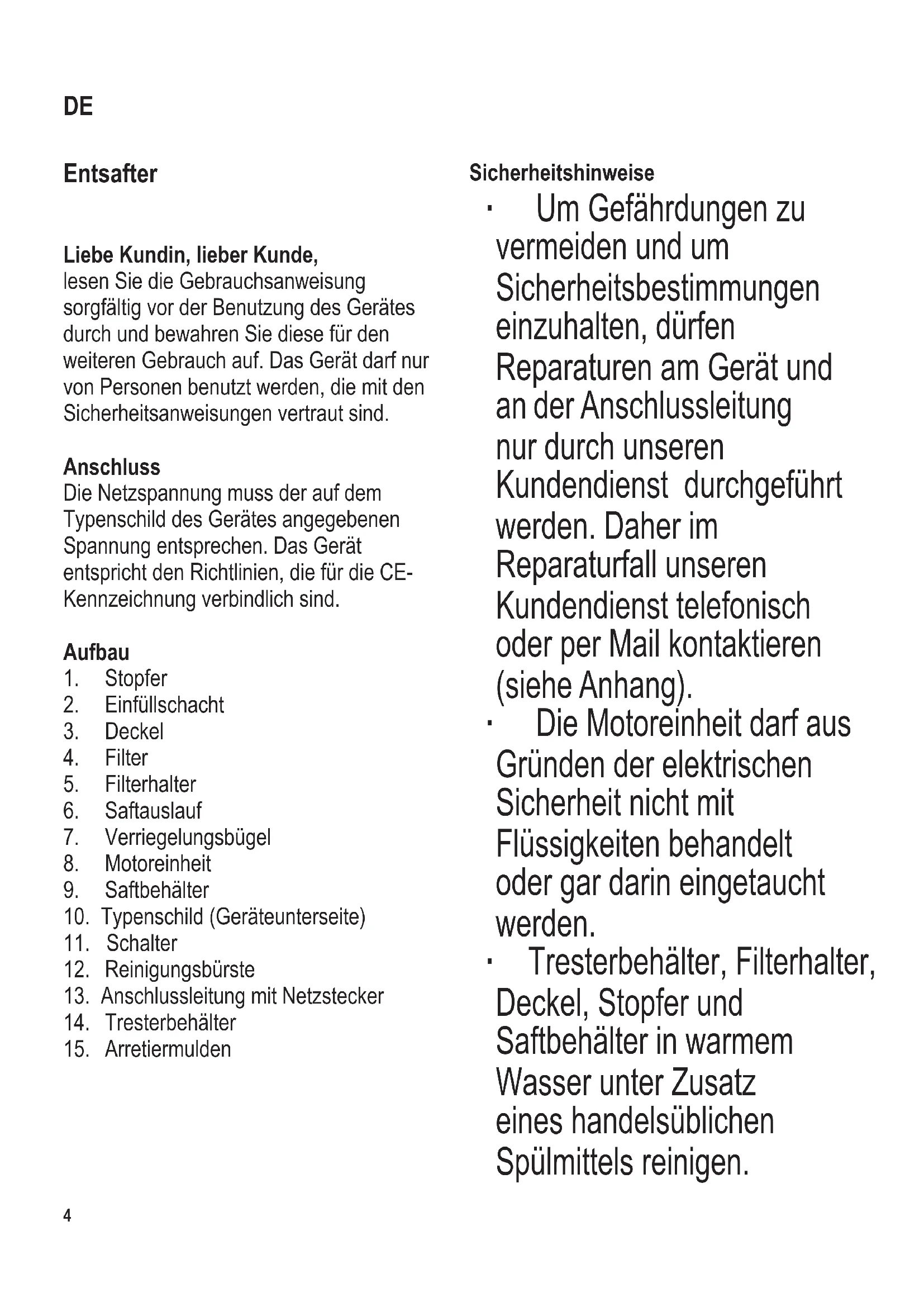 Sicherheitshinweise ∙ Um Gefährdungen zu vermeiden und um Sicherheitsbestimmungen einzuhalten, dürfen Reparaturen am Gerät und an der Anschlussleitung nur durch unseren Kundendienst durchgeführt werden. Daher im Reparaturfall unseren Kundendienst telefonisch oder per Mail kontaktieren (siehe Anhang). ∙ Die Motoreinheit darf aus Gründen der elektrischen Sicherheit nicht mit Flüssigkeiten behandelt oder gar darin eingetaucht werden. ∙ Tresterbehälter, Filterhalter, Deckel, Stopfer und Saftbehälter in warmem Wasser unter Zusatz eines handelsüblichen Spülmittels reinigen. DE104 x 142 mm