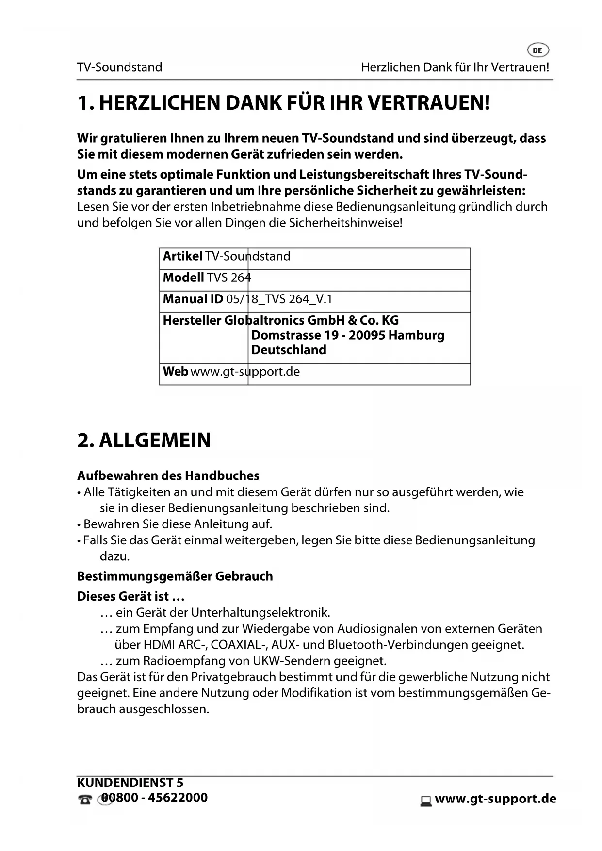 - Falls Sie das Gerät einmal weitergeben, legen Sie bitte diese Bedienungsanleitung dazu. Bestimmungsgemäßer Gebrauch Dieses Gerät ist … … ein Gerät der Unterhaltungselektronik. … zum Empfang und zur Wiedergabe von Audiosignalen von externen Geräten über HDMI ARC-, COAXIAL-, AUX- und Bluetooth-Verbindungen geeignet. … zum Radioempfang von UKW-Sendern geeignet. Das Gerät ist für den Privatgebrauch bestimmt und für die gewerbliche Nutzung nicht geeignet. Eine andere Nutzung oder Modifikation ist vom bestimmungsgemäßen Ge- brauch ausgeschlossen. Artikel TV-Soundstand Modell TVS 264 Manual ID 05/18_TVS 264_V.1 Hersteller Globaltronics GmbH & Co. KG Domstrasse 19 - 20095 Hamburg Deutschland Web www.gt-support.de _TVS264_2018_Soundstand_AudioAffairs.book Seite 5 Donnerstag, 30. August 2018 9:17 09Allgemein TV-Soundstand