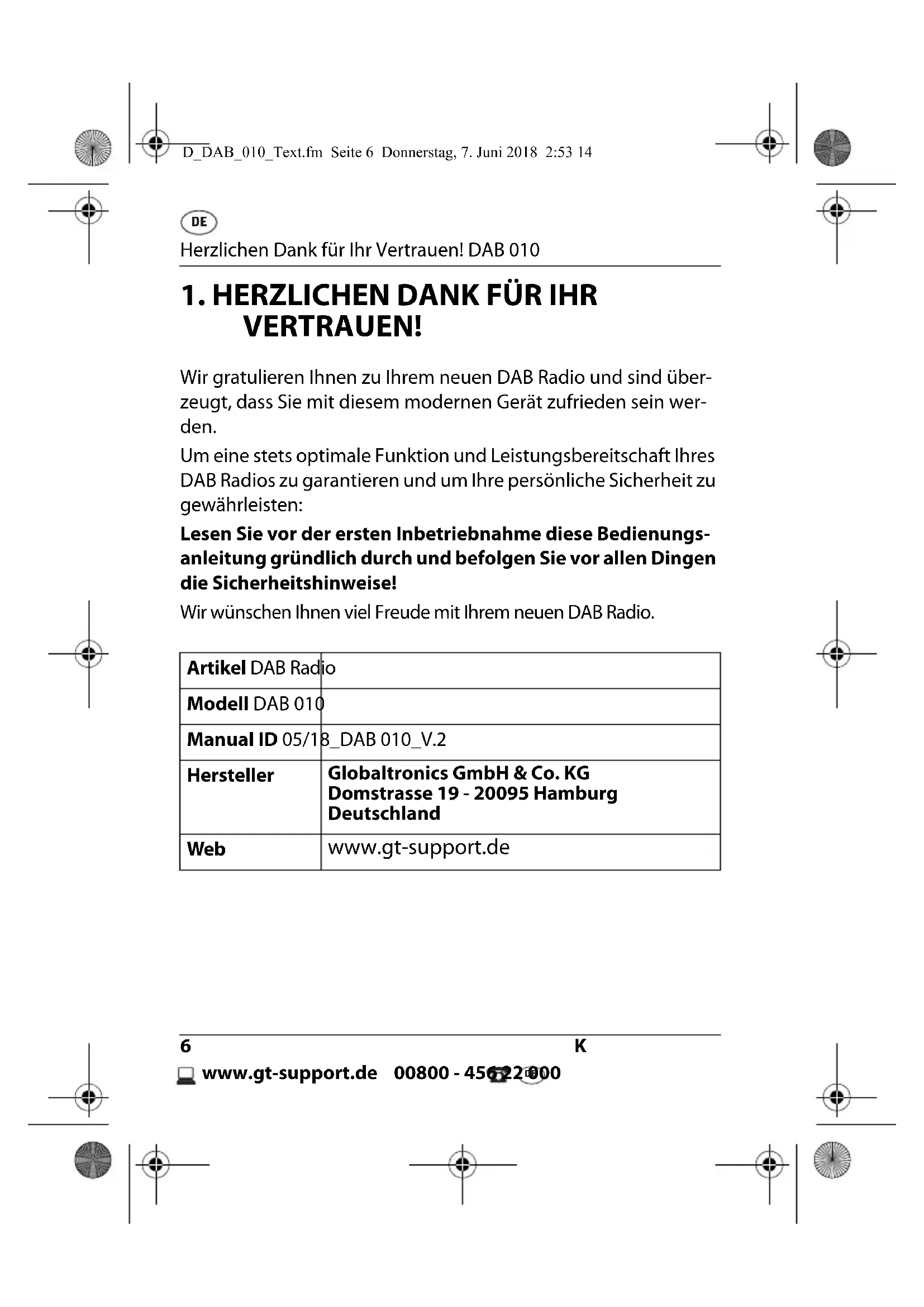 VERTRAUEN! Wir gratulieren Ihnen zu Ihrem neuen DAB Radio und sind über- zeugt, dass Sie mit diesem modernen Gerät zufrieden sein wer- den. Um eine stets optimale Funktion und Leistungsbereitschaft Ihres DAB Radios zu garantieren und um Ihre persönliche Sicherheit zu gewährleisten: Lesen Sie vor der ersten Inbetriebnahme diese Bedienungs- anleitung gründlich durch und befolgen Sie vor allen Dingen die Sicherheitshinweise! Wir wünschen Ihnen viel Freude mit Ihrem neuen DAB Radio. Artikel DAB Radio Modell DAB 010 Manual ID 05/18_DAB 010_V.2 Hersteller Globaltronics GmbH & Co. KG Domstrasse 19 - 20095 Hamburg Deutschland Web www.gt-support.de D_DAB_010_Text.fm Seite 6 Donnerstag, 7. Juni 2018 2:53 14KUNDENDIENST 7 Allgemein