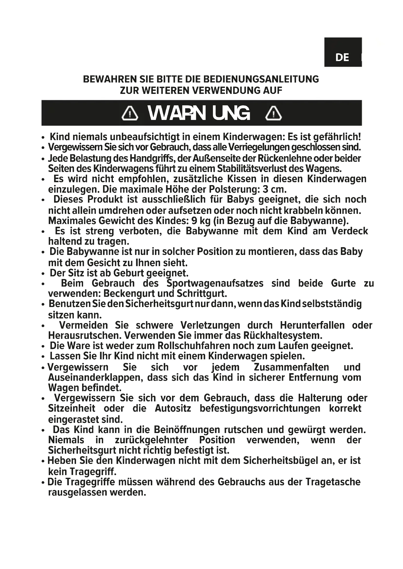 - Der Kinderwagen darf nur benutzt werden, wenn alle Bauteile intakt sind.