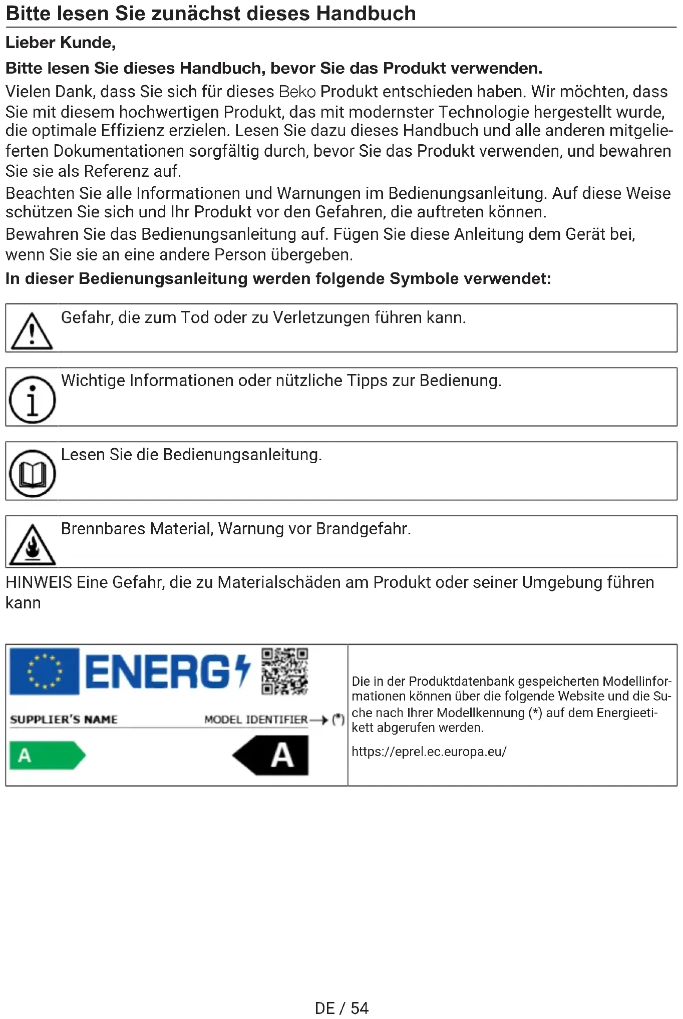AVERTISSEMENT [}52]DE / 54 Bitte lesen Sie zunächst dieses Handbuch Lieber Kunde, Bitte lesen Sie dieses Handbuch, bevor Sie das Produkt verwenden. Vielen Dank, dass Sie sich für dieses Beko Produkt entschieden haben. Wir möchten, dass Sie mit diesem hochwertigen Produkt, das mit modernster Technologie hergestellt wurde, die optimale Effizienz erzielen. Lesen Sie dazu dieses Handbuch und alle anderen mitgelie- ferten Dokumentationen sorgfältig durch, bevor Sie das Produkt verwenden, und bewahren Sie sie als Referenz auf. Beachten Sie alle Informationen und Warnungen im Bedienungsanleitung. Auf diese Weise schützen Sie sich und Ihr Produkt vor den Gefahren, die auftreten können. Bewahren Sie das Bedienungsanleitung auf. Fügen Sie diese Anleitung dem Gerät bei, wenn Sie sie an eine andere Person übergeben. In dieser Bedienungsanleitung werden folgende Symbole verwendet: Gefahr, die zum Tod oder zu Verletzungen führen kann. Wichtige Informationen oder nützliche Tipps zur Bedienung. Lesen Sie die Bedienungsanleitung. Brennbares Material, Warnung vor Brandgefahr. HINWEIS Eine Gefahr, die zu Materialschäden am Produkt oder seiner Umgebung führen kann Die in der Produktdatenbank gespeicherten Modellinfor- mationen können über die folgende Website und die Su- che nach Ihrer Modellkennung (*) auf dem Energieeti- kett abgerufen werden. https://eprel.ec.europa.eu/DE / 55 1 Sicherheitshinweise ..................... 56