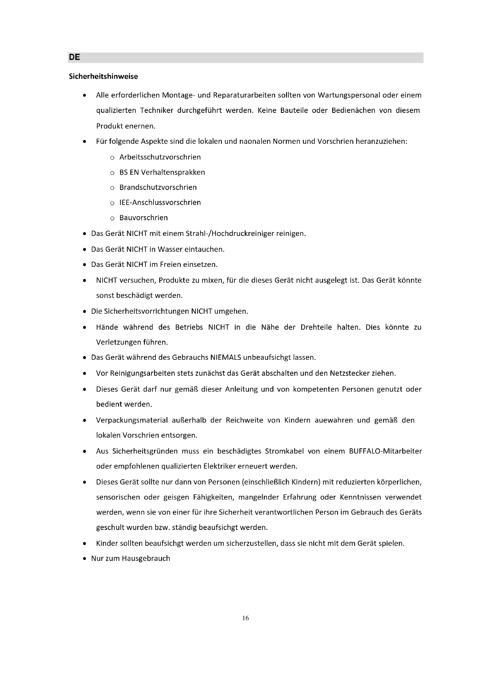 - Erdleiter (grün/gelb) an Klemme E Das Gerät muss über eine spezielle Erdleitung geerdet werden. Bei Fragen wenden Sie sich bitte an einen qualifizierten Elektriker. Elektroisolierpunkte dürfen nicht blockiert werden. Bei einem erforderlichen Notstopp müssen diese Punkte jederzeit sofort zugänglich sein. Konformität Das WEEE-Logo an diesem Produkt oder in der Dokumentation deutet darauf hin, dass das Produkt nicht im normalen Haushaltsmüll entsorgt werden darf. Um mögliche Gesundheits- bzw. Umweltschäden zu vermeiden, muss das Produkt durch einen zugelassenen und umweltverträglichen Recycling-Prozess entsorgt werden. Für weitere Informationen zur korrekten Entsorgung dieses Produkts wenden Sie sich bitte an den Lieferanten oder die für Müllentsorgung zuständige Behörde in Ihrer Nähe. Alle BUFFALO-Produkte werden strengen Tests unterzogen, um die Einhaltung von Normen und Spezifikationen internationaler und nationaler Behörden und unabhängiger Organisationen zu gewährleisten. BUFFALO-Produkte dürfen durch folgendes Symbol gekennzeichnet werden:23 Telefonische Helpline: 0800 – 1860806 (Deutschland) Alle Rechte vorbehalten. Diese Anleitung darf ohne vorherige schriftliche Erlaubnis von BUFFALO weder ganz noch auszugsweise in irgendeiner Form und auf irgendeinem Wege – ob elektronisch, mechanisch, durch Fotokopieren oder anderweitig – vervielfältigt oder übertragen werden. Es werden alle Anstrengungen unternommen um sicherzustellen, dass alle Angaben bei Drucklegung korrekt sind. BUFFALO behält sich jedoch das Recht vor, Spezifikationen ohne Vorankündigung zu ändern.24