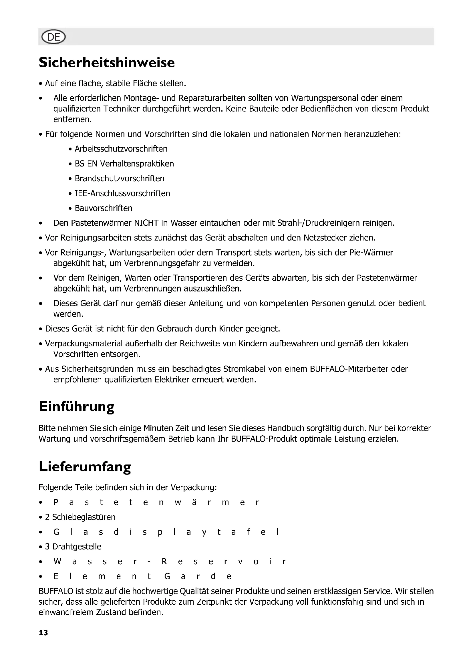 - Erdleiter (grün/gelb) an Klemme E Das Gerät muss über eine spezielle Erdleitung geerdet werden. Bei Fragen wenden Sie sich bitte an einen qualifizierten Elektriker. Elektroisolierpunkte dürfen nicht blockiert werden. Bei einem Notstopp müssen diese Punkte jederzeit sofort zugänglich sein. Konformität Das WEEE-Logo an diesem Produkt oder in der Dokumentation weist darauf hin, dass das Produkt nicht mit dem normalen Hausmüll entsorgt werden darf. Um potenziellen Gesundheits- bzw. Umweltschäden vorzubeugen, muss das Produkt durch einen zuge- lassenen und umweltverträglichen Recyclingprozess entsorgt werden. Ausführliche Informationen zur korrekten Entsorgung dieses Produkts erhalten Sie von Ihrem Produktlieferanten oder der für die Müllentsorgung in Ihrer Region zuständige Behörde. Alle BUFFALO-Produkte werden strengen Tests unterzogen, um die Einhaltung von Normen und Spezifikationen internationaler und nationaler Behörden und unabhängiger Organisationen zu gewährleisten. BUFFALO-Produkte dürfen durch folgendes Symbol gekennzeichnet werden: Alle Rechte vorbehalten. Diese Anleitung darf ohne vorherige schriftliche Genehmigung von BUFFALO weder ganz noch teilweise in irgendeiner Form oder auf irgendeinem Wege - einschließlich elektronischer, mechanischer Verfahren, durch Fotokopieren, Aufnahme oder andere Verfahren - vervielfältigt oder übertragen werden. Es werden alle Anstrengungen unternommen um sicherzustellen, dass alle Angaben bei der Drucklegung korrekt sind. BUFFALO behält sich jedoch das Recht vor, Spezifikationen ohne Vorankündigung zu ändern. Modell Spannung LeistungStrom-stärkeAbmessungenh x b x t mmGewicht (kg) Max. Anzahl Pasteten Aufwärmzeit (auf 90°C) Betriebstemperaturbereich GF454 230 50Hz 350W 1.52A 500 x 595 x