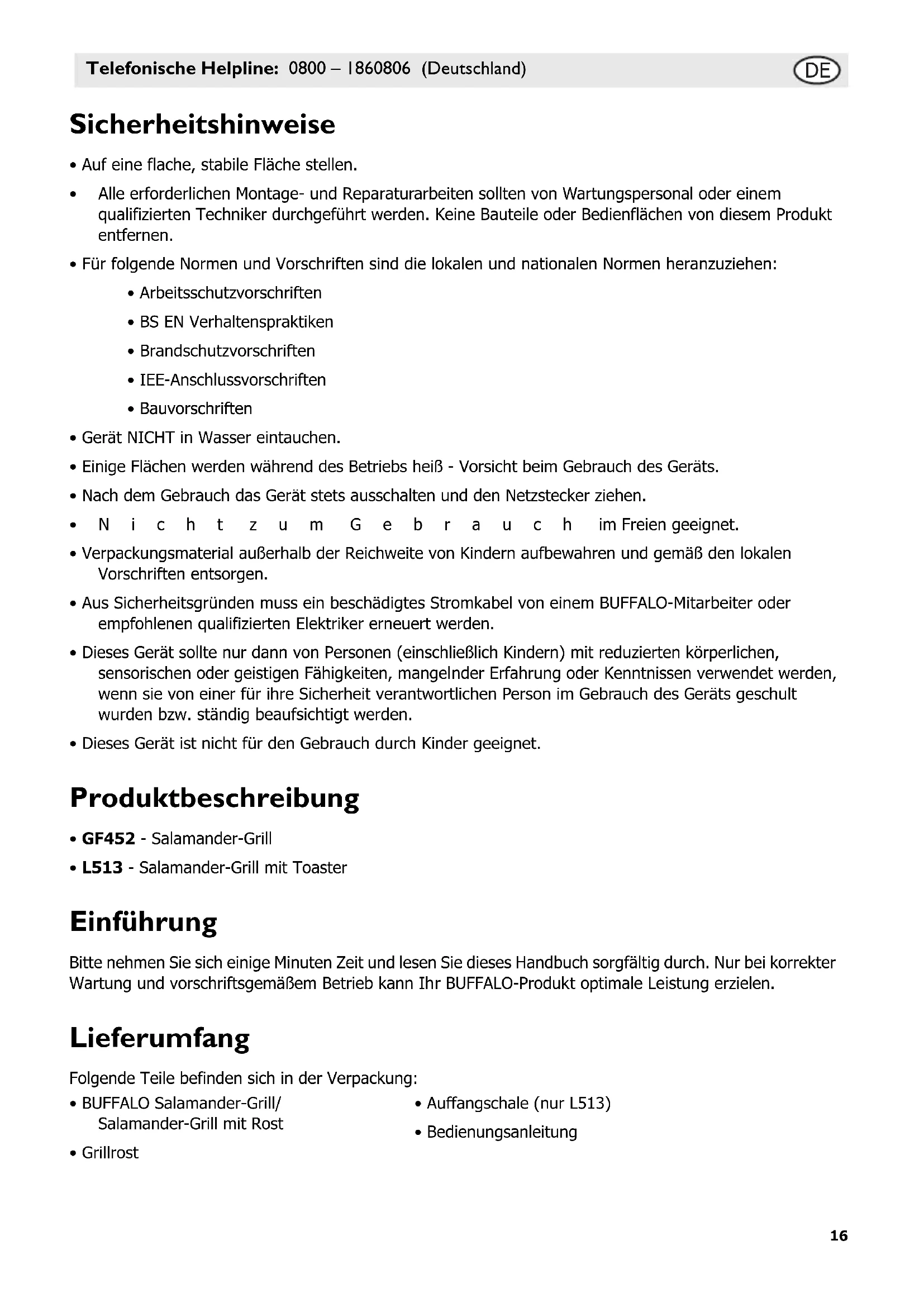 - L513 - Salamander-Grill mit Toaster Einführung Bitte nehmen Sie sich einige Minuten Zeit und lesen Sie dieses Handbuch sorgfältig durch. Nur bei korrekter Wartung und vorschriftsgemäßem Betrieb kann Ihr BUFFALO-Produkt optimale Leistung erzielen. Lieferumfang Folgende Teile befinden sich in der Verpackung: