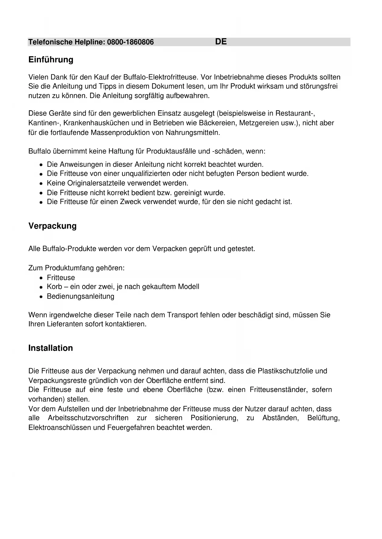Tous droits réservés. Il est interdit de reproduire ou transmettre tout ou partie de la présente notice sous quelque forme ou moyen, électronique ou mécanique que ce soit, y compris par la photocopie, l'enregistrement ou autre, sans l'autorisation écrite préalable de BUFFALO. Tous les efforts ont été faits pour que ces informations soient correctes au moment de l'impression, toutefois, BUFFALO se réserve le droit de modifier les spécifications sans avertissement préalable.Telefonische Helpline: 0800-1860806 DE Einführung Vielen Dank für den Kauf der Buffalo-Elektrofritteuse. Vor Inbetriebnahme dieses Produkts sollten Sie die Anleitung und Tipps in diesem Dokument lesen, um Ihr Produkt wirksam und störungsfrei nutzen zu können. Die Anleitung sorgfältig aufbewahren. Diese Geräte sind für den gewerblichen Einsatz ausgelegt (beispielsweise in Restaurant-, Kantinen-, Krankenhausküchen und in Betrieben wie Bäckereien, Metzgereien usw.), nicht aber für die fortlaufende Massenproduktion von Nahrungsmitteln. Buffalo übernimmt keine Haftung für Produktausfälle und -schäden, wenn: Die Anweisungen in dieser Anleitung nicht korrekt beachtet wurden. Die Fritteuse von einer unqualifizierten oder nicht befugten Person bedient wurde. Keine Originalersatzteile verwendet werden. Die Fritteuse nicht korrekt bedient bzw. gereinigt wurde. Die Fritteuse für einen Zweck verwendet wurde, für den sie nicht gedacht ist.
