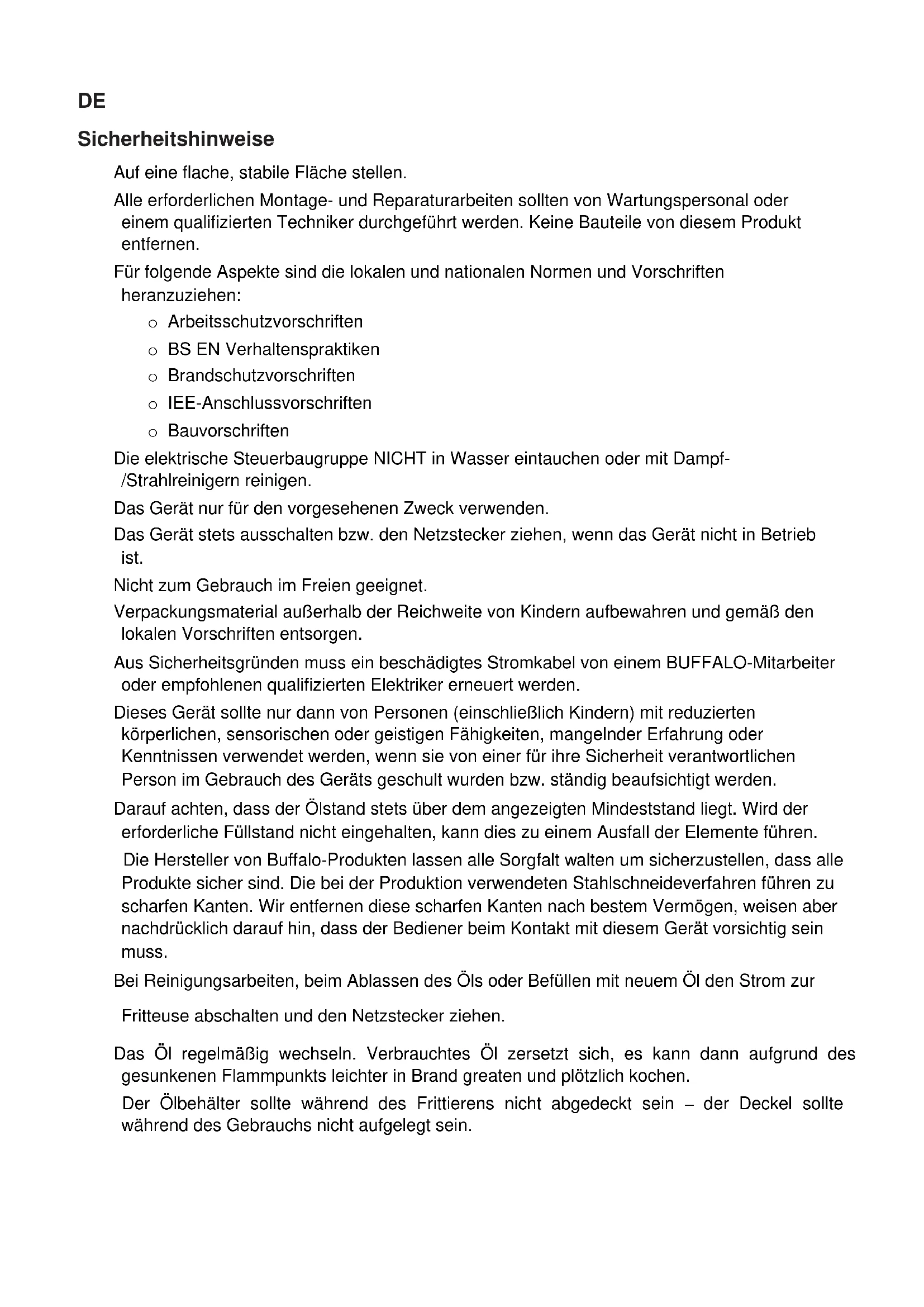 Tous droits réservés. Il est interdit de reproduire ou transmettre tout ou partie de la présente notice sous quelque forme ou moyen, électronique ou mécanique que ce soit, y compris par la photocopie, l'enregistrement ou autre, sans l'autorisation écrite préalable de BUFFALO. Tous les efforts ont été faits pour que ces informations soient correctes au moment de l'impression, toutefois, BUFFALO se réserve le droit de modifier les spécifications sans avertissement préalable.DE Sicherheitshinweise Auf eine flache, stabile Fläche stellen. Alle erforderlichen Montage- und Reparaturarbeiten sollten von Wartungspersonal oder einem qualifizierten Techniker durchgeführt werden. Keine Bauteile von diesem Produkt entfernen. Für folgende Aspekte sind die lokalen und nationalen Normen und Vorschriften heranzuziehen: o Arbeitsschutzvorschriften o BS EN Verhaltenspraktiken o Brandschutzvorschriften o IEE-Anschlussvorschriften o Bauvorschriften Die elektrische Steuerbaugruppe NICHT in Wasser eintauchen oder mit Dampf- /Strahlreinigern reinigen. Das Gerät nur für den vorgesehenen Zweck verwenden. Das Gerät stets ausschalten bzw. den Netzstecker ziehen, wenn das Gerät nicht in Betrieb ist. Nicht zum Gebrauch im Freien geeignet. Verpackungsmaterial außerhalb der Reichweite von Kindern aufbewahren und gemäß den lokalen Vorschriften entsorgen. Aus Sicherheitsgründen muss ein beschädigtes Stromkabel von einem BUFFALO-Mitarbeiter oder empfohlenen qualifizierten Elektriker erneuert werden. Dieses Gerät sollte nur dann von Personen (einschließlich Kindern) mit reduzierten körperlichen, sensorischen oder geistigen Fähigkeiten, mangelnder Erfahrung oder Kenntnissen verwendet werden, wenn sie von einer für ihre Sicherheit verantwortlichen Person im Gebrauch des Geräts geschult wurden bzw. ständig beaufsichtigt werden. Darauf achten, dass der Ölstand stets über dem angezeigten Mindeststand liegt. Wird der erforderliche Füllstand nicht eingehalten, kann dies zu einem Ausfall der Elemente führen. Die Hersteller von Buffalo-Produkten lassen alle Sorgfalt walten um sicherzustellen, dass alle Produkte sicher sind. Die bei der Produktion verwendeten Stahlschneideverfahren führen zu scharfen Kanten. Wir entfernen diese scharfen Kanten nach bestem Vermögen, weisen aber nachdrücklich darauf hin, dass der Bediener beim Kontakt mit diesem Gerät vorsichtig sein muss. Bei Reinigungsarbeiten, beim Ablassen des Öls oder Befüllen mit neuem Öl den Strom zur Fritteuse abschalten und den Netzstecker ziehen. Das Öl regelmäßig wechseln. Verbrauchtes Öl zersetzt sich, es kann dann aufgrund des gesunkenen Flammpunkts leichter in Brand greaten und plötzlich kochen. Der Ölbehälter sollte während des Frittierens nicht abgedeckt sein – der Deckel sollte während des Gebrauchs nicht aufgelegt sein.Telefonische Helpline: 0800-1860806 DE Einführung Vielen Dank für den Kauf der Buffalo-Elektrofritteuse. Vor Inbetriebnahme dieses Produkts sollten Sie die Anleitung und Tipps in diesem Dokument lesen, um Ihr Produkt wirksam und störungsfrei nutzen zu können. Die Anleitung sorgfältig aufbewahren. Diese Geräte sind für den gewerblichen Einsatz ausgelegt (beispielsweise in Restaurant-, Kantinen-, Krankenhausküchen und in Betrieben wie Bäckereien, Metzgereien usw.), nicht aber für die fortlaufende Massenproduktion von Nahrungsmitteln. Buffalo übernimmt keine Haftung für Produktausfälle und -schäden, wenn: Die Anweisungen in dieser Anleitung nicht korrekt beachtet wurden. Die Fritteuse von einer unqualifizierten oder nicht befugten Person bedient wurde. Keine Originalersatzteile verwendet werden. Die Fritteuse nicht korrekt bedient bzw. gereinigt wurde. Die Fritteuse für einen Zweck verwendet wurde, für den sie nicht gedacht ist.
