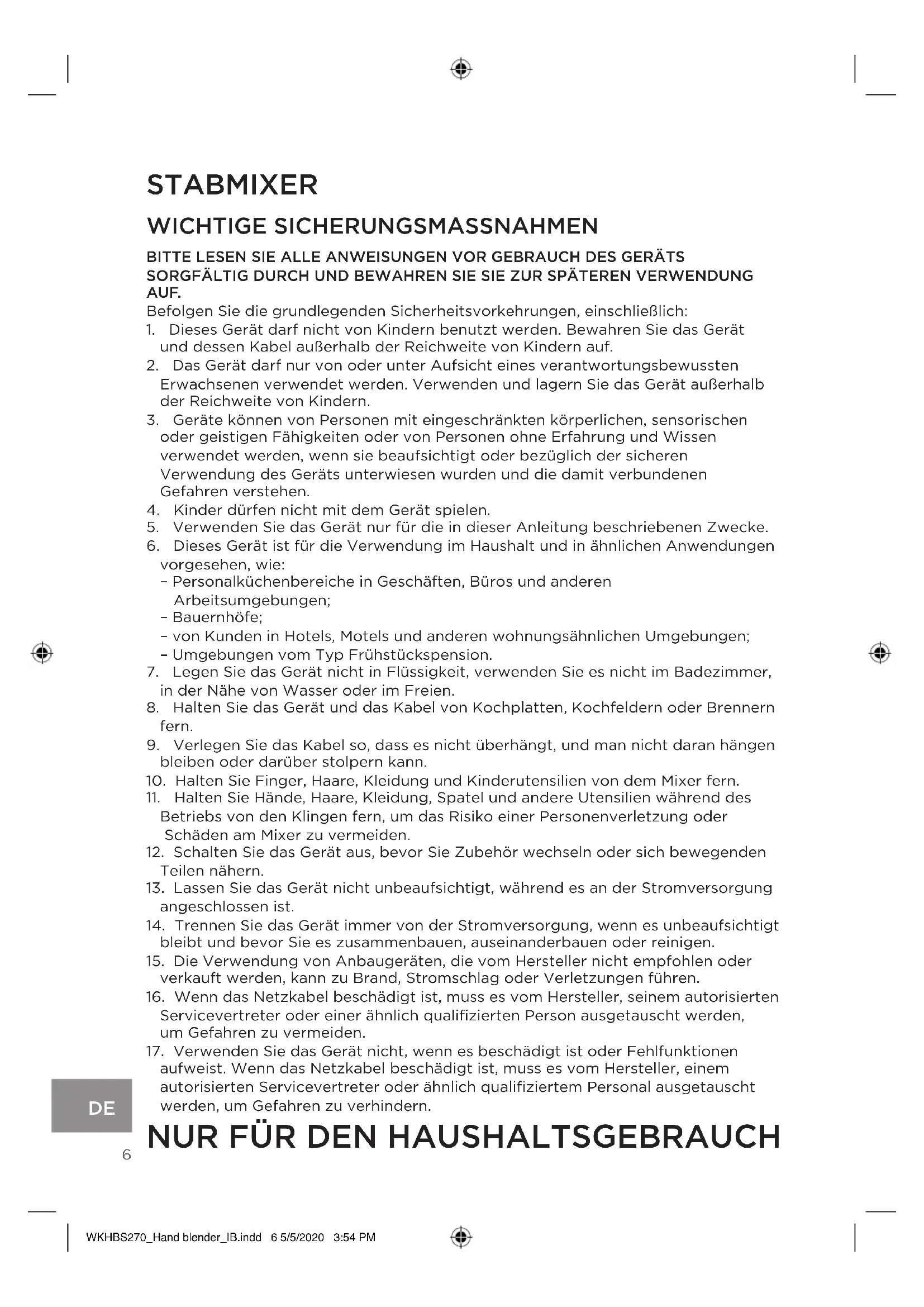 - FÜR KINDER UNZUGÄNGLICH AUFBEWAHREN. ENTSORGUNG Diese Kennzeichnung weist darauf hin, dass dieses Produkt in der gesamten EU nicht zusammen mit anderen Haushaltsabfällen entsorgt werden sollte. Damit mögliche Schäden für die Umwelt oder die menschliche Gesundheit durch unkontrollierte Abfallentsorgung vermieden werden können, recyceln Sie das Gerät verantwortungsvoll, um die nachhaltige Wiederverwendung materieller Ressourcen zu fördern. Um Ihr Gebrauchtgerät zurückzugeben, benutzen Sie bitte die Rückgabe- und Sammelsysteme oder wenden Sie sich an den Händler, bei dem das Produkt gekauft wurde. Dort kann das Produkt dem umweltfreundlichen Recycling zugeführt werden. WKHBS270_Hand blender_IB.indd 8 5/5/2020 3:54 PM9