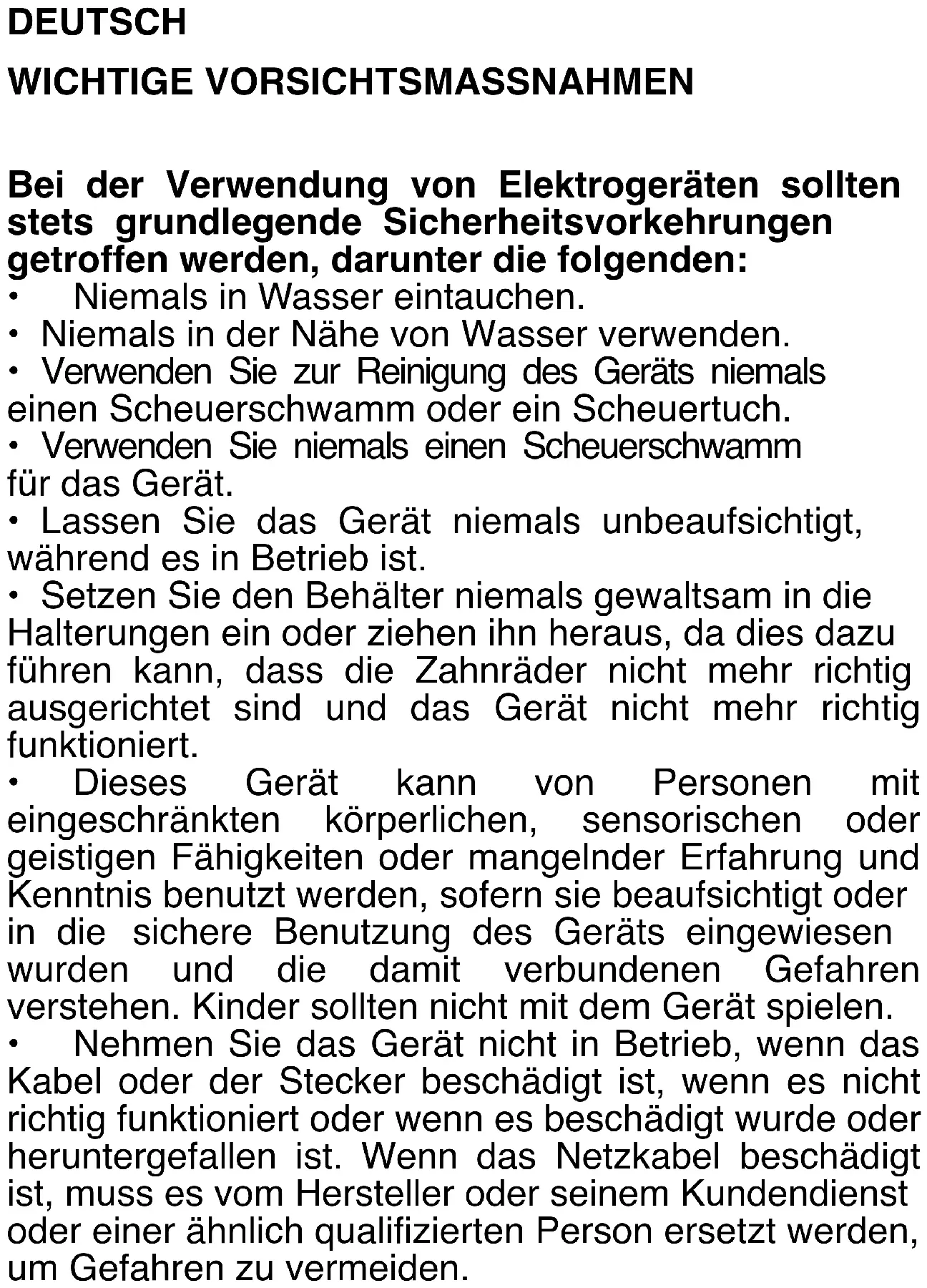 - Dieses Gerät kann von Personen mit eingeschränkten körperlichen, sensorischen oder geistigen Fähigkeiten oder mangelnder Erfahrung und Kenntnis benutzt werden, sofern sie beaufsichtigt oder in die sichere Benutzung des Geräts eingewiesen wurden und die damit verbundenen Gefahren verstehen. Kinder sollten nicht mit dem Gerät spielen.