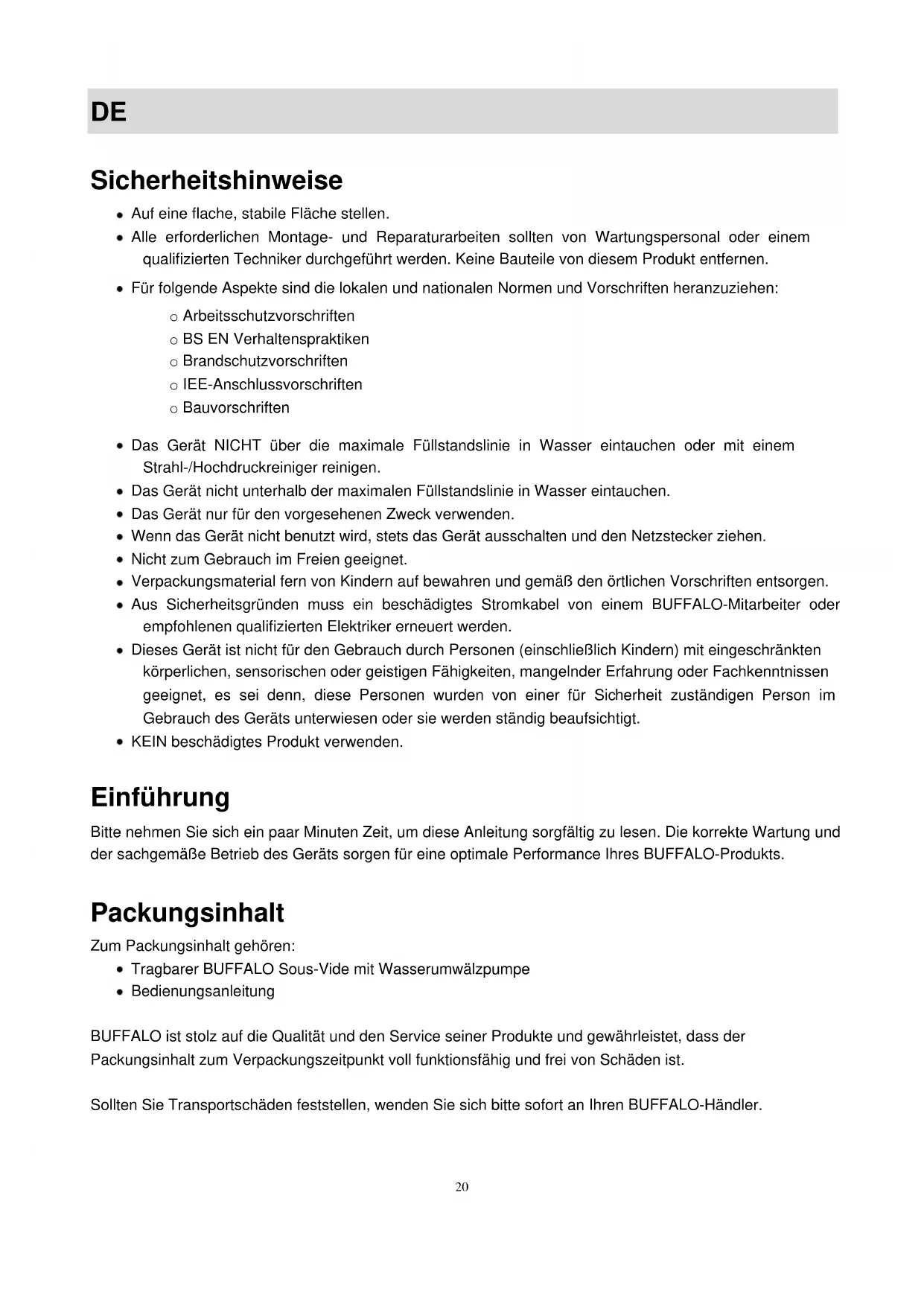 Sicherheitshinweise Auf eine flache, stabile Fläche stellen. Alle erforderlichen Montage- und Reparaturarbeiten sollten von Wartungspersonal oder einem qualifizierten Techniker durchgeführt werden. Keine Bauteile von diesem Produkt entfernen. Für folgende Aspekte sind die lokalen und nationalen Normen und Vorschriften heranzuziehen: o Arbeitsschutzvorschriften o BS EN Verhaltenspraktiken o Brandschutzvorschriften o IEE-Anschlussvorschriften o Bauvorschriften Das Gerät NICHT über die maximale Füllstandslinie in Wasser eintauchen oder mit einem Strahl-/Hochdruckreiniger reinigen. Das Gerät nicht unterhalb der maximalen Füllstandslinie in Wasser eintauchen. Das Gerät nur für den vorgesehenen Zweck verwenden. Wenn das Gerät nicht benutzt wird, stets das Gerät ausschalten und den Netzstecker ziehen. Nicht zum Gebrauch im Freien geeignet. Verpackungsmaterial fern von Kindern auf bewahren und gemäß den örtlichen Vorschriften entsorgen. Aus Sicherheitsgründen muss ein beschädigtes Stromkabel von einem BUFFALO-Mitarbeiter oder empfohlenen qualifizierten Elektriker erneuert werden. Dieses Gerät ist nicht für den Gebrauch durch Personen (einschließlich Kindern) mit eingeschränkten körperlichen, sensorischen oder geistigen Fähigkeiten, mangelnder Erfahrung oder Fachkenntnissen geeignet, es sei denn, diese Personen wurden von einer für Sicherheit zuständigen Person im Gebrauch des Geräts unterwiesen oder sie werden ständig beaufsichtigt. KEIN beschädigtes Produkt verwenden. Einführung Bitte nehmen Sie sich ein paar Minuten Zeit, um diese Anleitung sorgfältig zu lesen. Die korrekte Wartung und der sachgemäße Betrieb des Geräts sorgen für eine optimale Performance Ihres BUFFALO-Produkts. Packungsinhalt Zum Packungsinhalt gehören: Tragbarer BUFFALO Sous-Vide mit Wasserumwälzpumpe Bedienungsanleitung BUFFALO ist stolz auf die Qualität und den Service seiner Produkte und gewährleistet, dass der Packungsinhalt zum Verpackungszeitpunkt voll funktionsfähig und frei von Schäden ist. Sollten Sie Transportschäden feststellen, wenden Sie sich bitte sofort an Ihren BUFFALO-Händler.21 Telefonische Helpline: 0800 – 1860806 (Deutschland) DE Funktion LCD-Display
