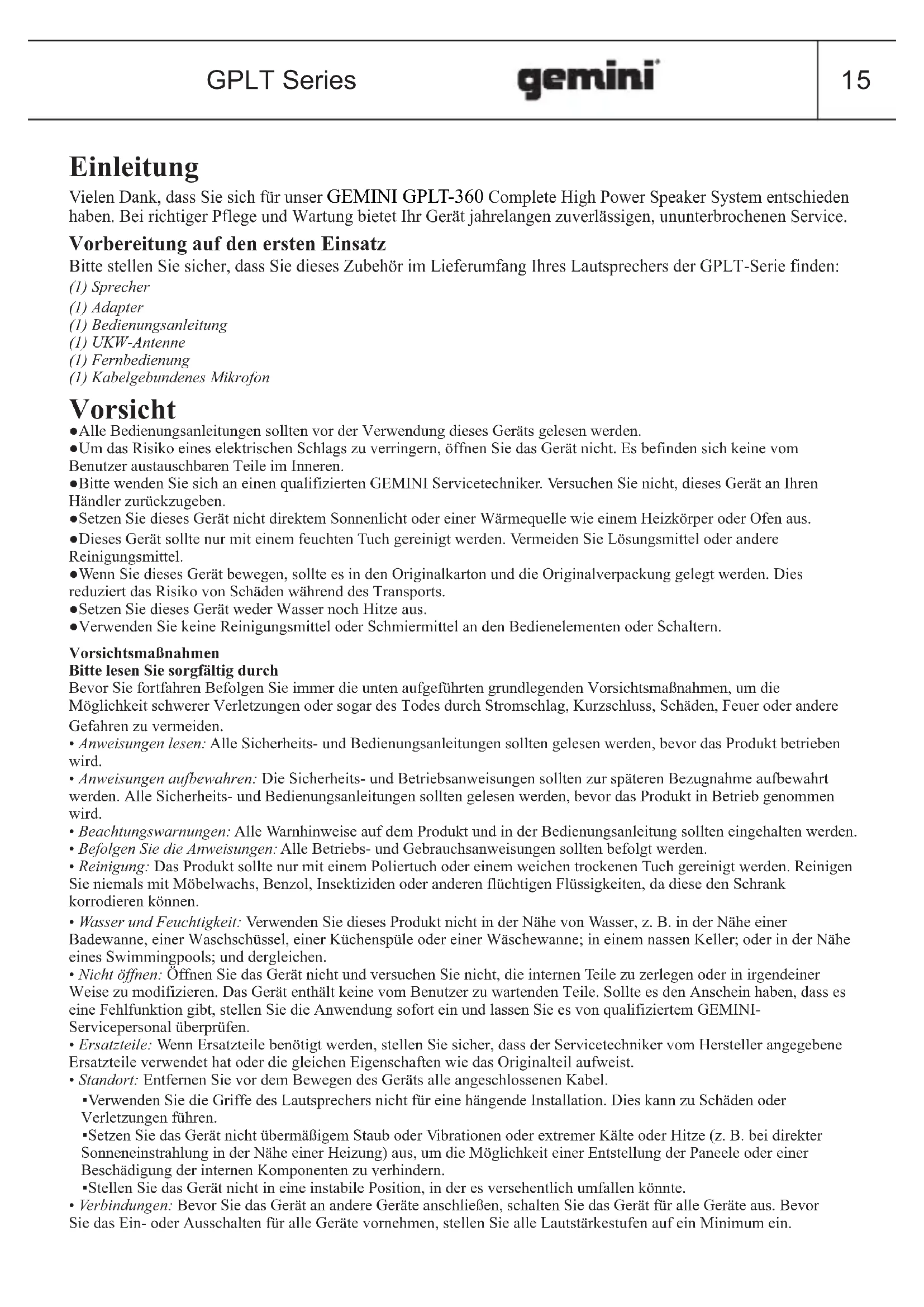 Einleitung Vielen Dank, dass Sie sich für unser Complete High Power Speaker System entschieden GEMINI GPLT-360 haben. Bei richtiger Pflege und Wartung bietet Ihr Gerät jahrelangen zuverlässigen, ununterbrochenen Service. Vorbereitung auf den ersten Einsatz Bitte stellen Sie sicher, dass Sie dieses Zubehör im Lieferumfang Ihres Lautsprechers der GPLT-Serie finden: (1) Sprecher(1) Adapter(1) Bedienungsanleitung(1) UKW-Antenne(1) Fernbedienung(1) Kabelgebundenes Mikrofon Vorsicht ●Alle Bedienungsanleitungen sollten vor der Verwendung dieses Geräts gelesen werden. ●Um das Risiko eines elektrischen Schlags zu verringern, öffnen Sie das Gerät nicht. Es befinden sich keine vom Benutzer austauschbaren Teile im Inneren. ●Bitte wenden Sie sich an einen qualifizierten GEMINI Servicetechniker. Versuchen Sie nicht, dieses Gerät an Ihren Händler zurückzugeben. ●Setzen Sie dieses Gerät nicht direktem Sonnenlicht oder einer Wärmequelle wie einem Heizkörper oder Ofen aus. ●Dieses Gerät sollte nur mit einem feuchten Tuch gereinigt werden. Vermeiden Sie Lösungsmittel oder andere Reinigungsmittel. ●Wenn Sie dieses Gerät bewegen, sollte es in den Originalkarton und die Originalverpackung gelegt werden. Dies reduziert das Risiko von Schäden während des Transports.●Setzen Sie dieses Gerät weder Wasser noch Hitze aus.●Verwenden Sie keine Reinigungsmittel oder Schmiermittel an den Bedienelementen oder Schaltern.VorsichtsmaßnahmenBitte lesen Sie sorgfältig durchBevor Sie fortfahren Befolgen Sie immer die unten aufgeführten grundlegenden Vorsichtsmaßnahmen, um die Möglichkeit schwerer Verletzungen oder sogar des Todes durch Stromschlag, Kurzschluss, Schäden, Feuer oder andere Gefahren zu vermeiden.